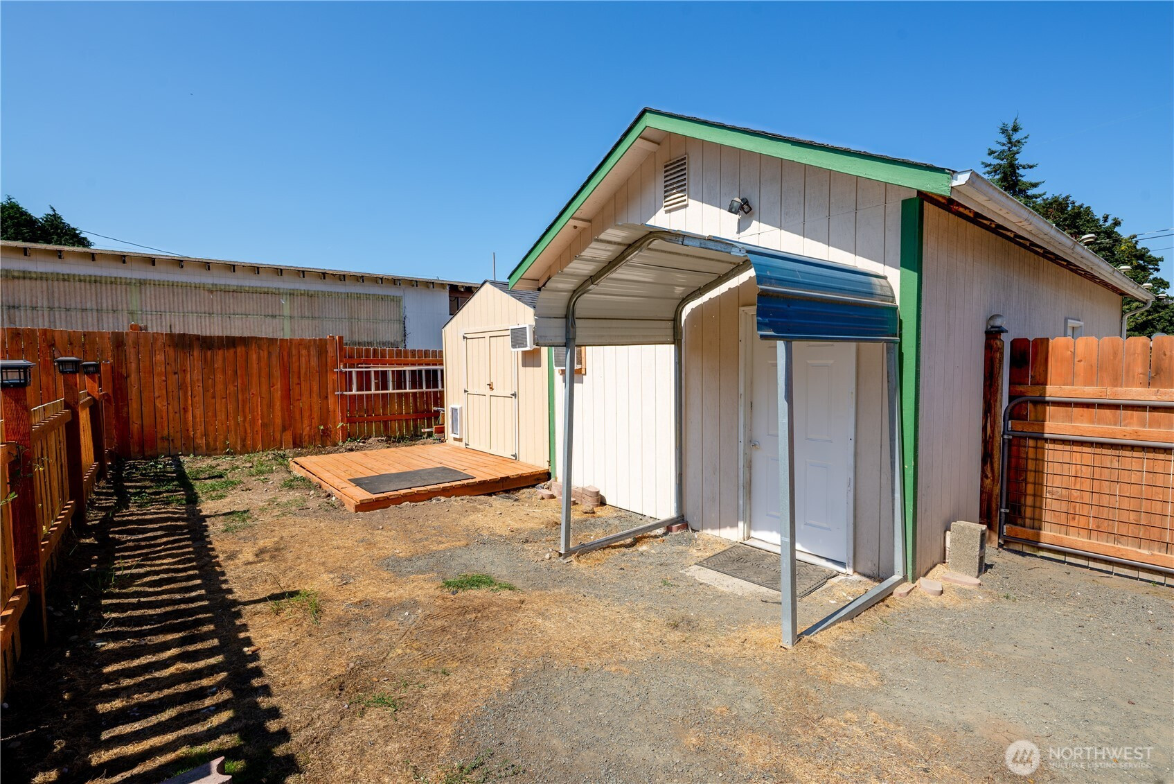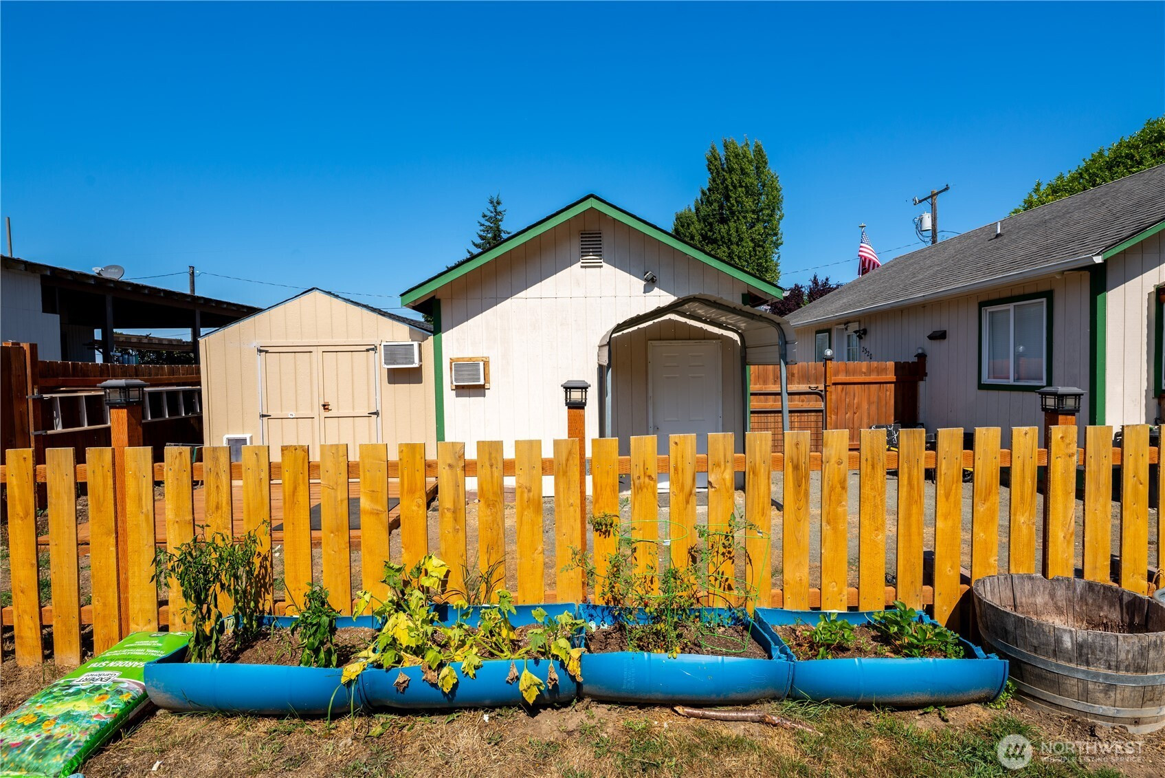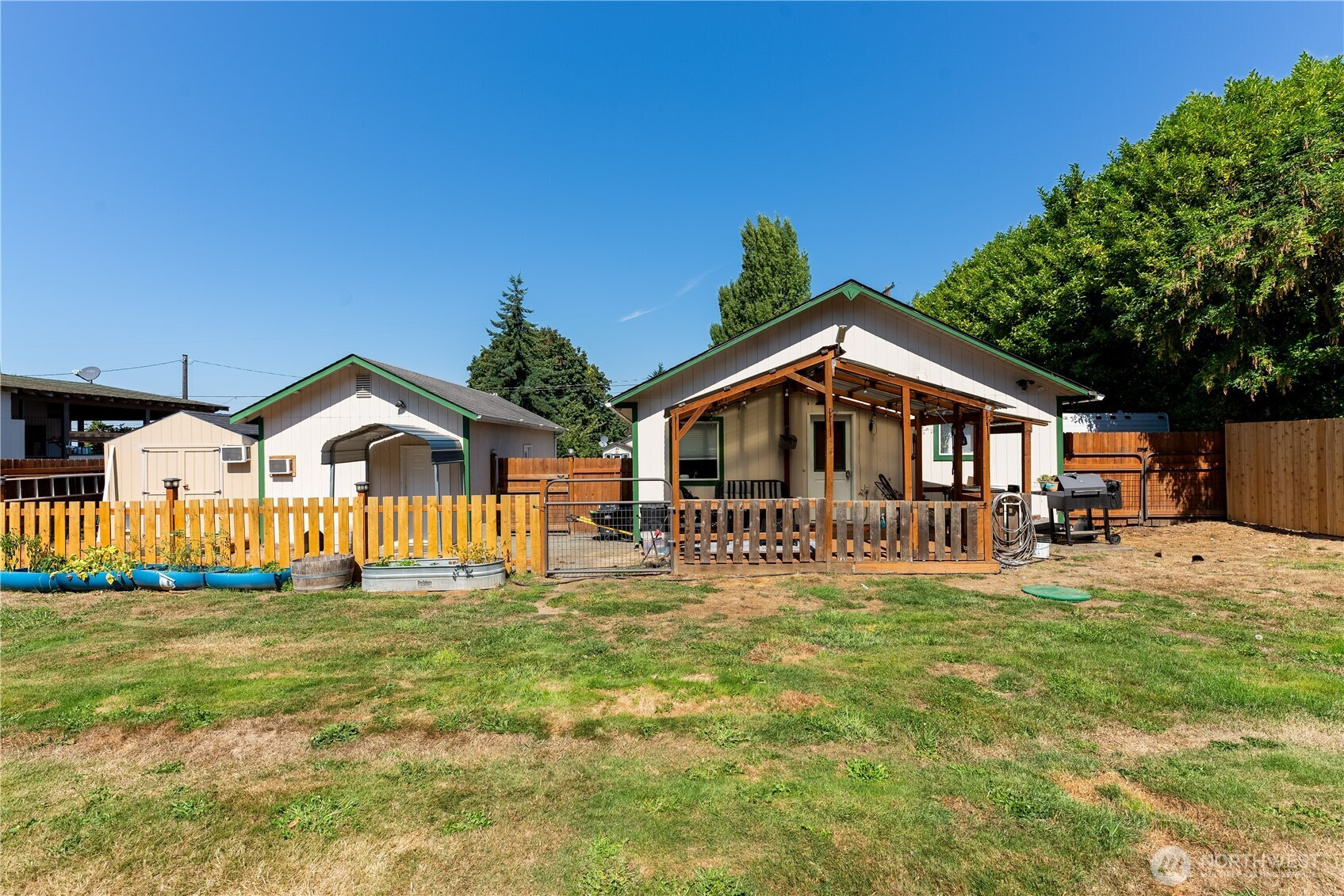 This inviting home offers a well-designed layout featuring a kitchen with a gas stovetop, a pass-through window to the living room, and an adjacent dining area filled with natural light. The cozy living room includes a free-standing stove, perfect for chilly evenings. Bathroom has a generous storage closet, providing convenient extra space. Step outside to enjoy a fully fenced backyard, mountain views, a covered back patio with a gas-plumbed BBQ, and plenty of room to entertain or relax. Two finished outbuildings with power and A/C units offer excellent options for home offices, studios, or home gym. Additional features include a garage, off-street parking, and a location that combines comfort & functionality.