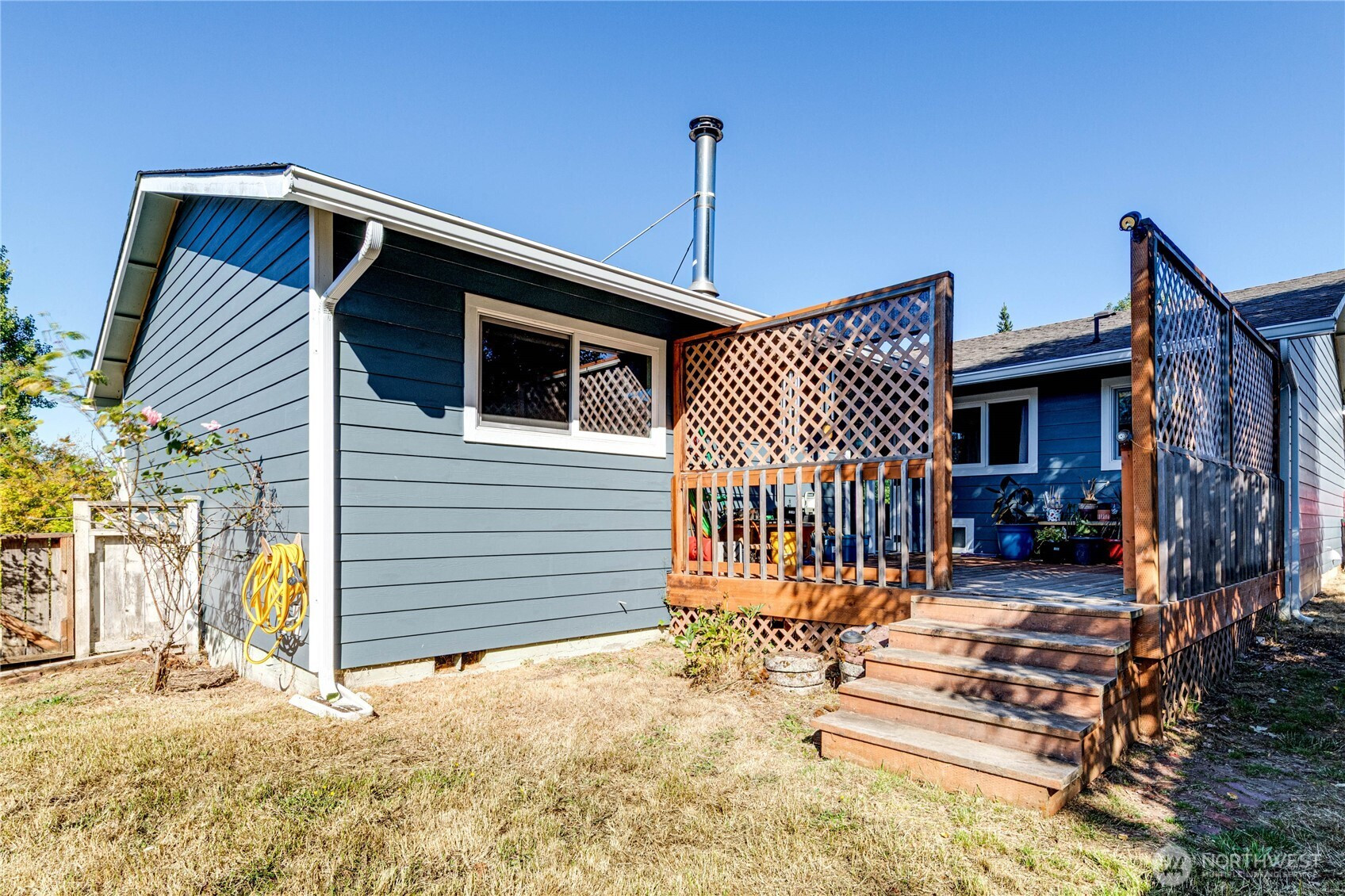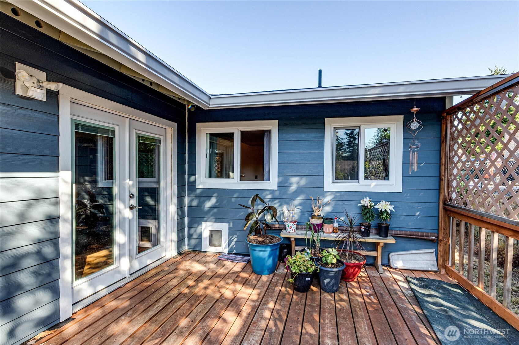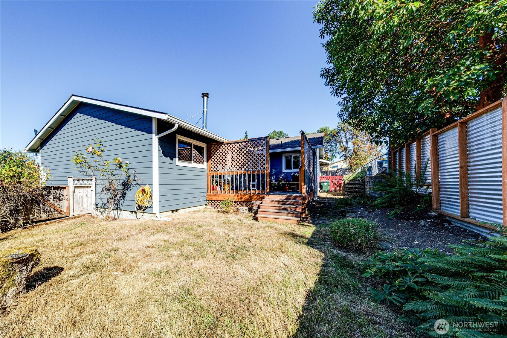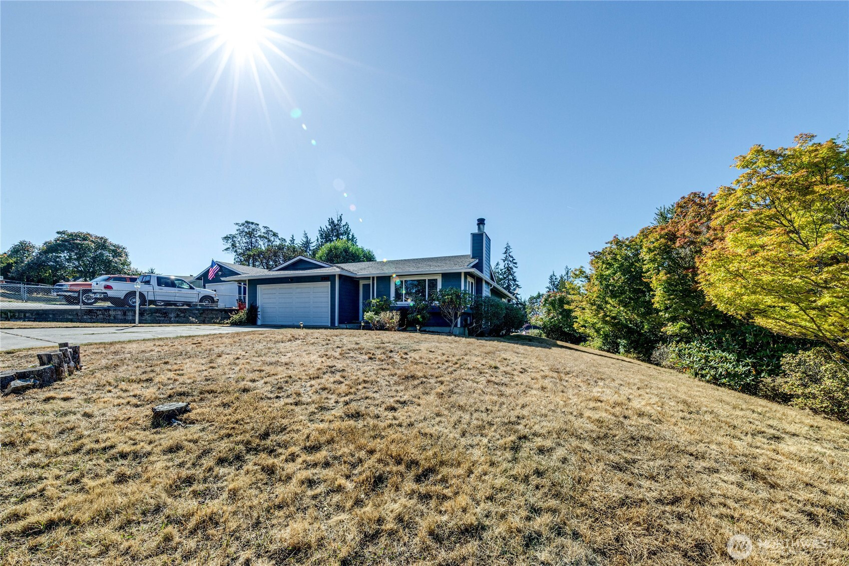 Charming single level home offering 3 bedrooms, 1 3/4 baths, and 1,530 sq. ft. of living space. Situated on a comer lot w/ a peek a boo water view from front yard, this home features new Hardi plank siding installed in 2022, an attached garage, a fully fenced backyard. Inside, enjoy both a spacious living room w/ a wood burning fireplace, a cozy family room w/a newer pellet stove installed in 2022, plus a kitchen w/ a convenient breakfast bar. The French doors from the family room open to a back deck, perfect for entertaining or relaxing outdoors. The thoughtful layout provides comfort and versatility. This home is close to the Olympic Discovery Trail and ready for its new owners!