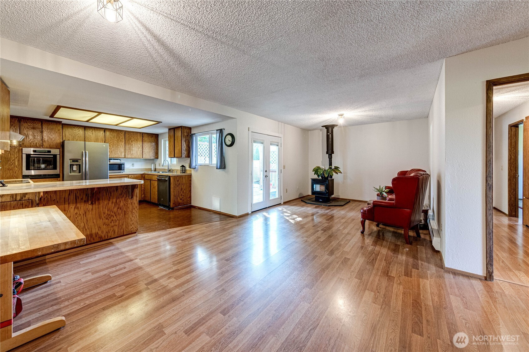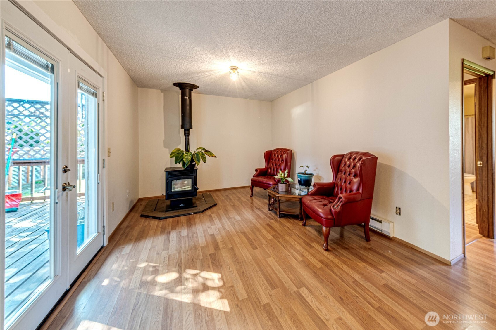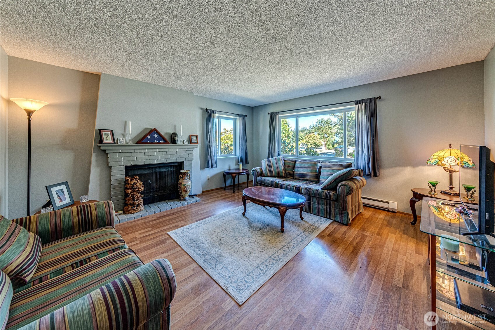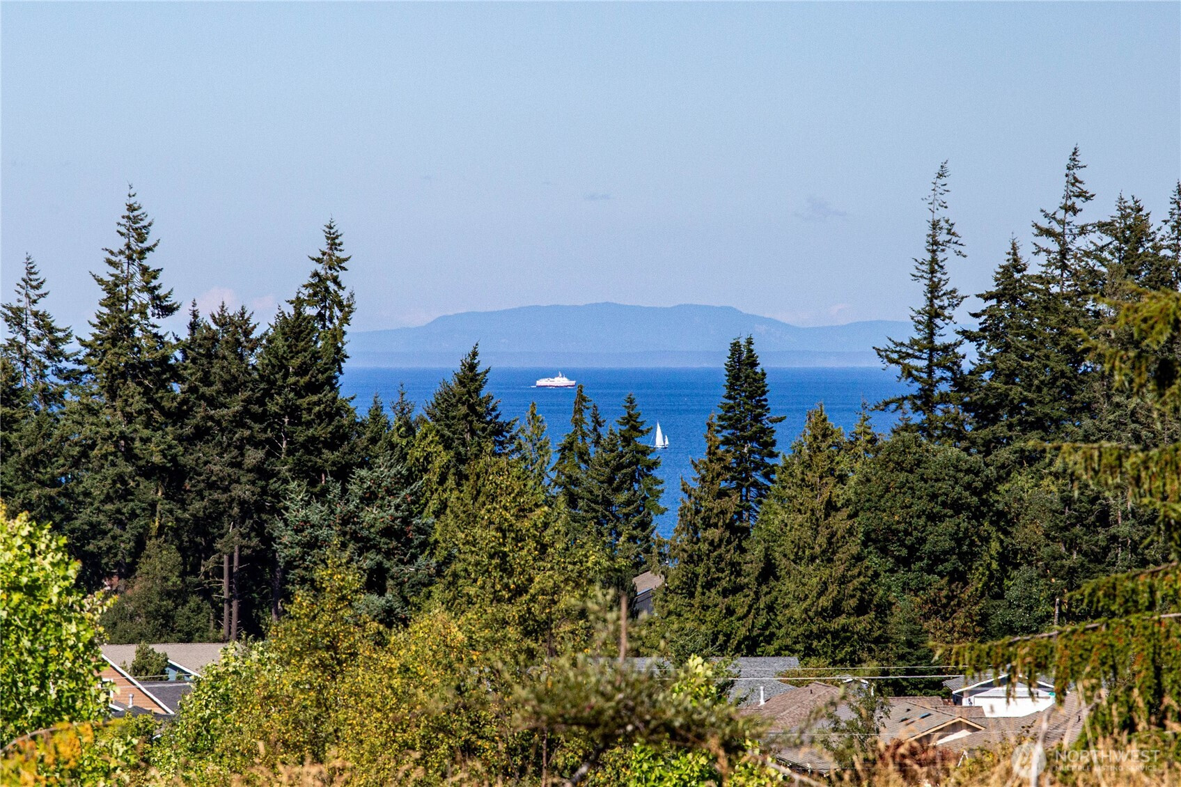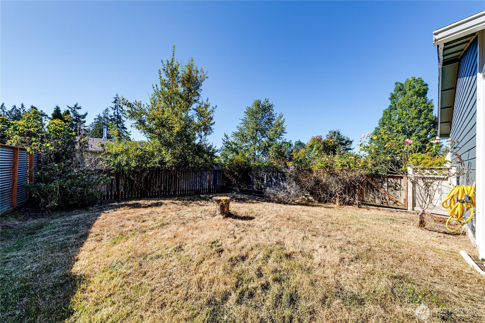 Charming single level home offering 3 bedrooms, 1 3/4 baths, and 1,530 sq. ft. of living space. Situated on a comer lot w/ a peek a boo water view from front yard, this home features new Hardi plank siding installed in 2022, an attached garage, a fully fenced backyard. Inside, enjoy both a spacious living room w/ a wood burning fireplace, a cozy family room w/a newer pellet stove installed in 2022, plus a kitchen w/ a convenient breakfast bar. The French doors from the family room open to a back deck, perfect for entertaining or relaxing outdoors. The thoughtful layout provides comfort and versatility. This home is close to the Olympic Discovery Trail and ready for its new owners!