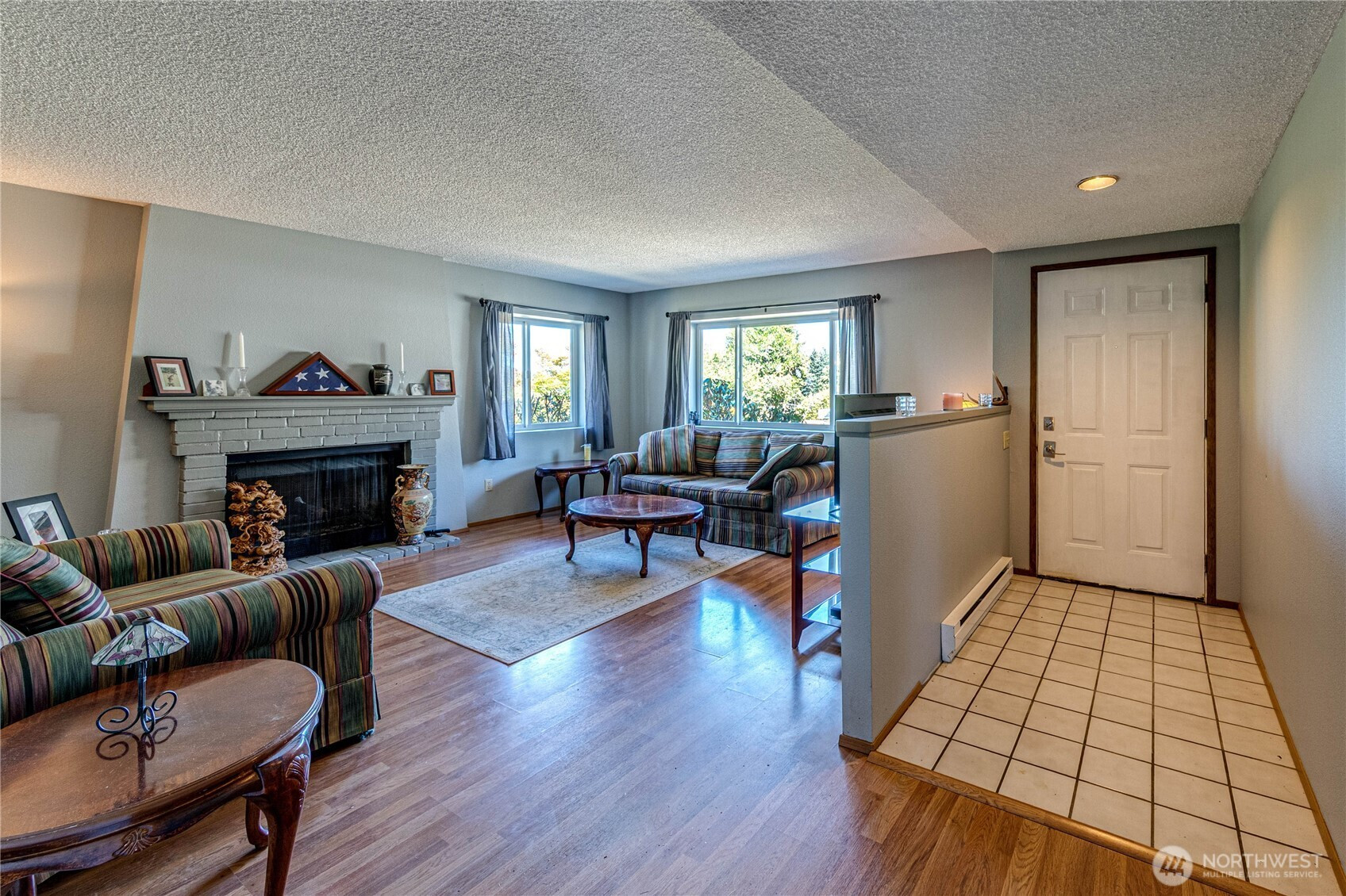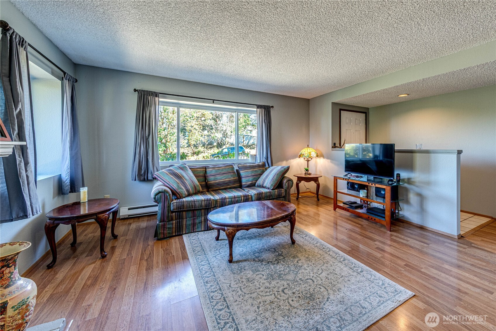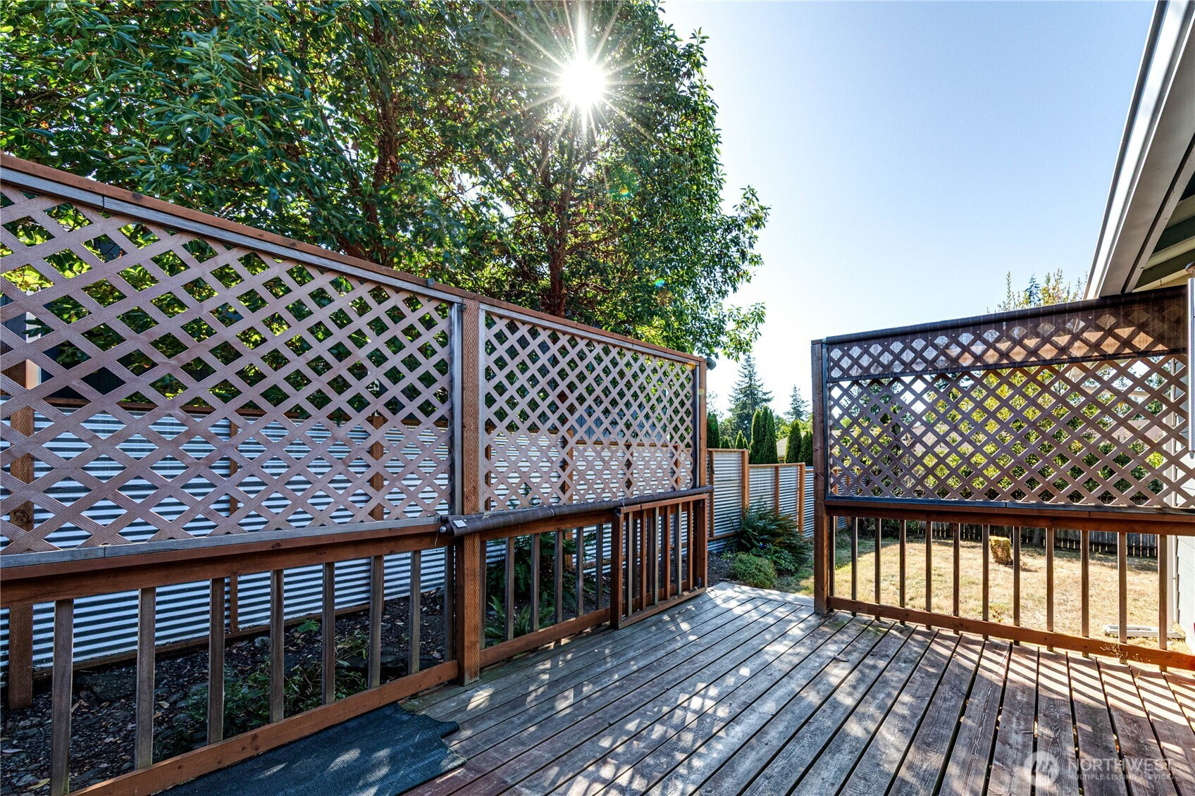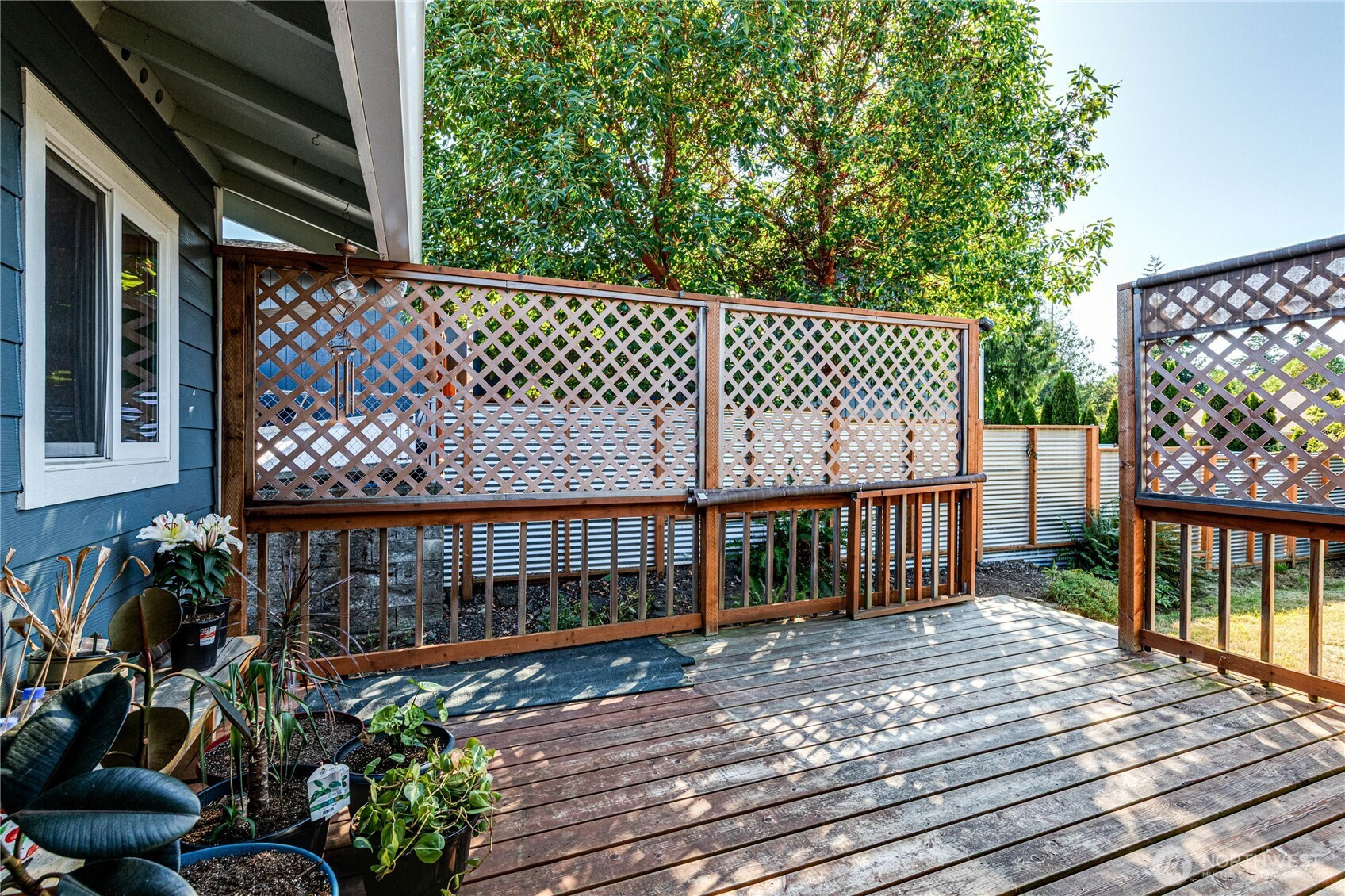 Charming single level home offering 3 bedrooms, 1 3/4 baths, and 1,530 sq. ft. of living space. Situated on a comer lot w/ a peek a boo water view from front yard, this home features new Hardi plank siding installed in 2022, an attached garage, a fully fenced backyard. Inside, enjoy both a spacious living room w/ a wood burning fireplace, a cozy family room w/a newer pellet stove installed in 2022, plus a kitchen w/ a convenient breakfast bar. The French doors from the family room open to a back deck, perfect for entertaining or relaxing outdoors. The thoughtful layout provides comfort and versatility. This home is close to the Olympic Discovery Trail and ready for its new owners!