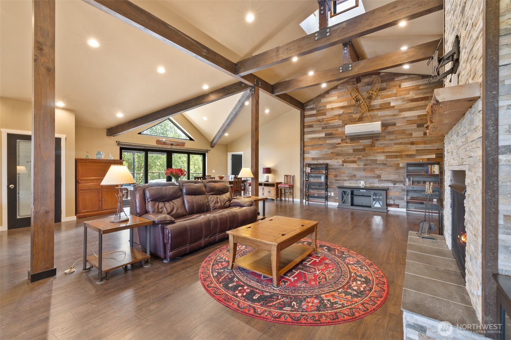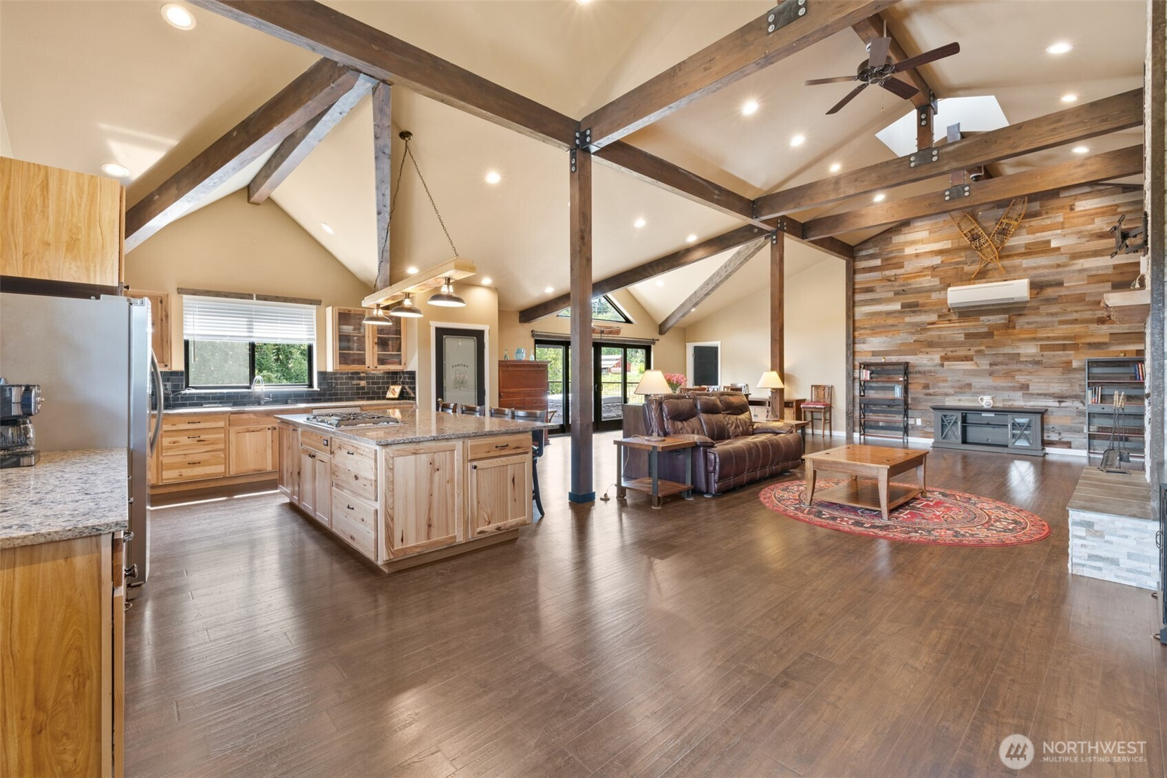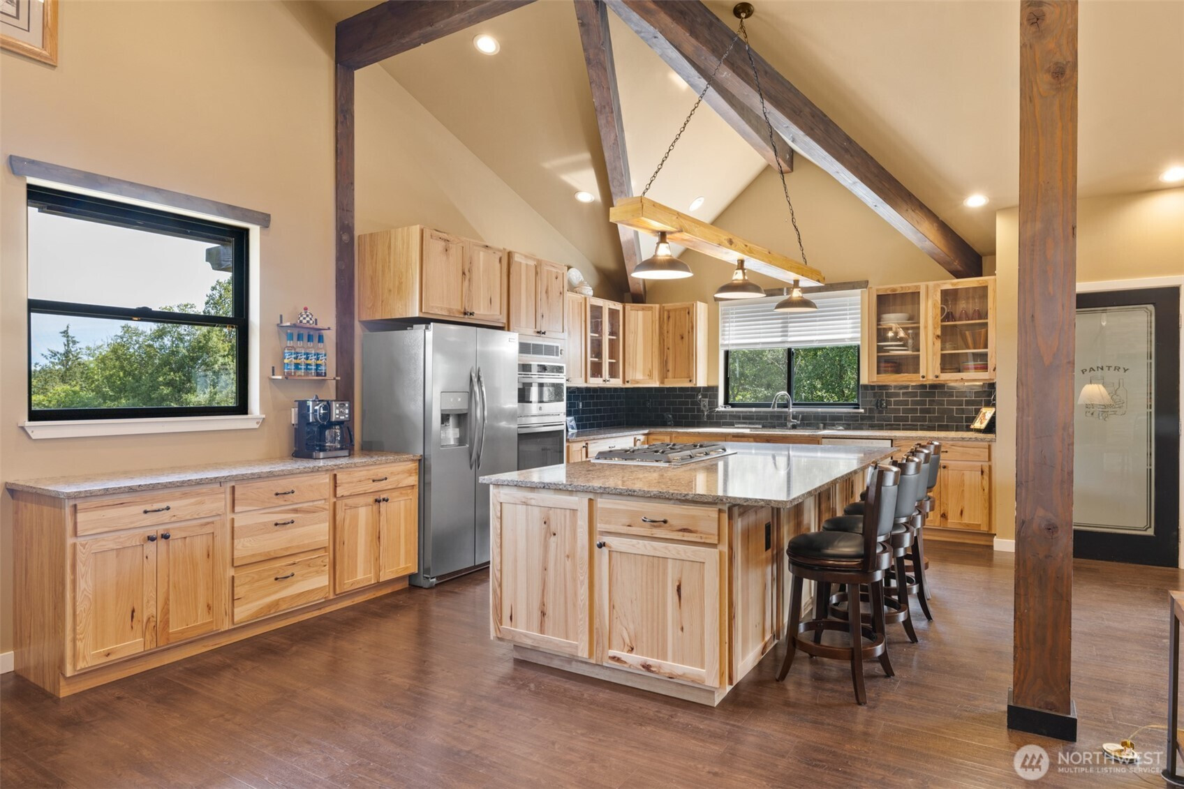 Northwest crafted charm! Custom 2020-built home on 6.74 beautiful acres—open meadows, established gardens, berries and fruit trees, plus a creek. If you’re dreaming of horses, chickens, hobby farming, or simply room to roam with your dogs this property is for you. Upstairs, 2,352 sq ft of light-filled living offers elevated privacy and an inviting open-concept layout with dramatic vaulted ceilings, exposed wood beams, and a stunning floor-to-ceiling stacked-stone propane fireplace topped with a handcrafted alder live-edge mantel. The kitchen is a true centerpiece with a 5’x9’ island, custom lighting, and seamless flow to the dining and living areas—ready for gatherings big or small. Enter through a spacious lower-level foyer/receiving room with both stairs and an elevator for easy access. And the showstopper: a massive 1,960 sq ft drive-through garage with 14’ doors on each end—perfect for RVs, equipment, toys, storage, and serious workshop potential (or consider stalls, studio, or creative space). Deck, shed, and greenhouse complete this serene, versatile retreat.