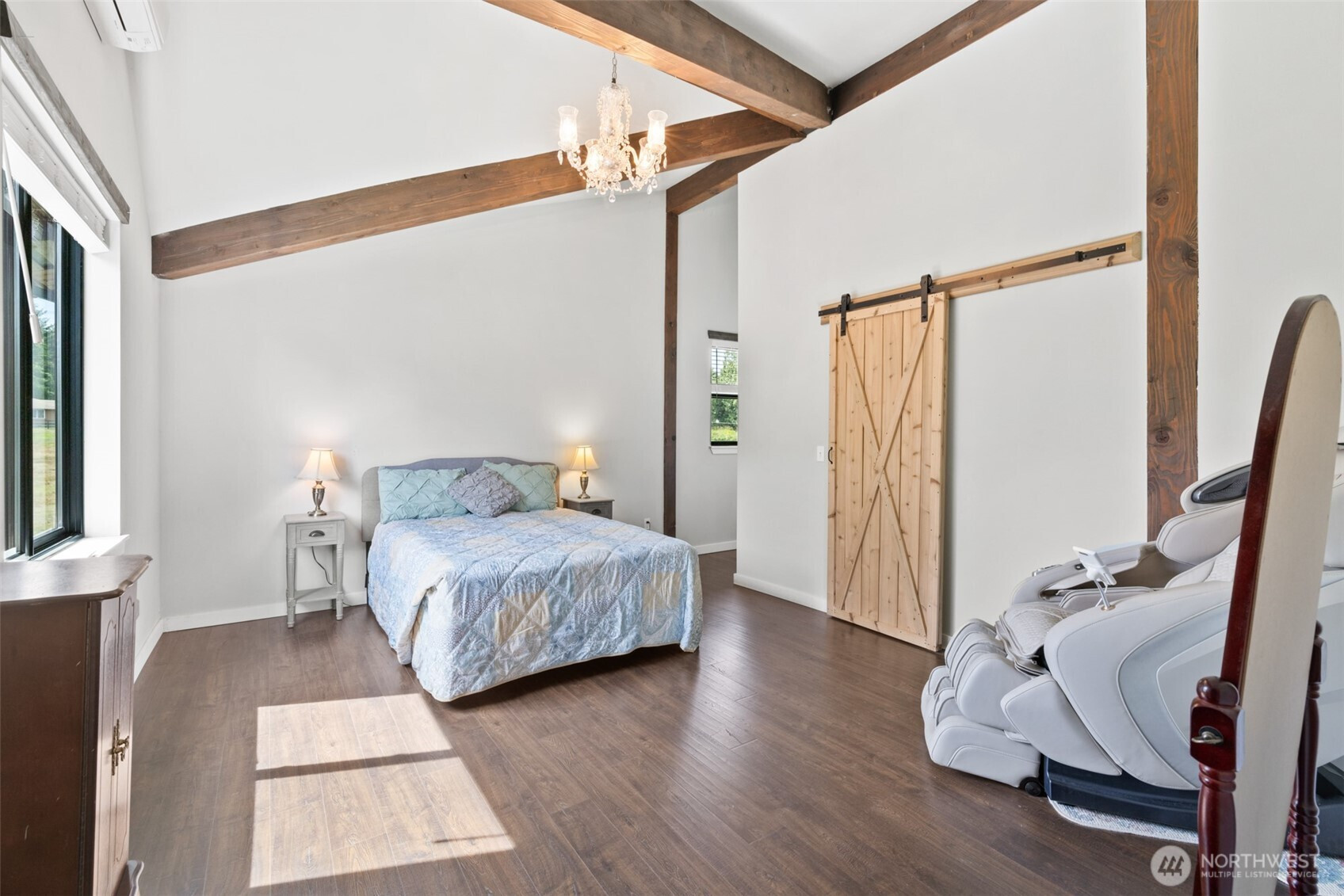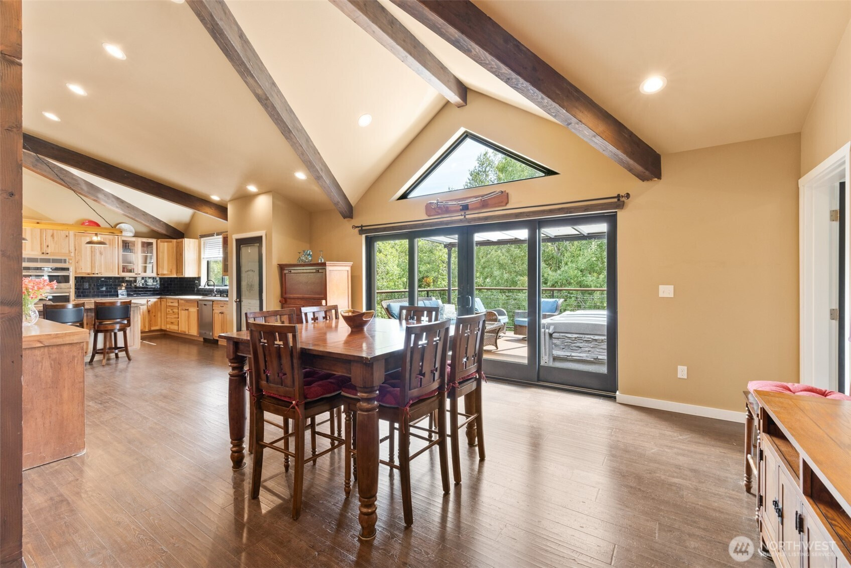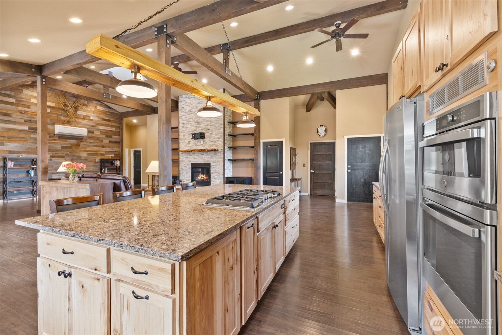 Northwest crafted charm! Custom 2020-built home on 6.74 beautiful acres—open meadows, established gardens, berries and fruit trees, plus a creek. If you’re dreaming of horses, chickens, hobby farming, or simply room to roam with your dogs this property is for you. Upstairs, 2,352 sq ft of light-filled living offers elevated privacy and an inviting open-concept layout with dramatic vaulted ceilings, exposed wood beams, and a stunning floor-to-ceiling stacked-stone propane fireplace topped with a handcrafted alder live-edge mantel. The kitchen is a true centerpiece with a 5’x9’ island, custom lighting, and seamless flow to the dining and living areas—ready for gatherings big or small. Enter through a spacious lower-level foyer/receiving room with both stairs and an elevator for easy access. And the showstopper: a massive 1,960 sq ft drive-through garage with 14’ doors on each end—perfect for RVs, equipment, toys, storage, and serious workshop potential (or consider stalls, studio, or creative space). Deck, shed, and greenhouse complete this serene, versatile retreat.