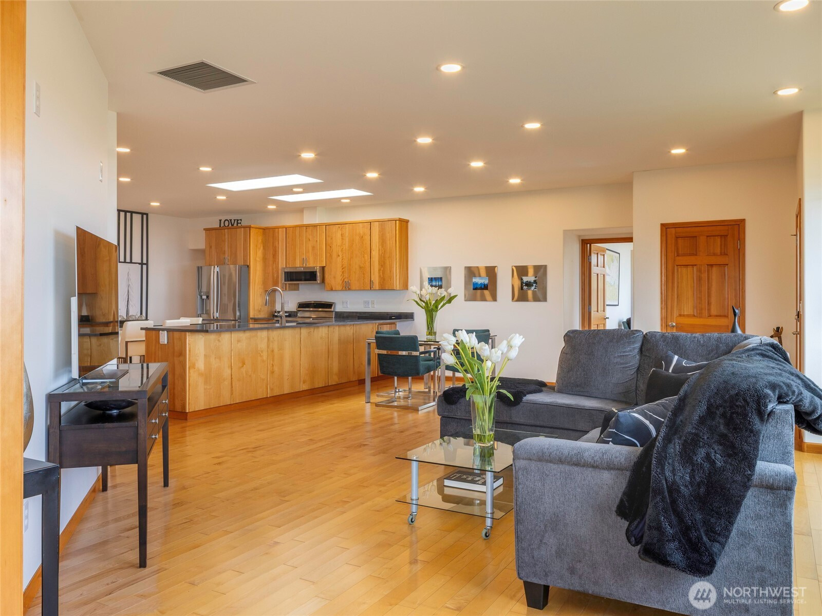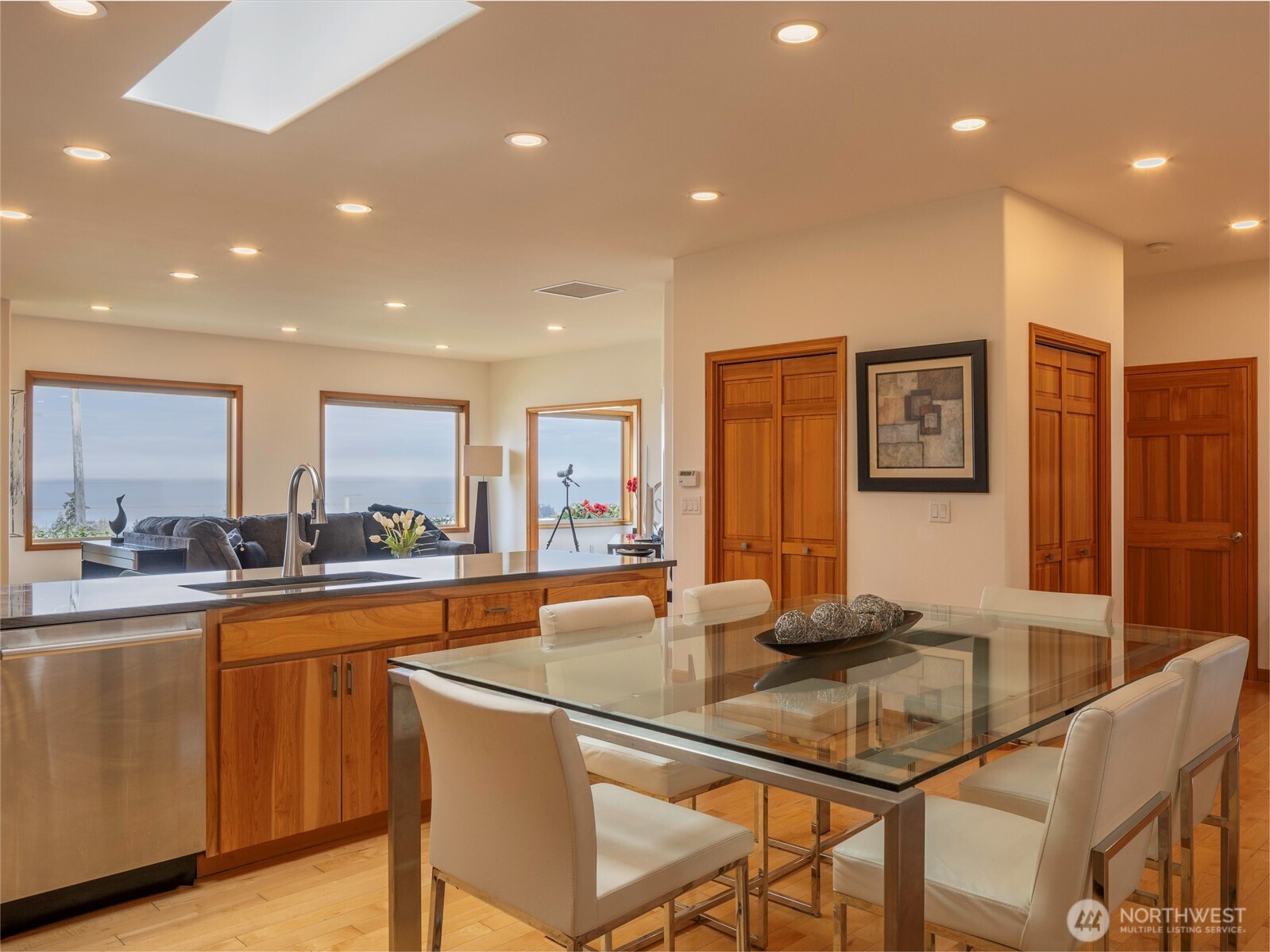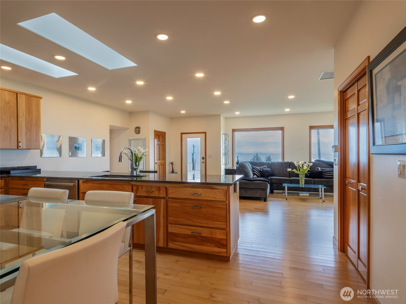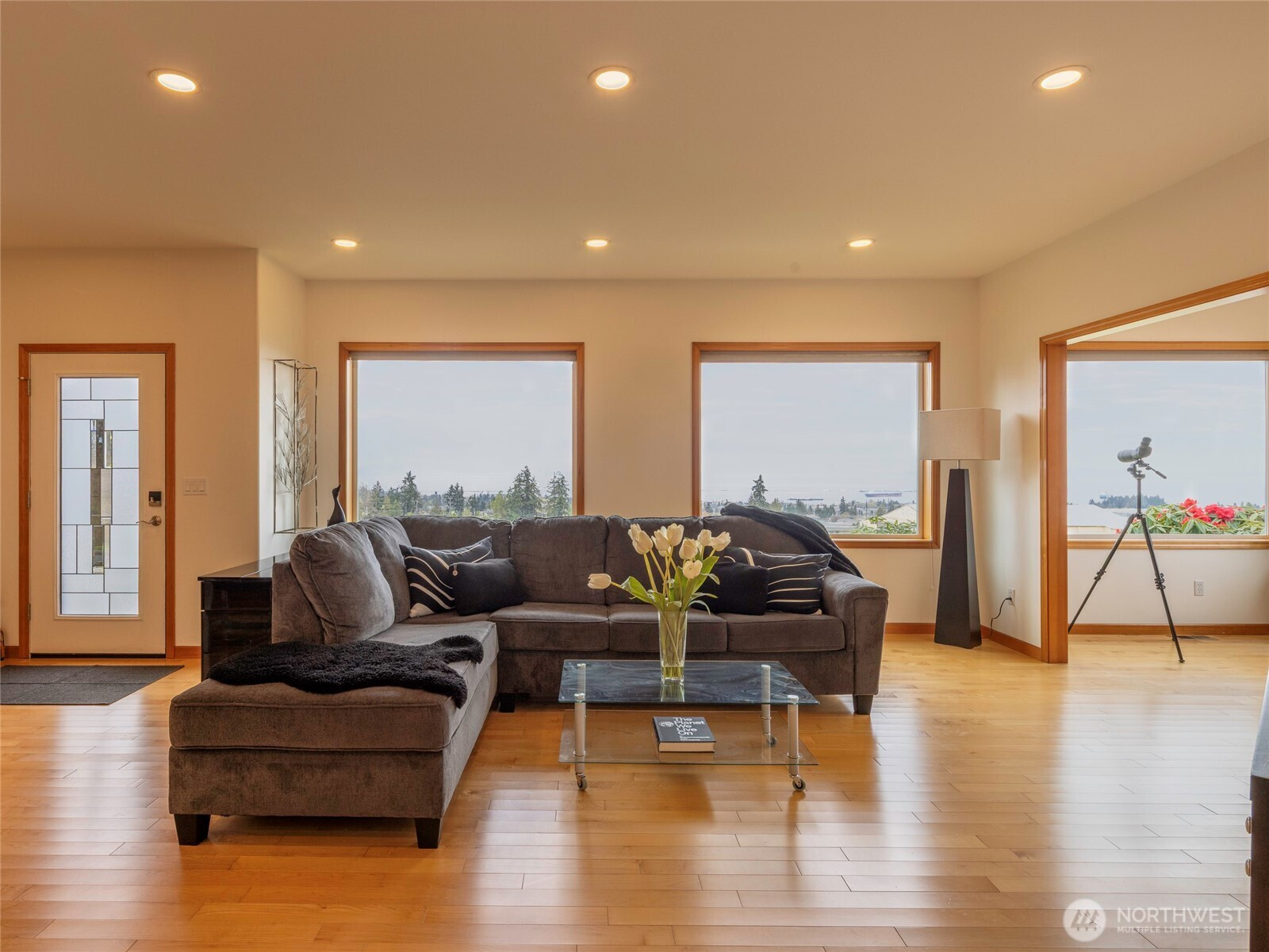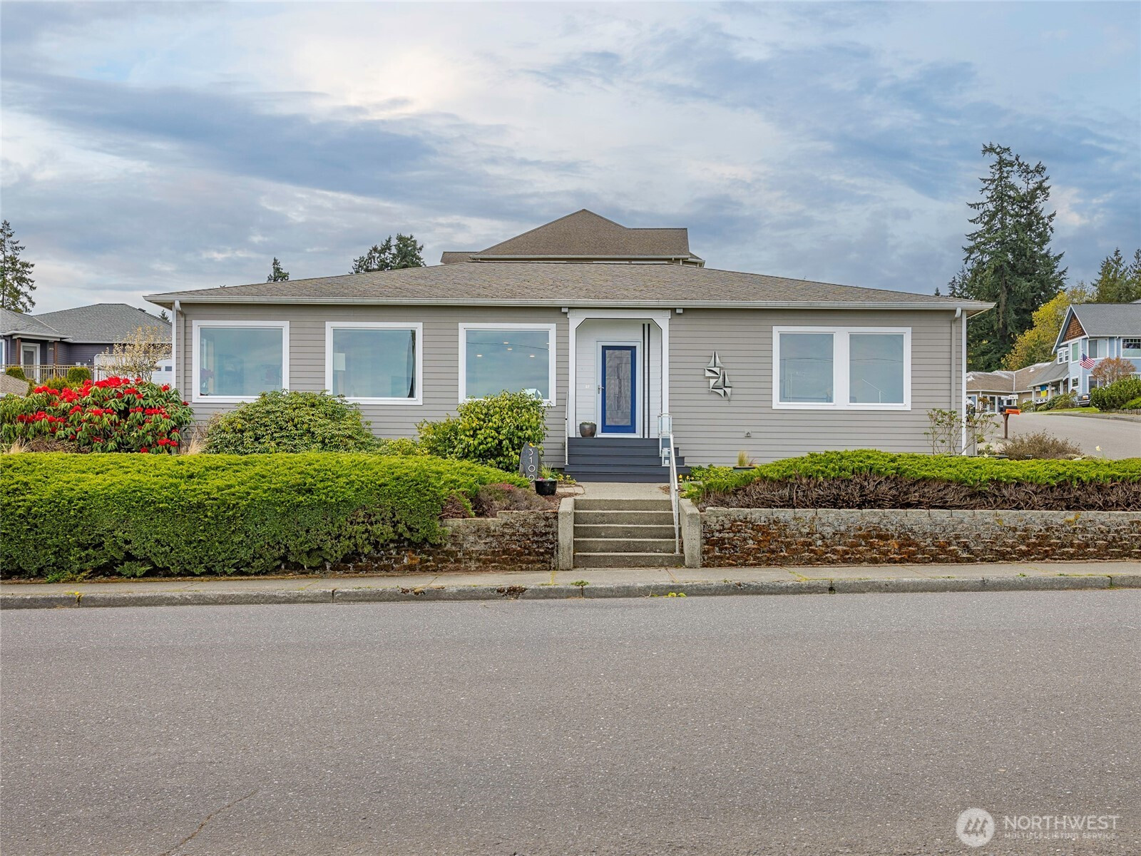 Perched in a sought-after location, this beautifully updated 3-bedroom, 2-bath home offers breathtaking, panoramic views of the Strait of Juan de Fuca, Vancouver Island and Port Angeles. 9 foot ceilings, skylights and large front windows flood the home with natural light, while you enjoy stunning vistas from multiple rooms, including the kitchen. Built in 2004 and thoughtfully updated between 2019 - 2023, this home blends timeless design with modern touches. Rich maple wood flooring and elegant ceramic tile flow throughout, creating a warm & inviting atmosphere. The kitchen is a standout, featuring luxurious natural quartz countertops, ample workspace, & a layout ideal for both everyday living and entertaining, all while enjoying the view from your kitchen sink. The spacious primary suite is a private retreat, complete with heated floors & a soaking tub perfect for unwinding at the end of the day. The second bathroom offers a sleek walk-in shower, heated tile floors & granite countertops. Step outside to a peaceful patio surrounded by your garden and well planned landscaping, an ideal setting to relax, entertain, or simply watch ships across the water. An extra-large 2-car garage provides plenty of room for storage, hobbies, or a dedicated work area. This home combines comfort, quality, and unforgettable views.