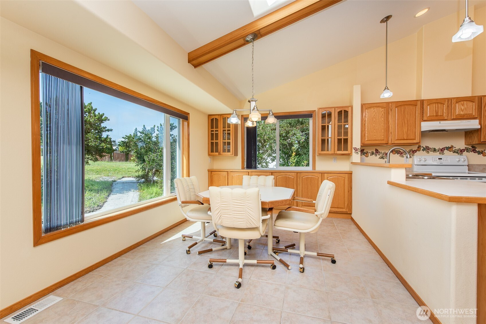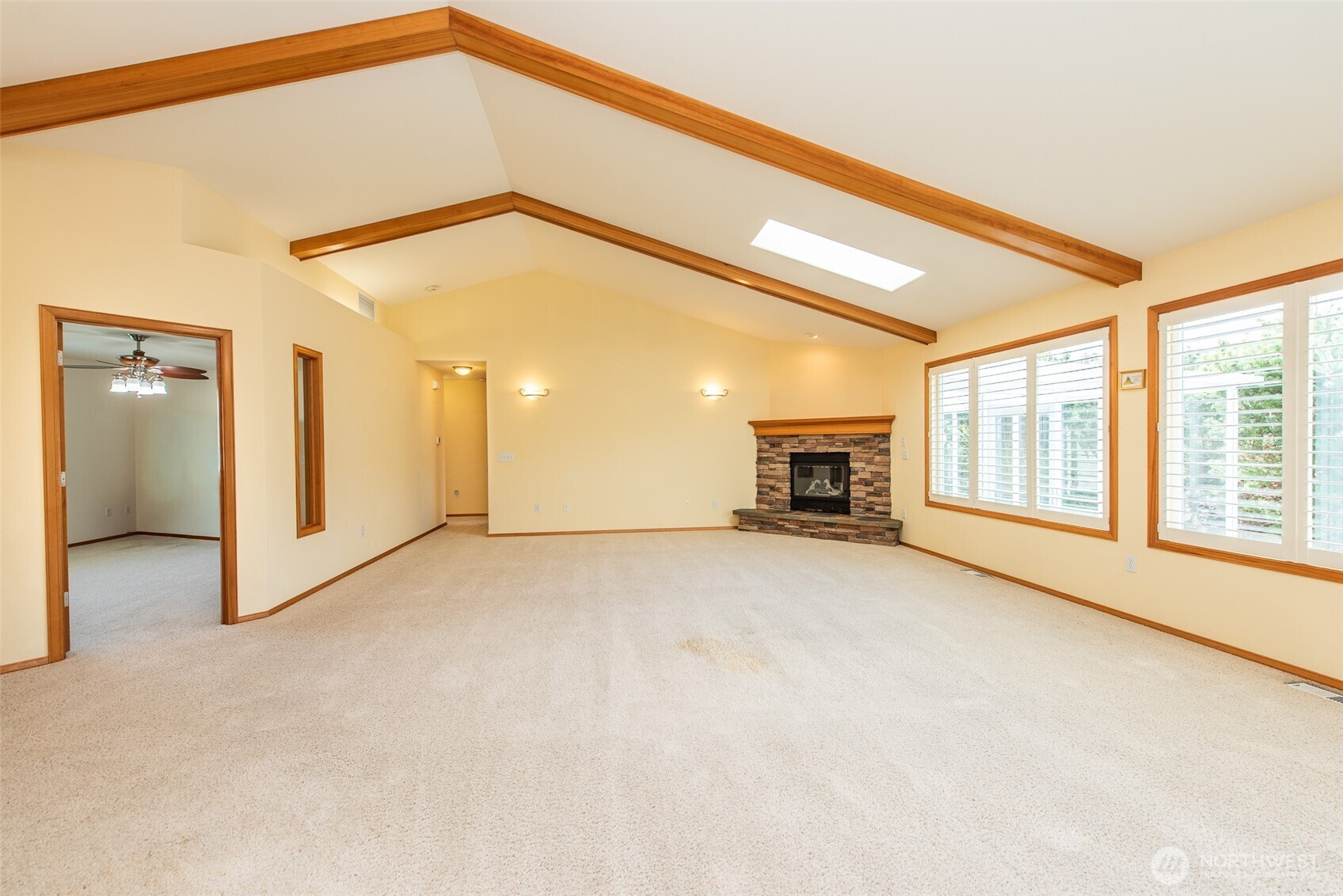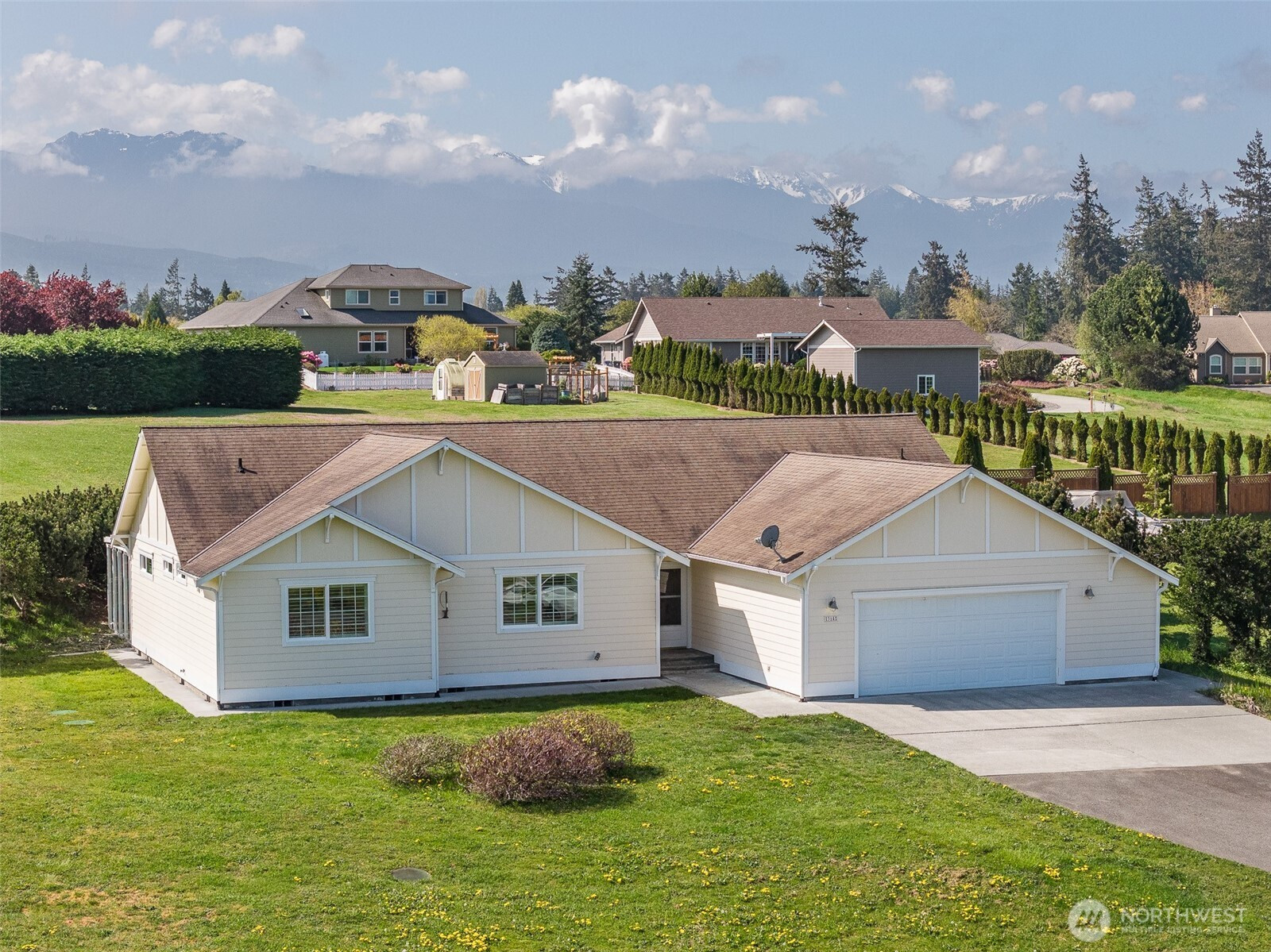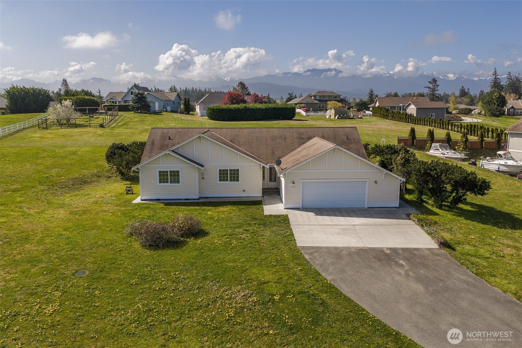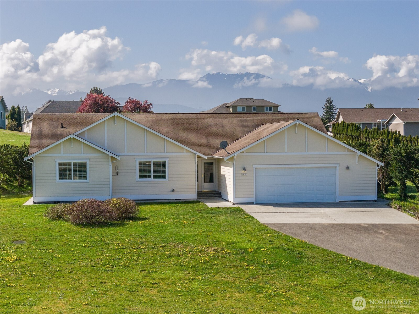 Enjoy peaceful Sequim living with stunning Olympic Mountain views in this beautifully maintained 2 bed, 2 bath + dedicated office, ~2,100 sq ft single-level home near the Dungeness Wildlife Refuge. Tucked in a quiet cul-de-sac, this property offers a rare blend of privacy, space, and convenience. Inside, vaulted ceilings with exposed beams and skylights create a bright, open living area centered around a cozy stone fireplace. The layout flows seamlessly into the dining space and kitchen, designed for both everyday living and entertaining. The spacious primary suite features an ensuite bath and direct access to a bright enclosed sunroom—perfect for year-round relaxation. A second bedroom and dedicated office provide flexibility for guests, remote work, or hobbies. Step outside to a generous yard with mature landscaping, room for gardening, and space to unwind. The attached 573 sq ft garage and oversized driveway offer ample parking and storage. Located just minutes from downtown Sequim, medical facilities, walking trails, and outdoor recreation. This home delivers comfort, functionality, and the peaceful lifestyle the Olympic Peninsula is known for.