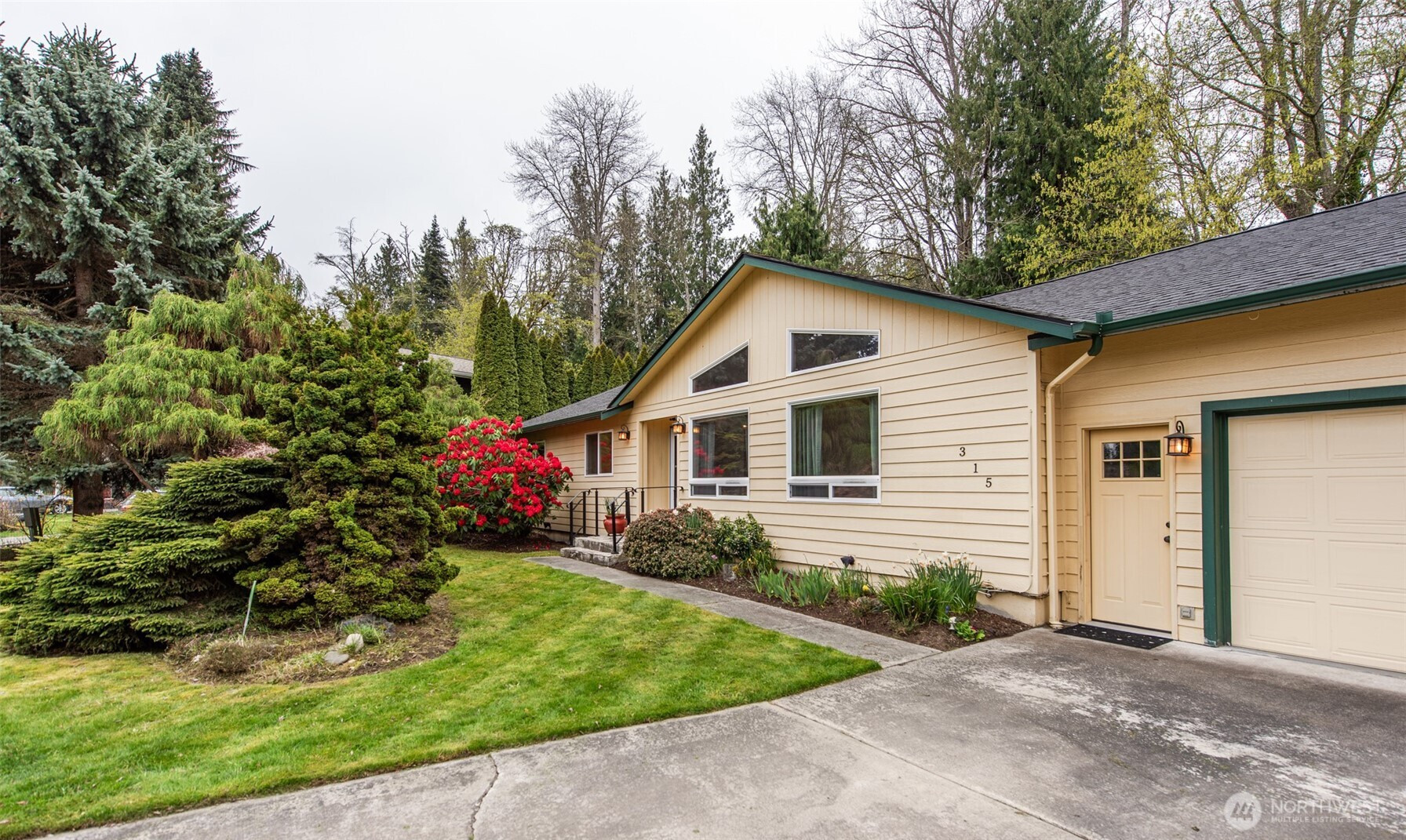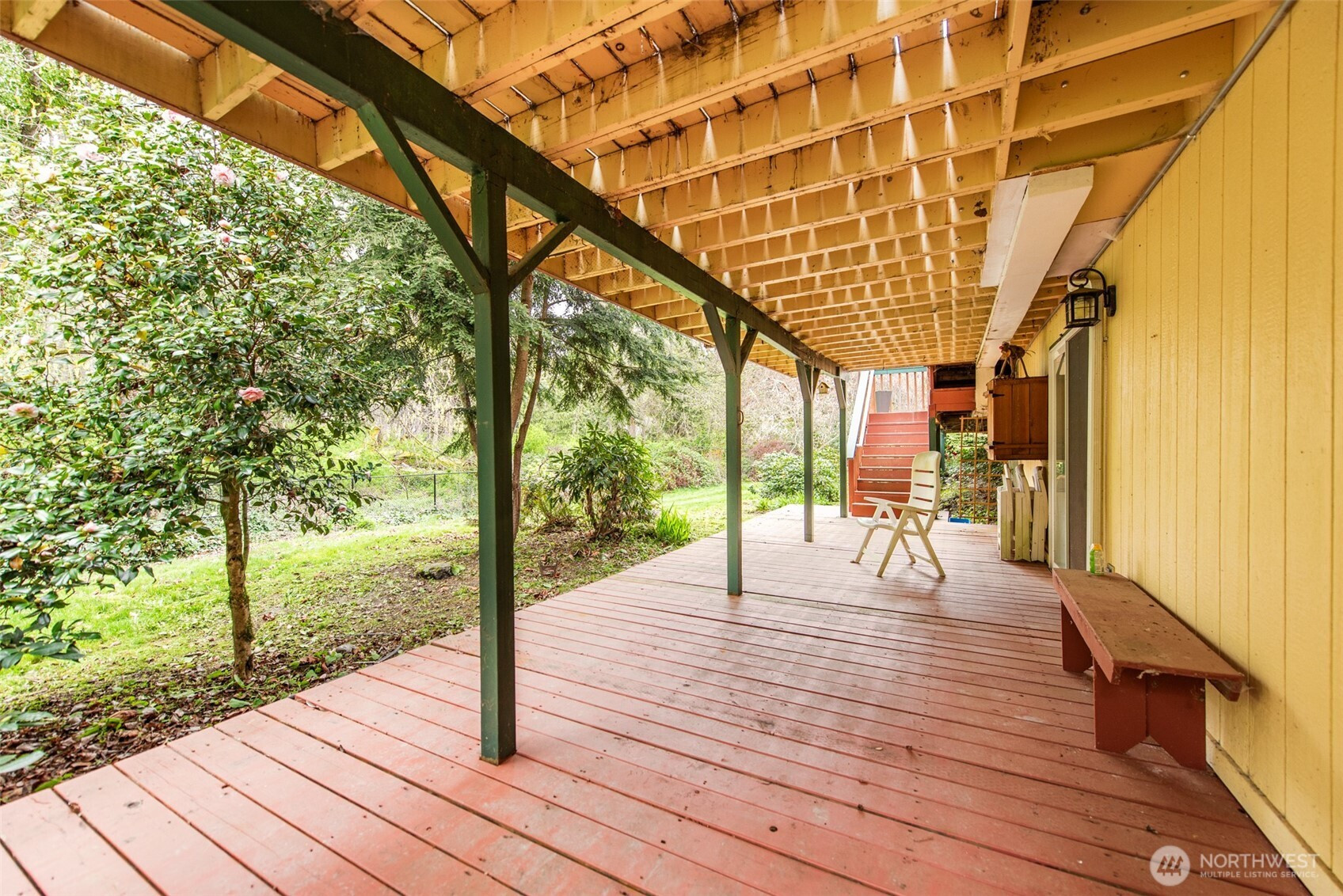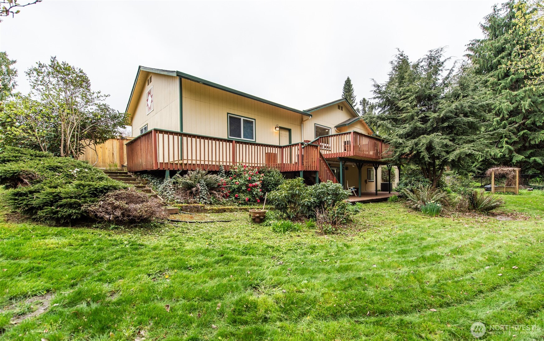 Tucked away on a wooded lane is this lovely 3 bedroom home. Traffic noise and lights at night melt away to create a serene environment. Enjoy the narrow lanes for walking, jogging or biking in the neighborhood or take the scenic trail amid the trees along the Dungeness River. This spacious 2,388 sq. ft home allows for an office, two guest rooms and large main bedroom. The recently renovated main bathroom has double sinks and a large shower with exquisite tile work. The downstairs has a bedroom and huge bonus room with private access from the lower deck. Updated kitchen with solid surface counters and stainless steel stove, dishwasher and microwave. New lighting with fans in living and dining areas. New garage door (2025). The second bathroom is updated with new fixtures, paint and lighting. The yards are filled with flowering shrubs and evergreens with newer outdoor lighting. Beyond the backyard is land owned by the Olympic Tribal Land trust filled with forest, and which is unlikely to be disturbed or developed. A clubhouse, pool and golf course are also available to residents