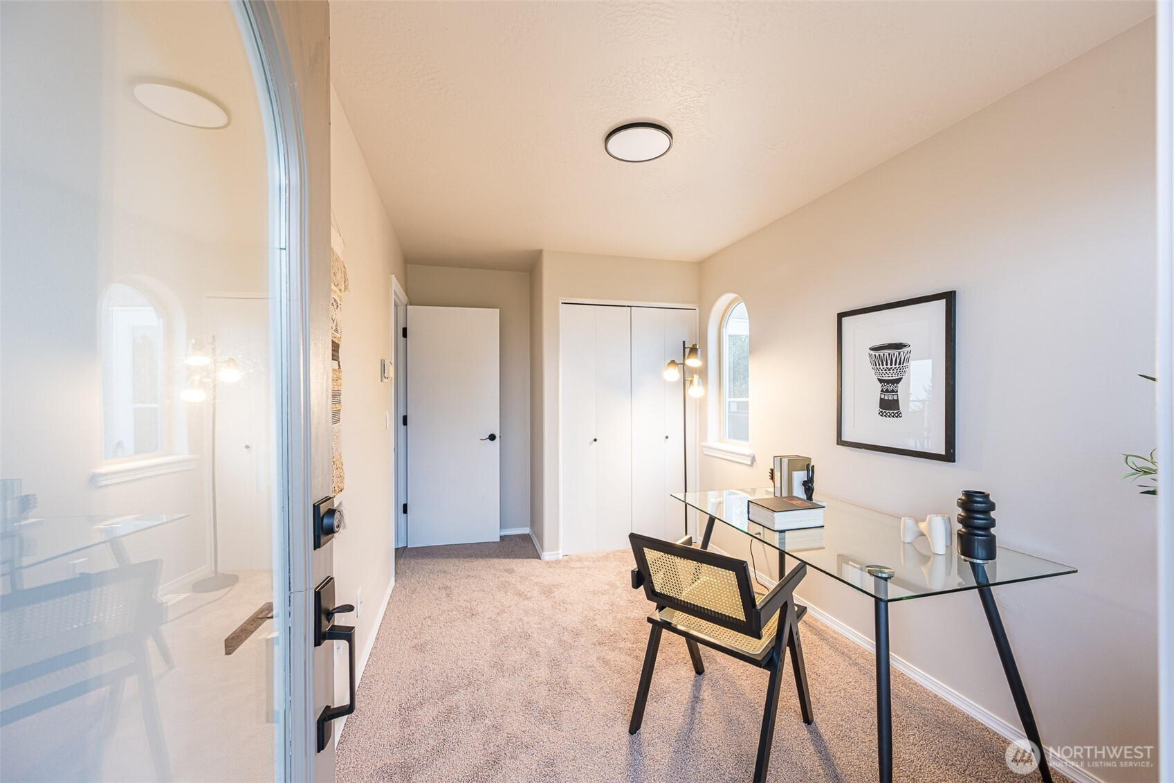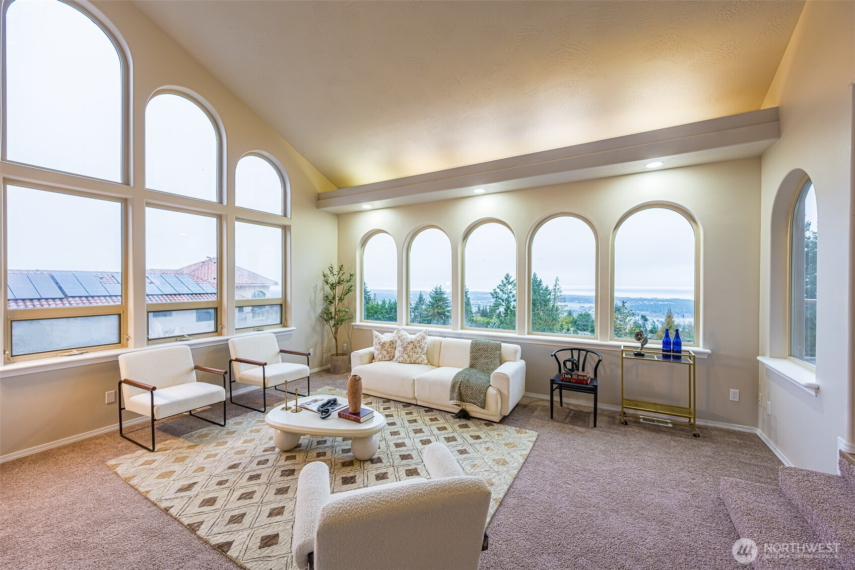 Perched atop Bell Hill in Sequim, this custom-built, Spanish Colonial–inspired home offers privacy, scale, and sweeping views of Sequim, Victoria, the Strait of Juan de Fuca, and Mountains. Arched windows, stucco exterior, and tile roof set a timeless tone, while the interior features sage cabinetry, quartz counters, extensive custom tilework, and dramatic natural light throughout. Spanning three levels with 5 bedrooms and 3 baths, the home is designed for both everyday living and entertaining. Enjoy multiple view decks, a covered patio, and a sun-filled solarium. Set on 1.22 acres, this is a rare hilltop retreat close to town.