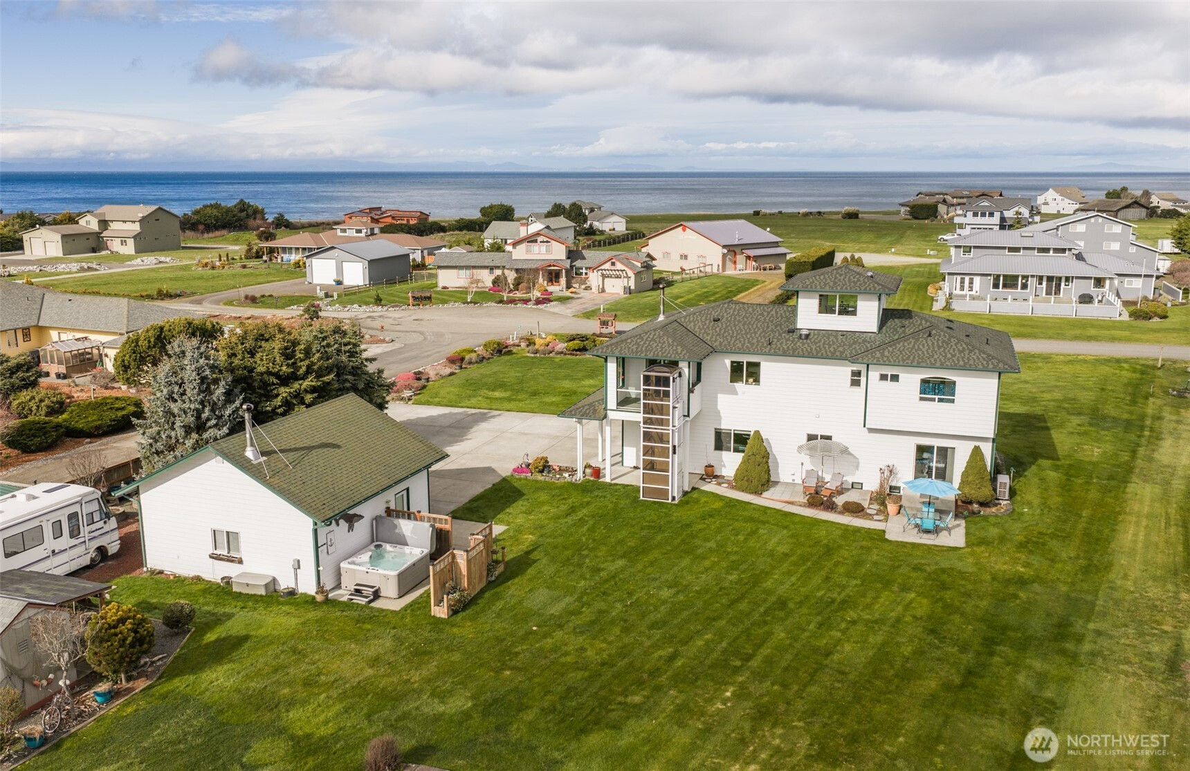 Spectacular 360 degree Strait & Olympic Mt views surround this custom home on a level 1.2 acres a stone's throw from the Dungeness Spit & National Wildlife Refuge. Warmth & serenity will wrap you the minute you enter this thoughtfully designed home. The Spacious great room with vaulted ceilings allows views & light from every window. Enjoy the warmth of the wood burning stove as you relax or dine. Turn your inner chef loose in the beautifully efficient kitchen with Corian counters, island & w/in pantry. Slide on out to the upper deck to BBQ or take the Lift down to your yard. The Primary bedroom on this level has ensuite w/double vanities, w/in shower, jetted tub, towel warmer & views. The lower level offers a guest bedroom w/patio, bath, laundry & an office/3rd bed. & 780 ' garage. The Cherry on top is the upper "Crow's Nest" w/wine bar to relax & take in the ever changing Mts & magnificent marine traffic. Have your telescope handy! There's a shop w/wood stove to pursue your passions, a Hot Tub, a little escape studio, a fire pit, a gazebo & even a little hidden side yard. There are amazing gardens that will bloom. A brand new Trane heat pump, new to water heater, irrigation w/Rainbird sprinkler & drip w/timers, dry well for site drainage, 2 RV hookups, emergency food & water storage, seismic building practices including the foundation & shear walls all make for quality & minimum maintenance. You've got to come & feel the peace this wonderful inviting home & property offers!