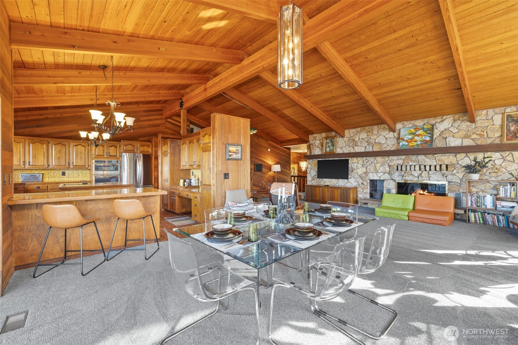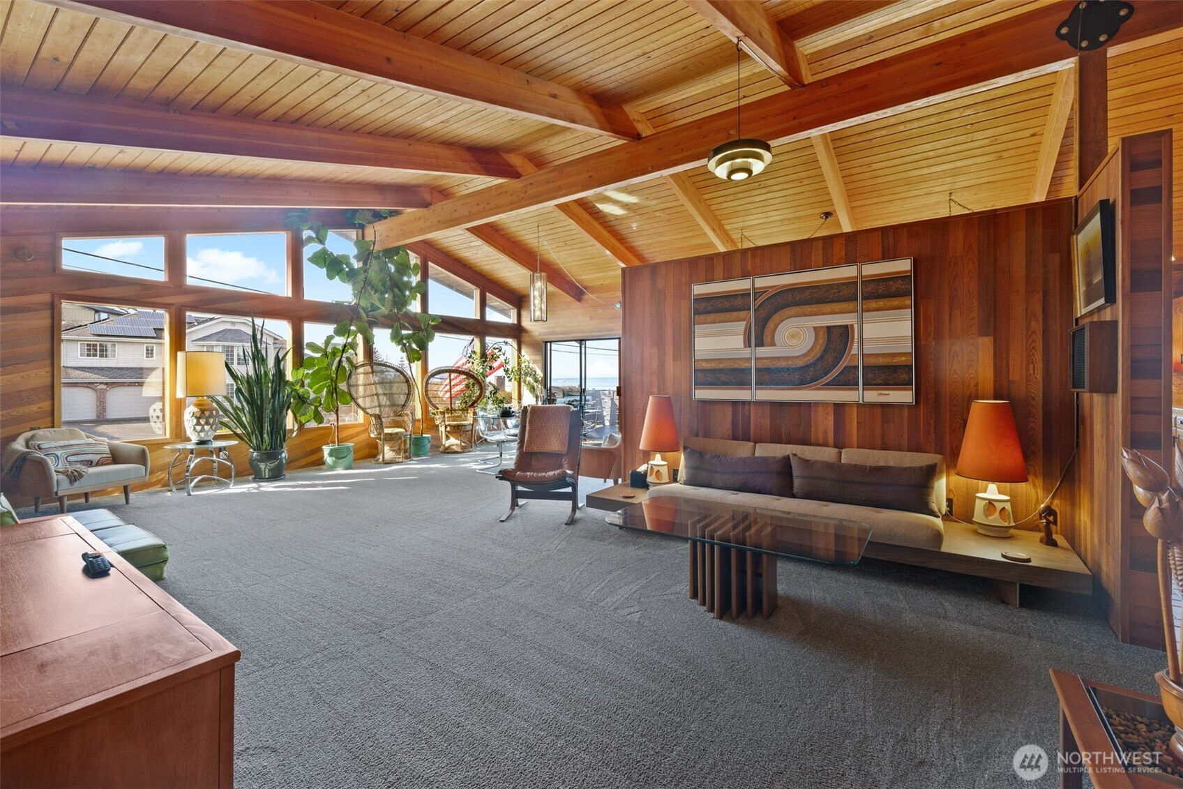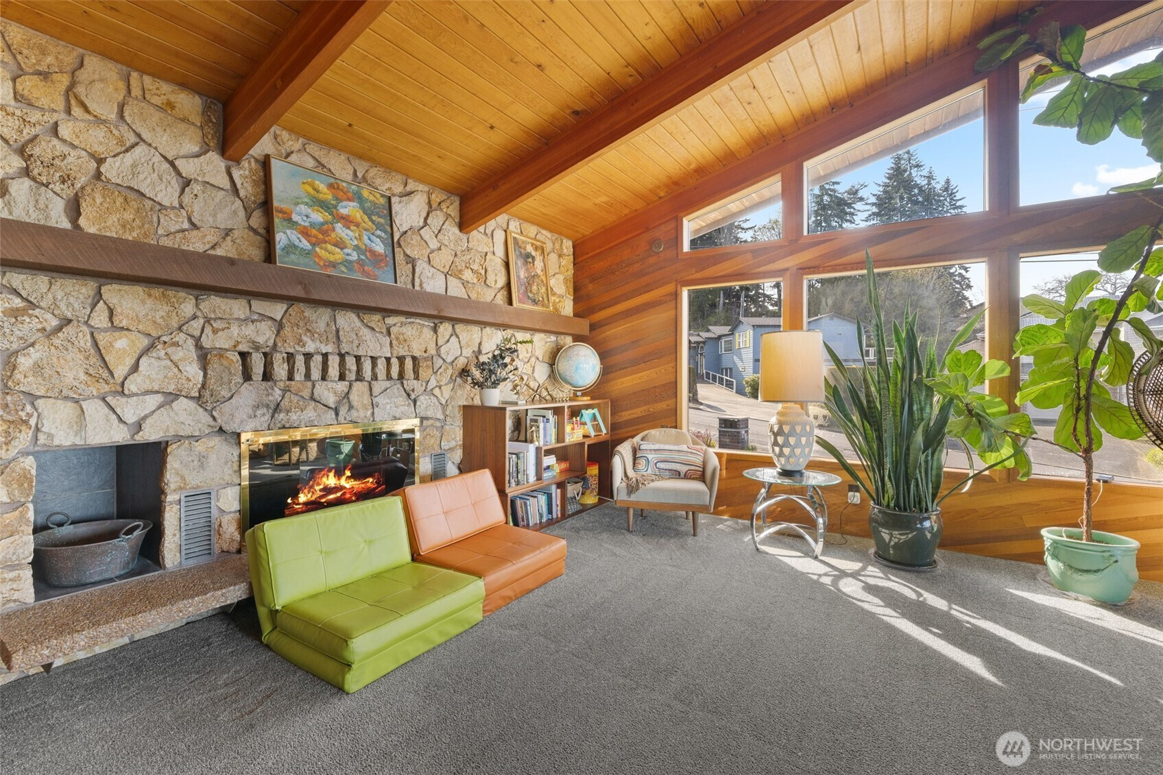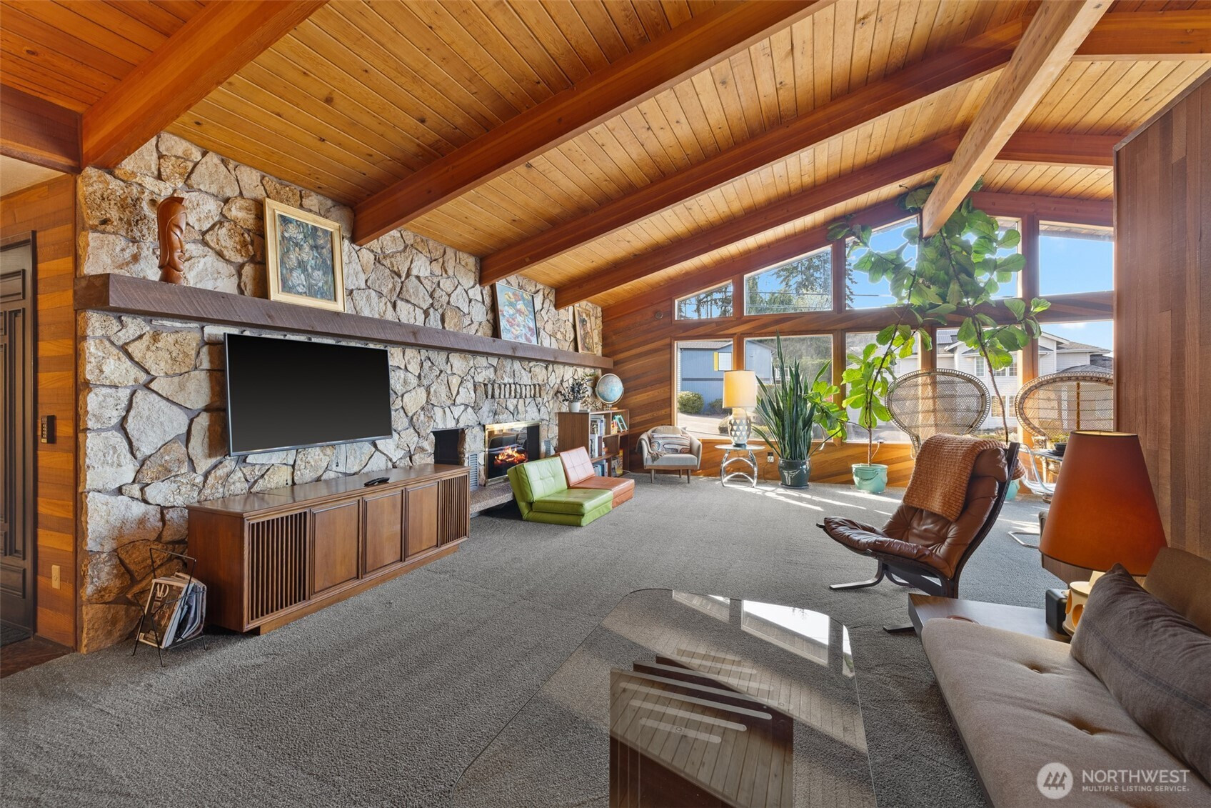 Experience a rare intersection of 1970s contemporary architecture and Pacific Northwest natural beauty. This DelGuzzi-built legacy home, located in the highly desirable Cresthaven neighborhood, is a meticulously preserved split-level masterpiece that channels a sophisticated post-modern, mid-century California vibe. The journey begins with grand stairs leading to a dramatic entry. Inside, the residence reveals soaring interiors characterized by vaulted wood ceilings and rich cedar paneling. The light-filled floor plan is defined by massive windows that frame the rugged beauty of the PNW, offering a front-row seat to stunning sunrise and sunset views over the Strait of Juan de Fuca. At the heart of the home sits an original, full-wall stone fireplace, serving as a monumental focal point for the main living area. Every corner of this property reflects the intentional design and quality craftsmanship of a bygone era, kept in pristine condition for the modern connoisseur.