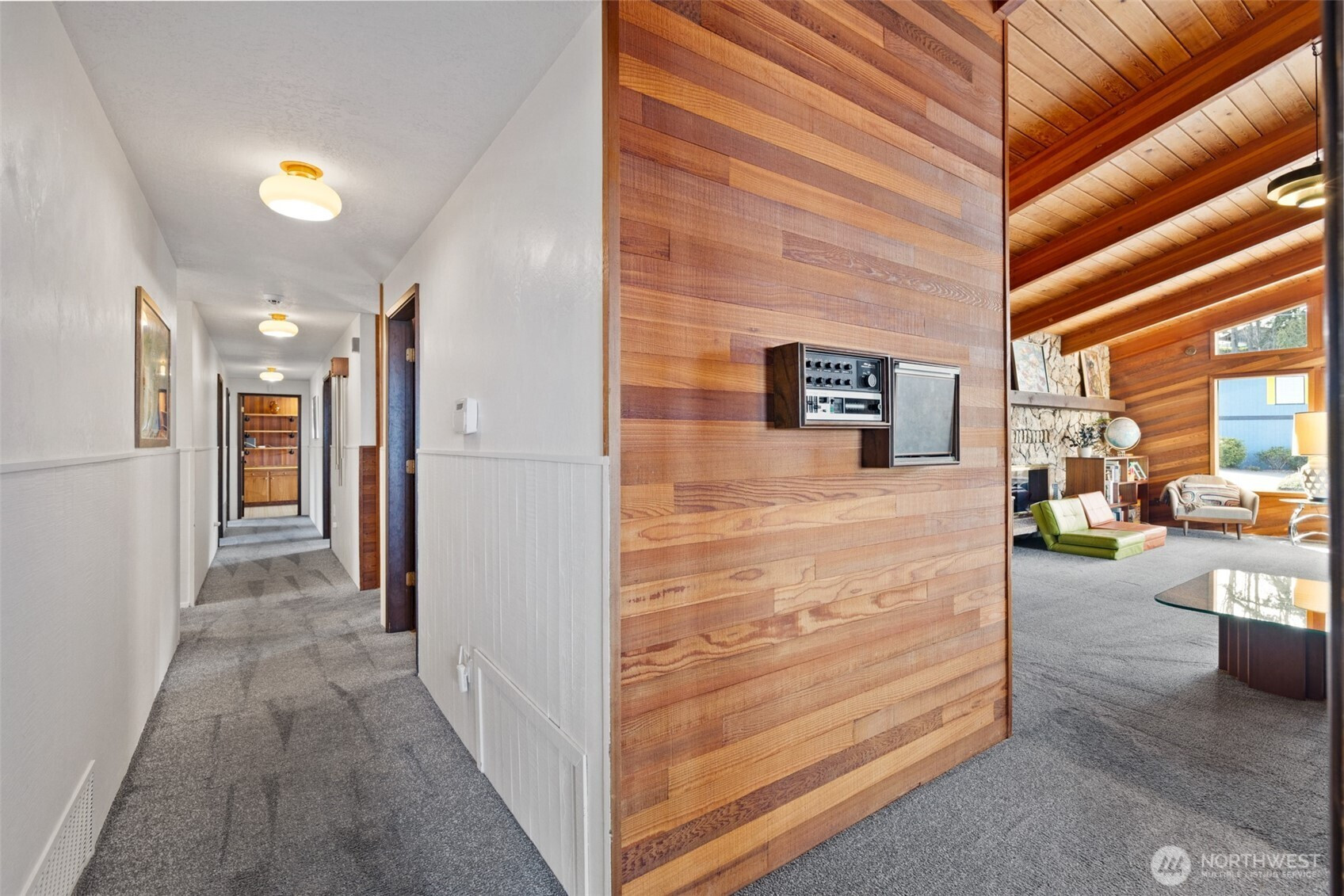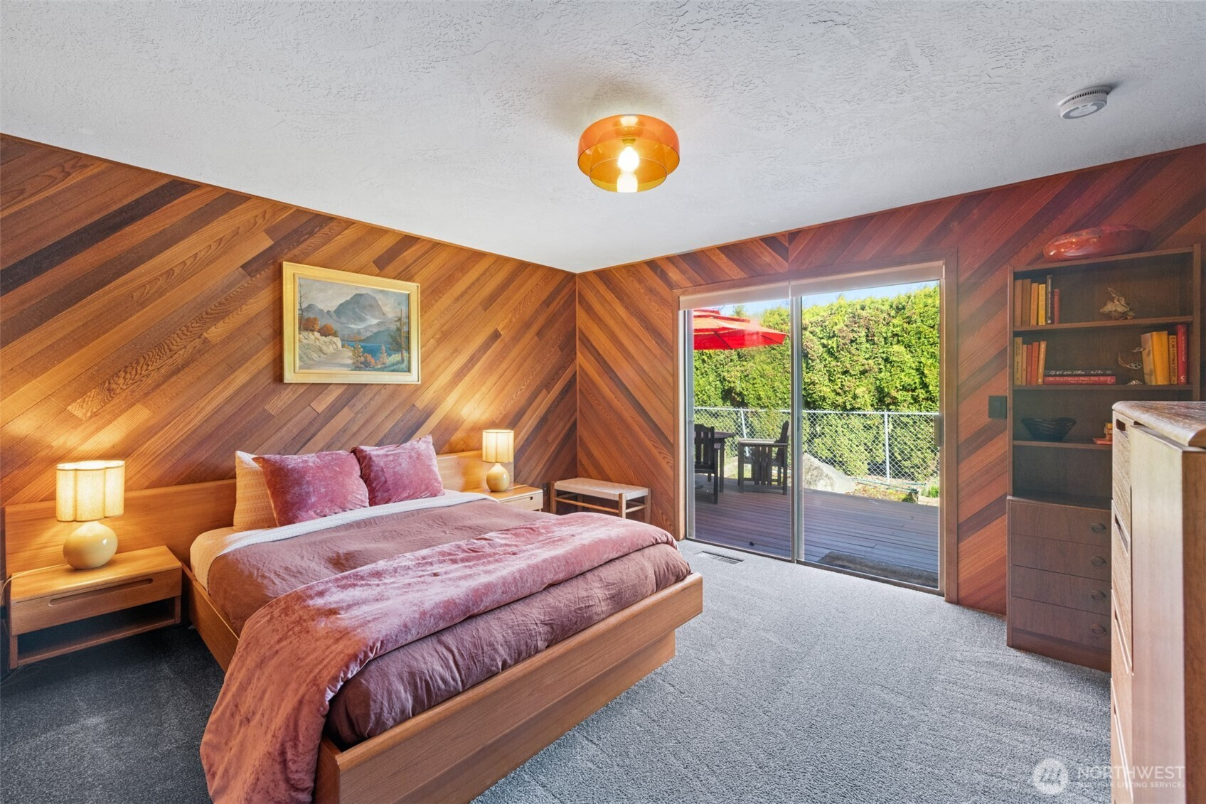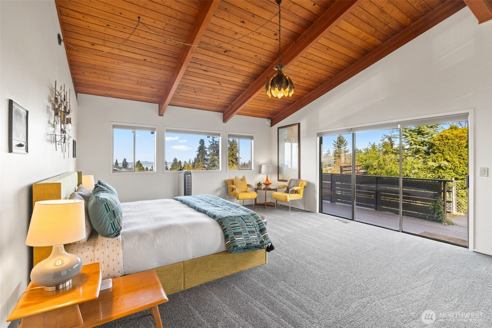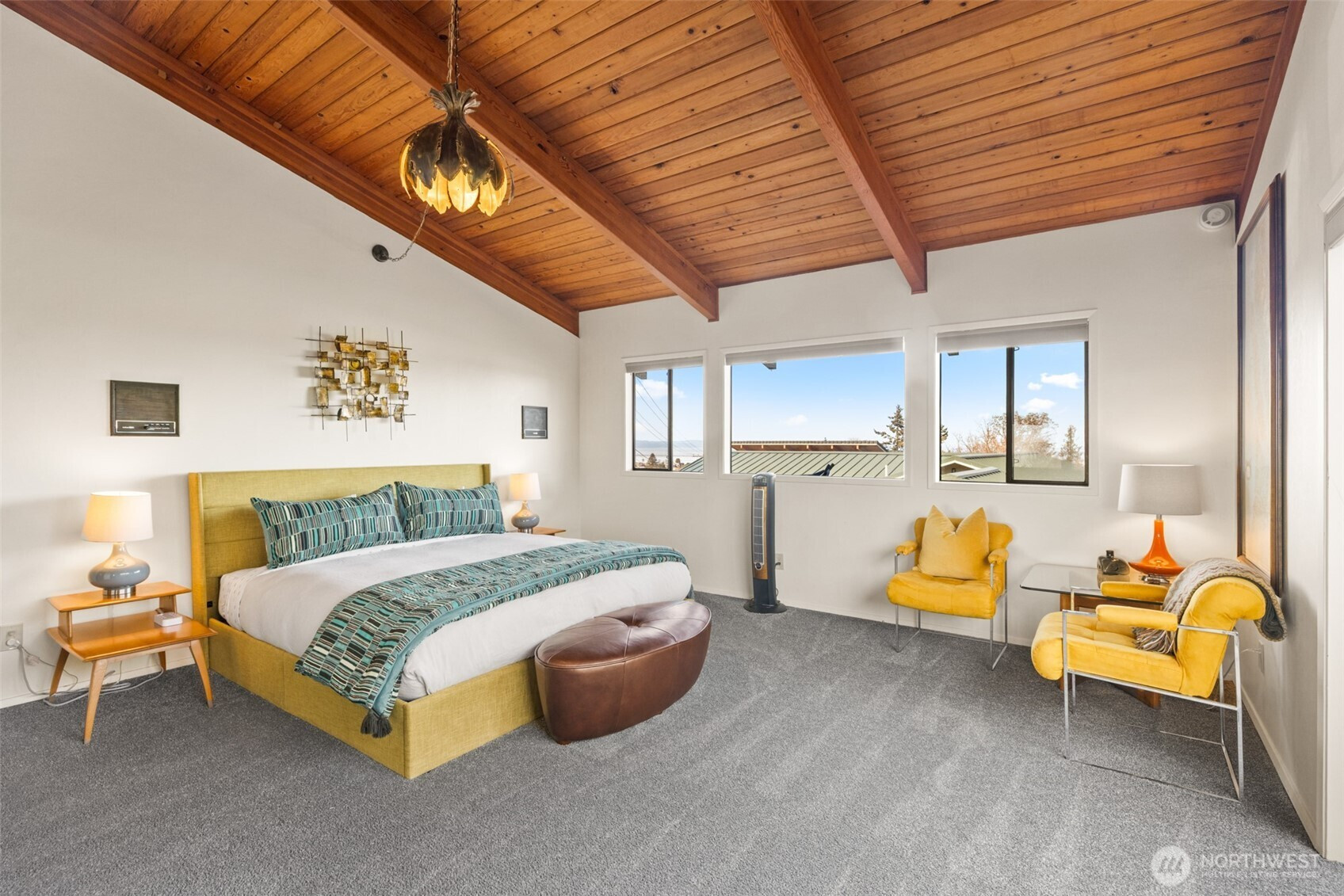 Experience a rare intersection of 1970s contemporary architecture and Pacific Northwest natural beauty. This DelGuzzi-built legacy home, located in the highly desirable Cresthaven neighborhood, is a meticulously preserved split-level masterpiece that channels a sophisticated post-modern, mid-century California vibe. The journey begins with grand stairs leading to a dramatic entry. Inside, the residence reveals soaring interiors characterized by vaulted wood ceilings and rich cedar paneling. The light-filled floor plan is defined by massive windows that frame the rugged beauty of the PNW, offering a front-row seat to stunning sunrise and sunset views over the Strait of Juan de Fuca. At the heart of the home sits an original, full-wall stone fireplace, serving as a monumental focal point for the main living area. Every corner of this property reflects the intentional design and quality craftsmanship of a bygone era, kept in pristine condition for the modern connoisseur.