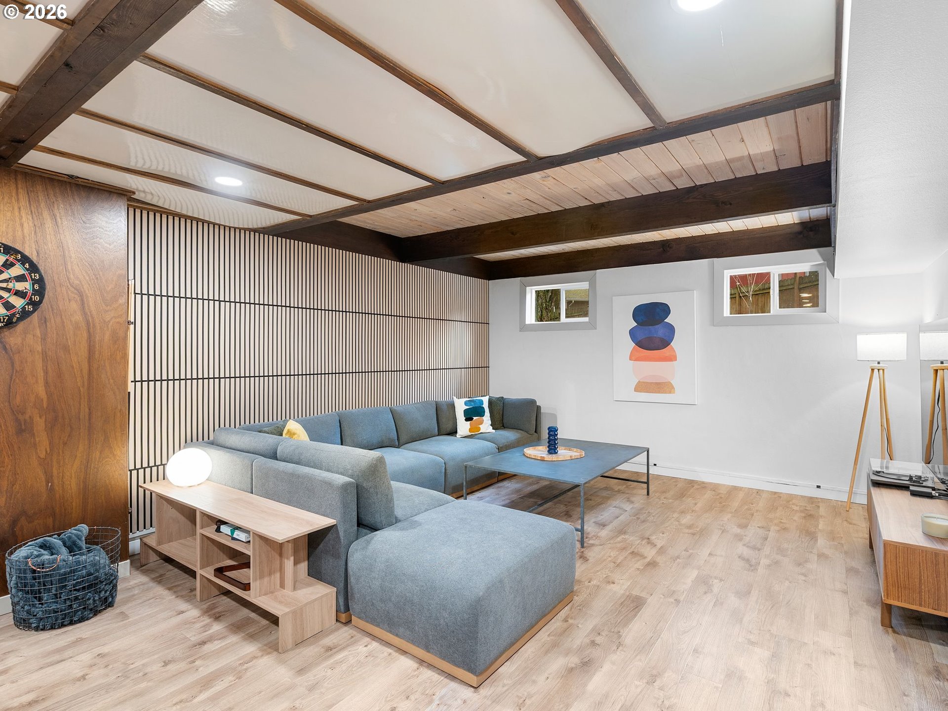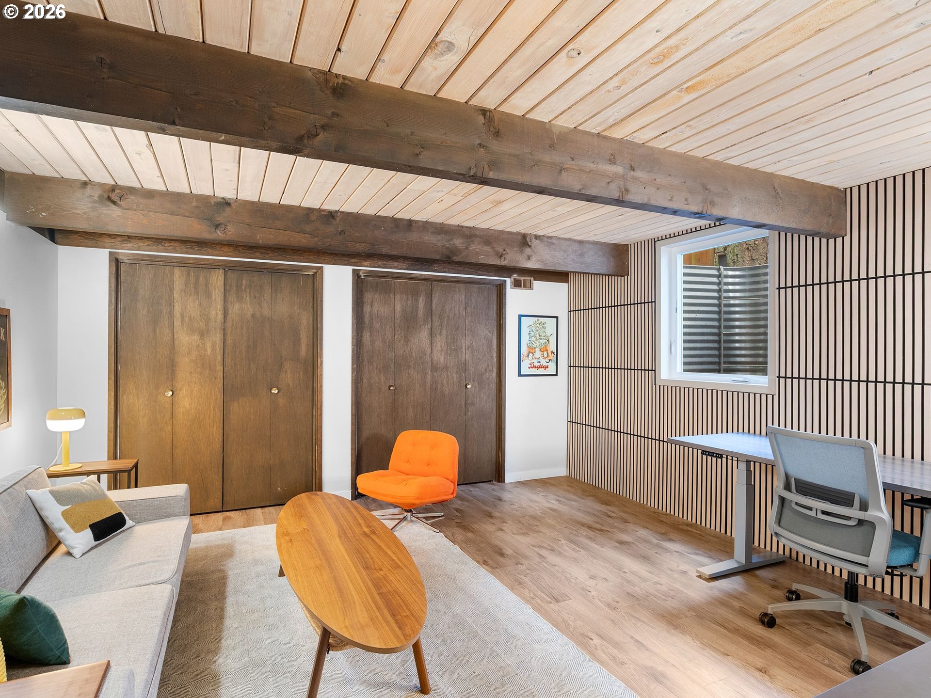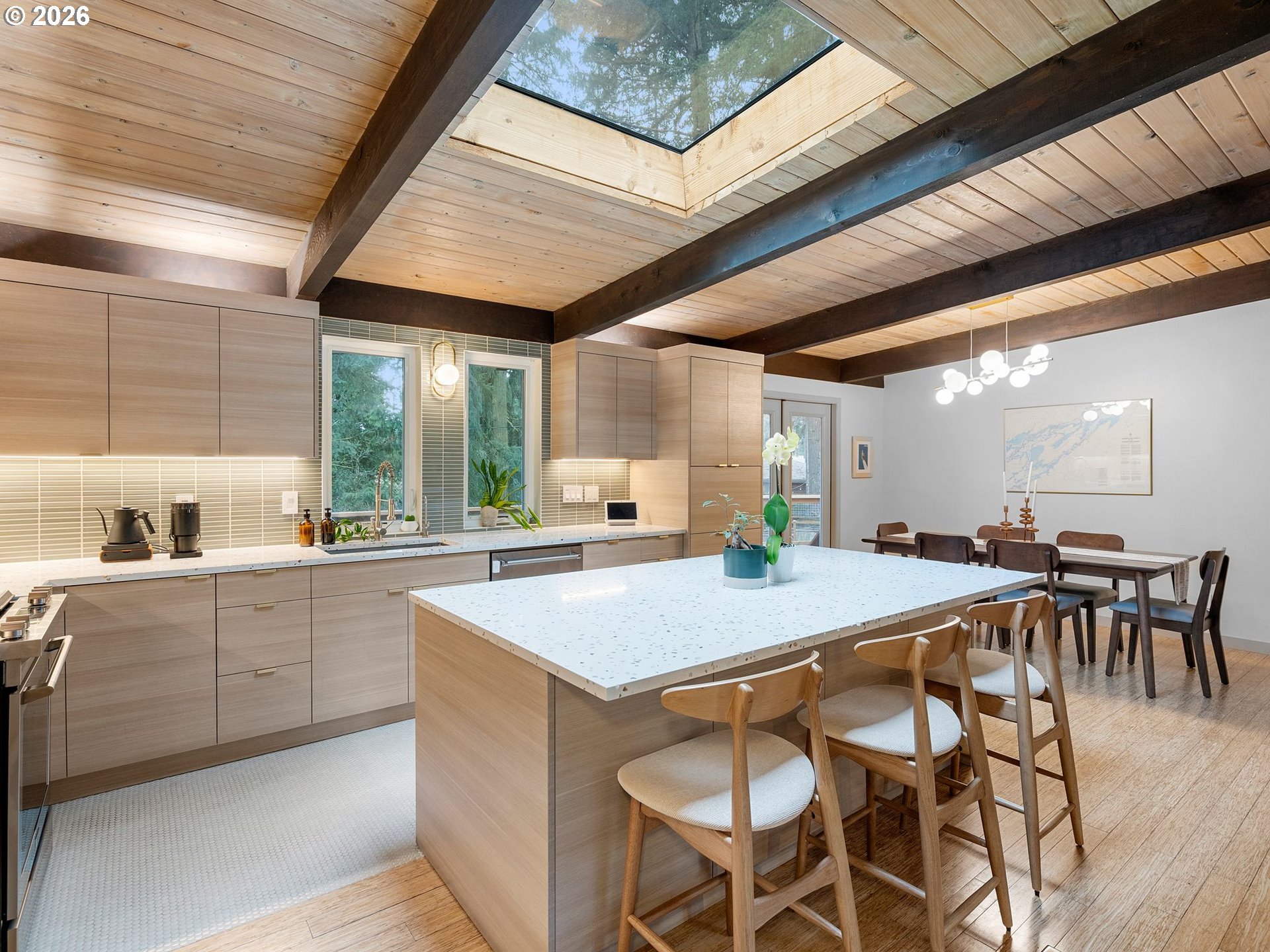 Beautifully updated Mid-Century Modern home situated on an oversized lot surrounded by mature trees. Offering 4 bedrooms, 2.1 bathrooms, and 3,218 square feet, this home blends classic architecture with thoughtful updates. Enjoy the ease of accessibility with 3 bedrooms and primary living spaces all conveniently located on the main floor (no stairs required!). Vaulted wood-beam ceilings, skylights, and expansive windows flood the main floor’s living areas and bedrooms with natural light. A striking stone fireplace anchors the living room which blends into the kitchen and dining areas. The fully renovated kitchen features contemporary finishes, sleek cabinetry, new appliances, and an abundance of storage space. All bathrooms have been tastefully remodeled with modern fixtures/finishes and include crowd favorites like a soaking tub in the guest bath and heated floors in the Primary's ensuite bath. The daylight basement expands the living area via a massive family room with sliding doors that open to a private patio complete with hot tub and access to back yard. A newly conforming 4th bedroom plus additional flex space with Woodstove and garage access complete the lower level. Garage has been finished with sheetrock, epoxy flooring, new garage door, and wired for EV charging. The kitchen, all bathrooms, and main floor utility room have been completely renovated. Additional upgrades include electrical panels, furnace, tankless water heater,basement windows,egress window for 4th bedroom,solid wood doors throughout, and connection to city sewer! Enjoy the large fenced lot with huge deck, patio spaces, raised beds, tool shed, and plenty of options for boat/rv storage.