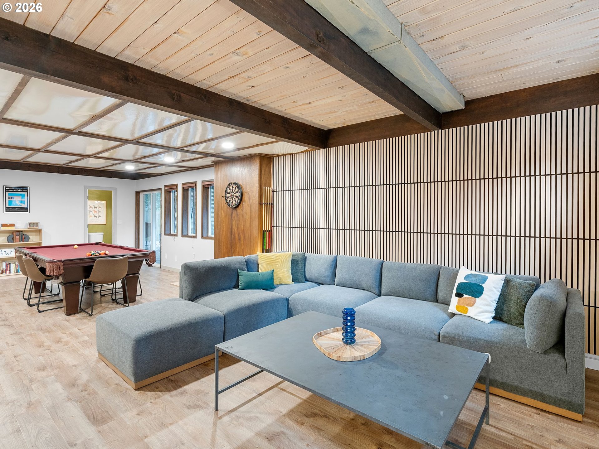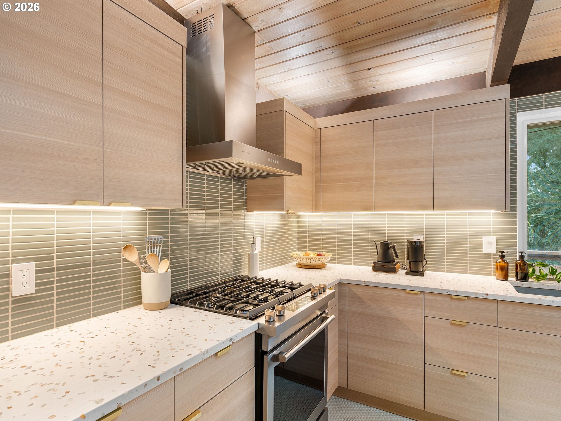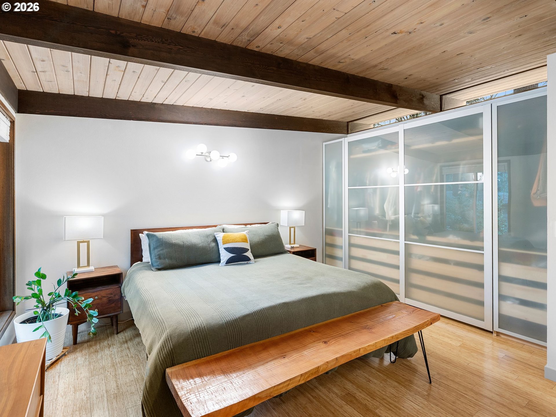 Beautifully updated Mid-Century Modern home situated on an oversized lot surrounded by mature trees. Offering 4 bedrooms, 2.1 bathrooms, and 3,218 square feet, this home blends classic architecture with thoughtful updates. Enjoy the ease of accessibility with 3 bedrooms and primary living spaces all conveniently located on the main floor (no stairs required!). Vaulted wood-beam ceilings, skylights, and expansive windows flood the main floor’s living areas and bedrooms with natural light. A striking stone fireplace anchors the living room which blends into the kitchen and dining areas. The fully renovated kitchen features contemporary finishes, sleek cabinetry, new appliances, and an abundance of storage space. All bathrooms have been tastefully remodeled with modern fixtures/finishes and include crowd favorites like a soaking tub in the guest bath and heated floors in the Primary's ensuite bath. The daylight basement expands the living area via a massive family room with sliding doors that open to a private patio complete with hot tub and access to back yard. A newly conforming 4th bedroom plus additional flex space with Woodstove and garage access complete the lower level. Garage has been finished with sheetrock, epoxy flooring, new garage door, and wired for EV charging. The kitchen, all bathrooms, and main floor utility room have been completely renovated. Additional upgrades include electrical panels, furnace, tankless water heater,basement windows,egress window for 4th bedroom,solid wood doors throughout, and connection to city sewer! Enjoy the large fenced lot with huge deck, patio spaces, raised beds, tool shed, and plenty of options for boat/rv storage.