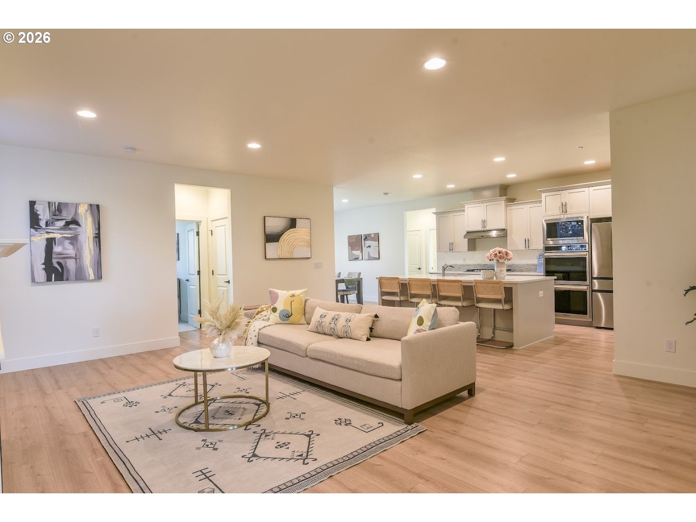 Step into this stunning ranch-style home where modern luxury meets everyday comfort, featuring a spacious three-car garage, high ceilings, and a bright open great room that flows into a chef-inspired kitchen with quartz counters and stainless-steel appliances. The private primary suite offers a spa-like walk-in shower and oversized closet, while the low-maintenance backyard is perfect for relaxing or entertaining. Move-in ready, beautifully finished, and designed to impress—this home is ready to welcome its next owner.