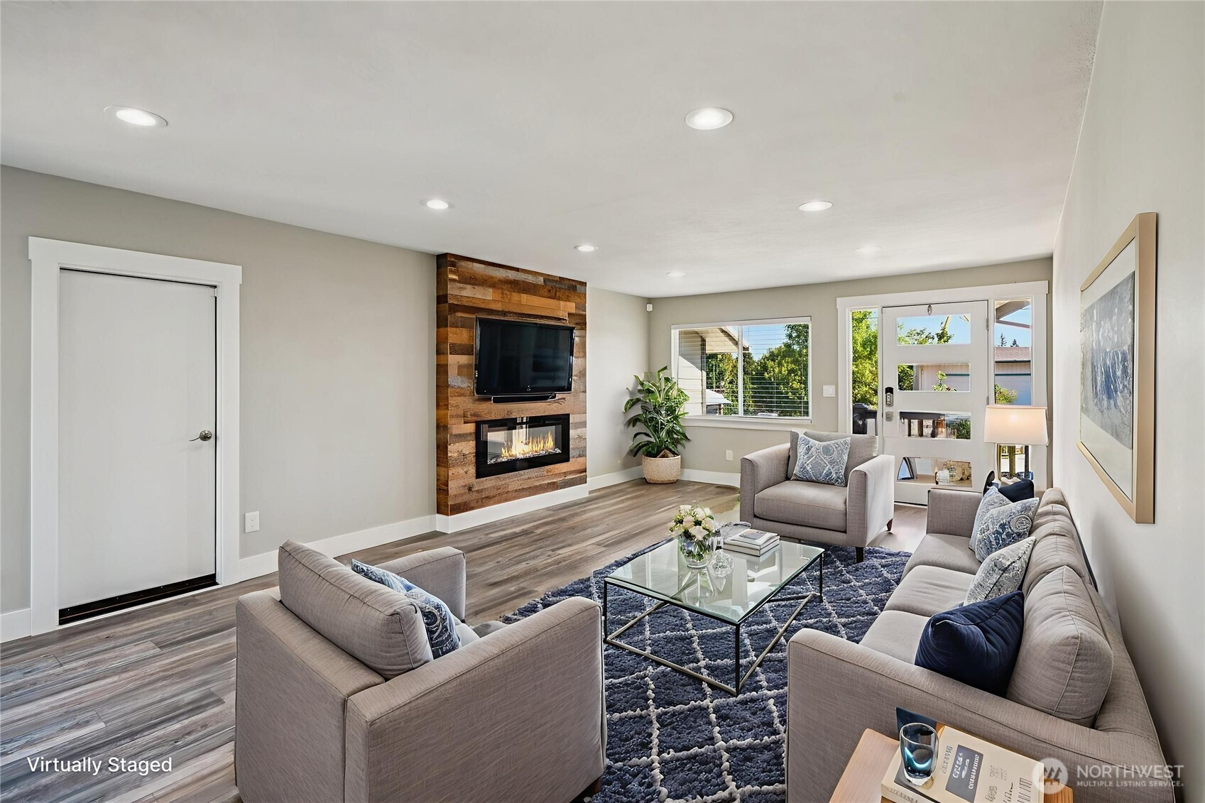 Fully remodeled Mid-Century home in Felida, with floor-to-ceiling windows & abundant natural light. The open living & dining areas showcase an electric fireplace framed by a wood accent wall. The kitchen features built-in ovens, a gas cooktop/custom hood, large quartz island, & an adjoining flex space. Decorative door off kitchen to the larger of two decks. Primary suite with walk-in closet & luxurious ensuite bath. Two additional bedrooms, one oversized with two closets, a full bath, & laundry room offer exceptional storage. Unique touches include a root cellar & exposed beams. Two-car garage, parking pad, carport, & X-Large RV parking— up to six vehicles. Shed out back, space for a dog run & garden! Close to amenities & great schools!