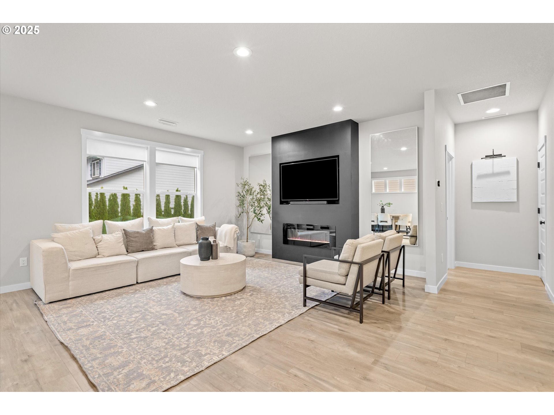 Impeccably cared-for, like-new one level home on a premium lot! This 3-bedroom, 2-bath gem combines effortless comfort with modern design and thoughtful upgrades throughout. The open-concept floor plan welcomes you with a stunning custom fireplace and TV accent wall, upgraded flooring in all bedrooms, and elegant baseboards that add a refined touch. The chef’s kitchen is the heart of the home—featuring a spacious island, upgraded quartz countertops, and a range ready for both electric and gas. Both bathrooms also showcase upgraded quartz counters and tile flooring, offering a clean, elevated aesthetic. Step outside to your private backyard retreat complete with a custom covered patio featuring lighting and a pre-wire for a fan, perfect for year-round enjoyment. Permanent Christmas lights, pre-wired landscape lighting, a camera-ready front floodlight, and a rear retaining wall all add value and convenience. Privacy landscaping, reseeded lawn, and freshly refreshed bark dust complete the picture. Lovingly maintained and prepped for every season, this home truly stands out for its quality, care, and move-in-ready perfection. Welcome Home.