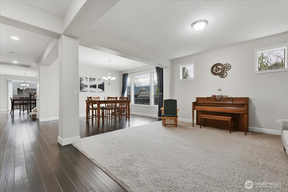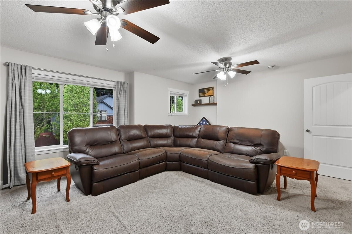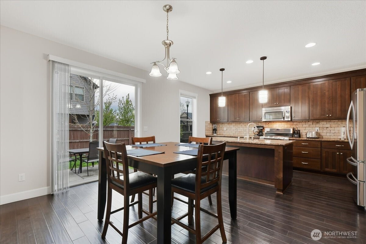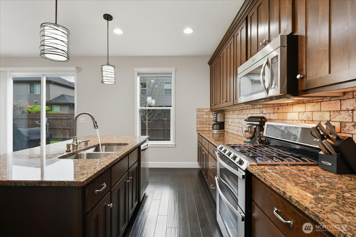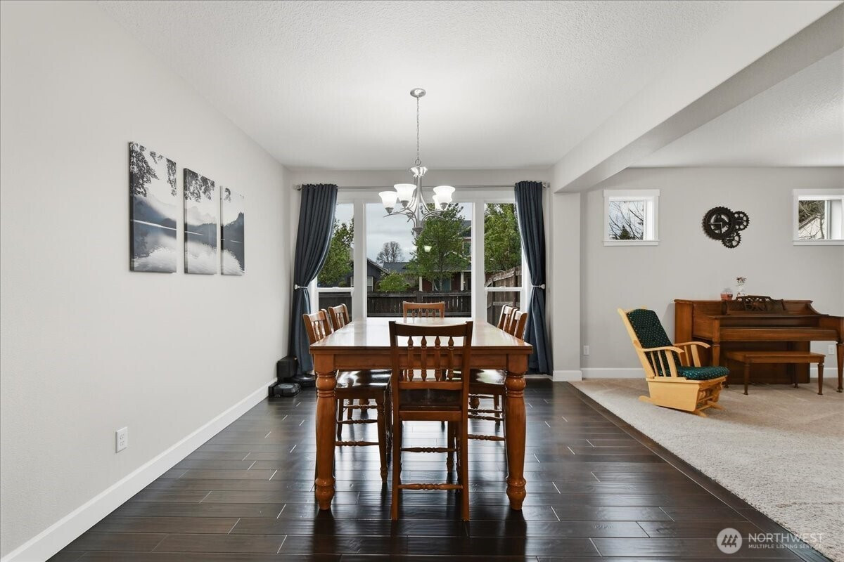 The word spacious just doesn't do this 5-bed, 2.1-bath home enough justice. On the main level, 1540 sqft of high-ceilinged, open & flowing design offer a sense of calm coziness. Rich & sturdy engineered hardwood floors in the kitchen and dining areas are balanced by carpeted living spaces, providing a smooth sense of transition between formal and casual areas of the main. The kitchen offers granite counters, a walk-in pantry, and an island with double sink & breakfast bar. As part of the great room design, the family room is comfortably centered around a gas fireplace, with a view of the backyard. A main level office provides a bit of seclusion. Upstairs, the 5 bedrooms and bonus room are impressively spread over 1940 sqft. The bonus room is wired for surround sound. The primary suite is made luxurious with separate vanities, a tile walk-in shower, and a soaking tub. A walk-in closet completes the primary suite trifecta. The 2nd full bath offers a double vanity, ensuring less fighting for sink space! Laundry on the upper has a tile floor and an air circulation system to keep things fresh! The water heater is tankless. Out back, you'll find a patio, and the backyard is fully fenced. In front, a covered front porch with no steps offers a happy view of this sweet corner lot. And the cherry on top of all this: Original owners have taken loving care of what is truly a fantastic home. It's dialed in & ready to be yours!