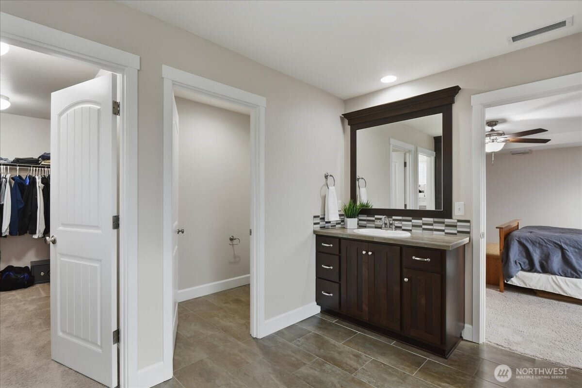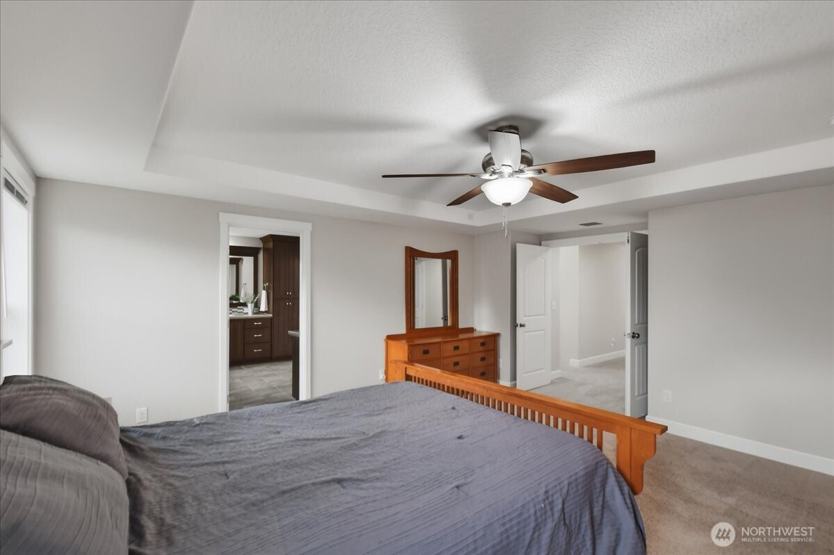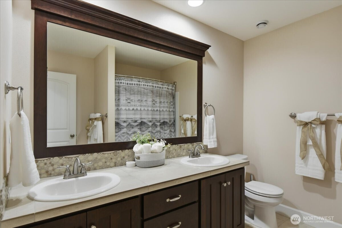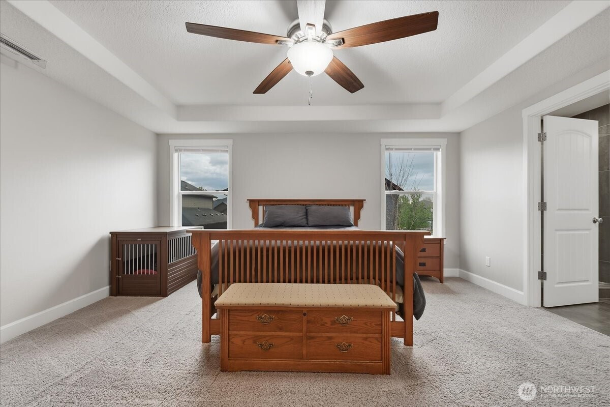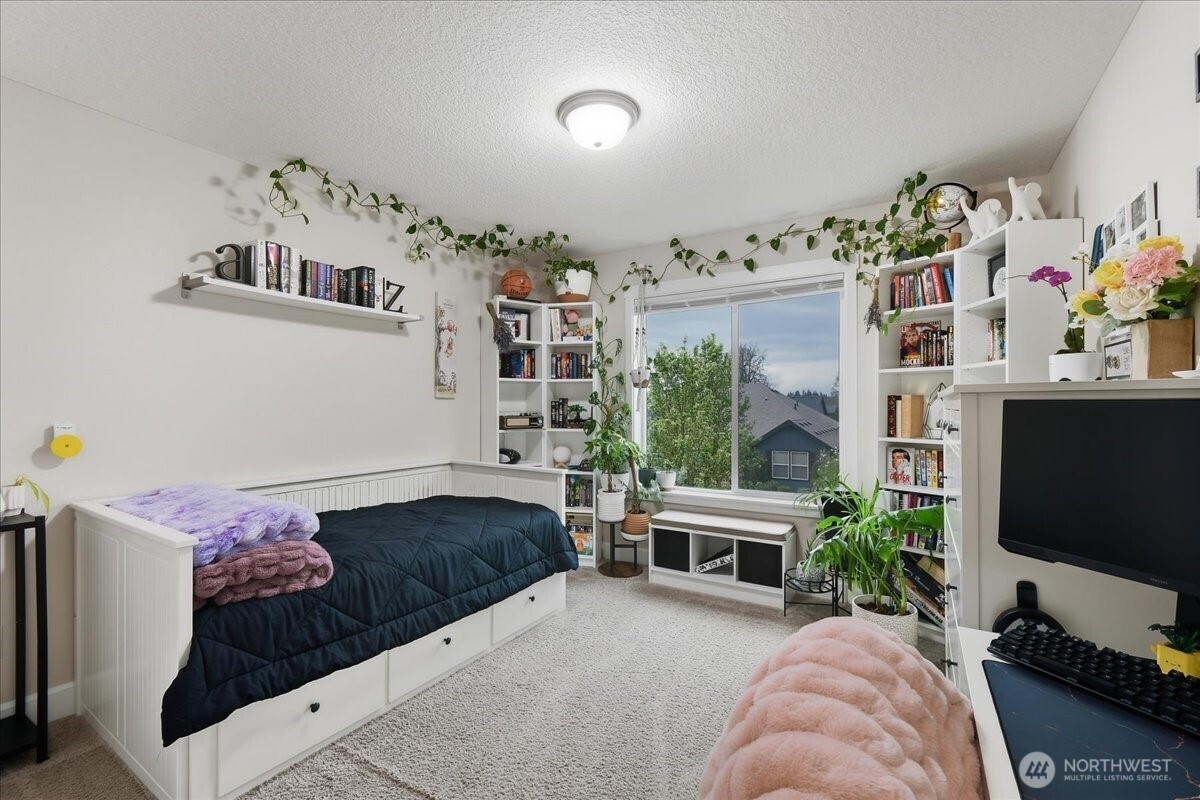 The word spacious just doesn't do this 5-bed, 2.1-bath home enough justice. On the main level, 1540 sqft of high-ceilinged, open & flowing design offer a sense of calm coziness. Rich & sturdy engineered hardwood floors in the kitchen and dining areas are balanced by carpeted living spaces, providing a smooth sense of transition between formal and casual areas of the main. The kitchen offers granite counters, a walk-in pantry, and an island with double sink & breakfast bar. As part of the great room design, the family room is comfortably centered around a gas fireplace, with a view of the backyard. A main level office provides a bit of seclusion. Upstairs, the 5 bedrooms and bonus room are impressively spread over 1940 sqft. The bonus room is wired for surround sound. The primary suite is made luxurious with separate vanities, a tile walk-in shower, and a soaking tub. A walk-in closet completes the primary suite trifecta. The 2nd full bath offers a double vanity, ensuring less fighting for sink space! Laundry on the upper has a tile floor and an air circulation system to keep things fresh! The water heater is tankless. Out back, you'll find a patio, and the backyard is fully fenced. In front, a covered front porch with no steps offers a happy view of this sweet corner lot. And the cherry on top of all this: Original owners have taken loving care of what is truly a fantastic home. It's dialed in & ready to be yours!
