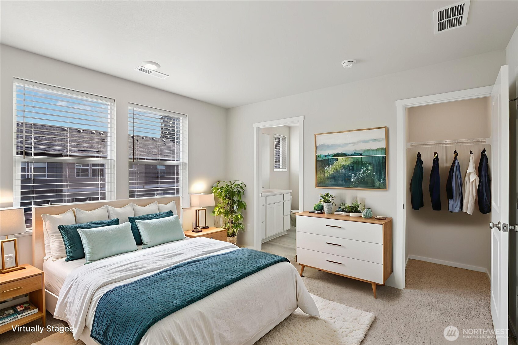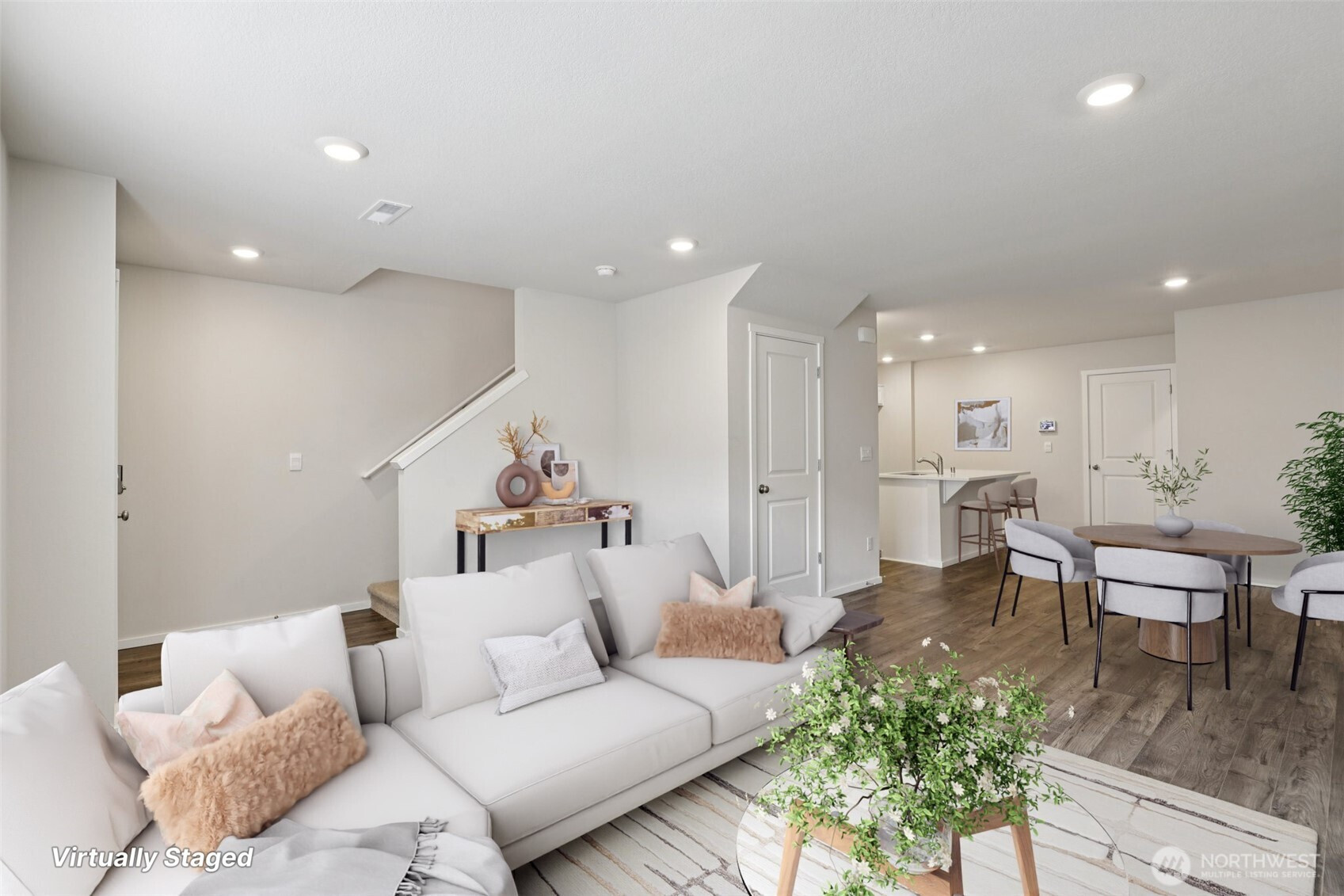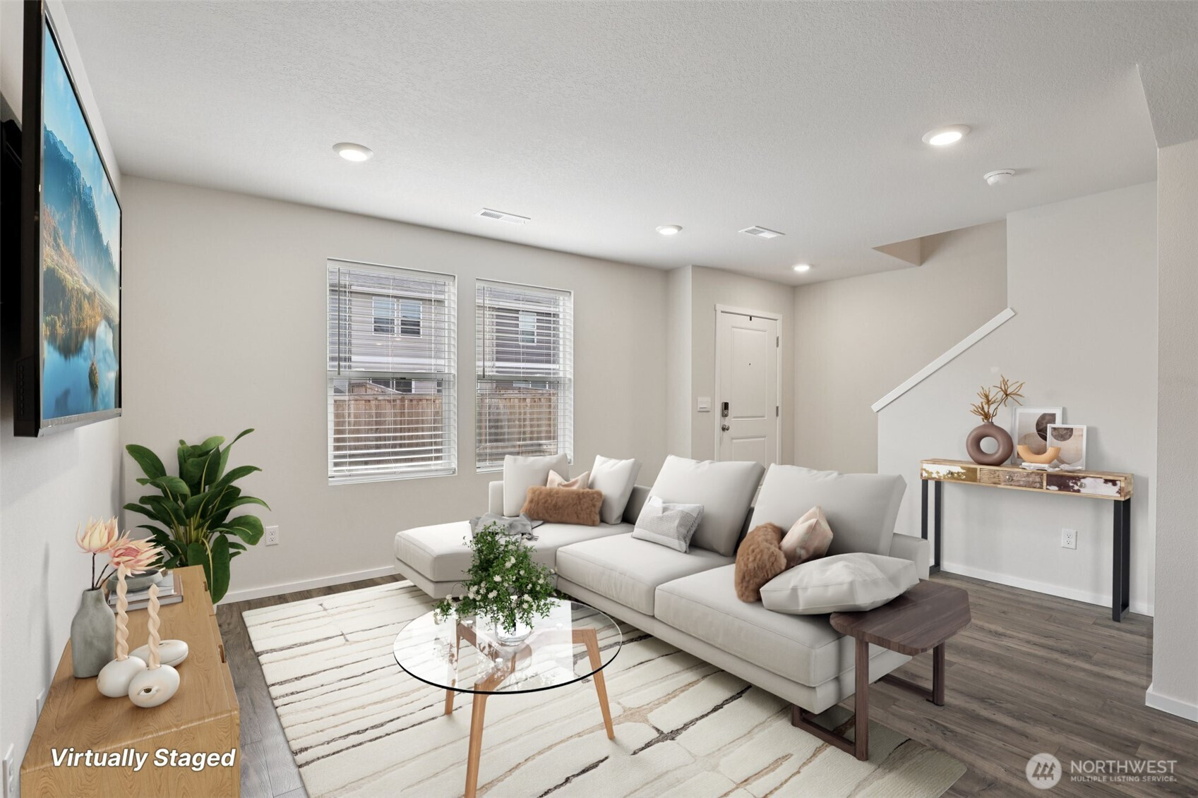 Inviting open-concept main level showcasing a spacious living area, dining area, and kitchen adorned with crisp white cabinetry, a quartz island, and a generous pantry. Upstairs, the primary suite offers dual walk-in closets and ensuite.A versatile loft, a dedicated laundry room, and two additional bedrooms. Abundant storage is thoughtfully integrated throughout. The home also features a two-car garage (EV Charging) with wide alley access, a fully fenced front yard, and ample guest parking. Meandering, well-kept pathways lend charm to the community, with a park just steps away and everyday amenities close at hand. Enhanced with thoughtful details—window coverings and a wall-mounted living room TV remain—this residence feels better than new.