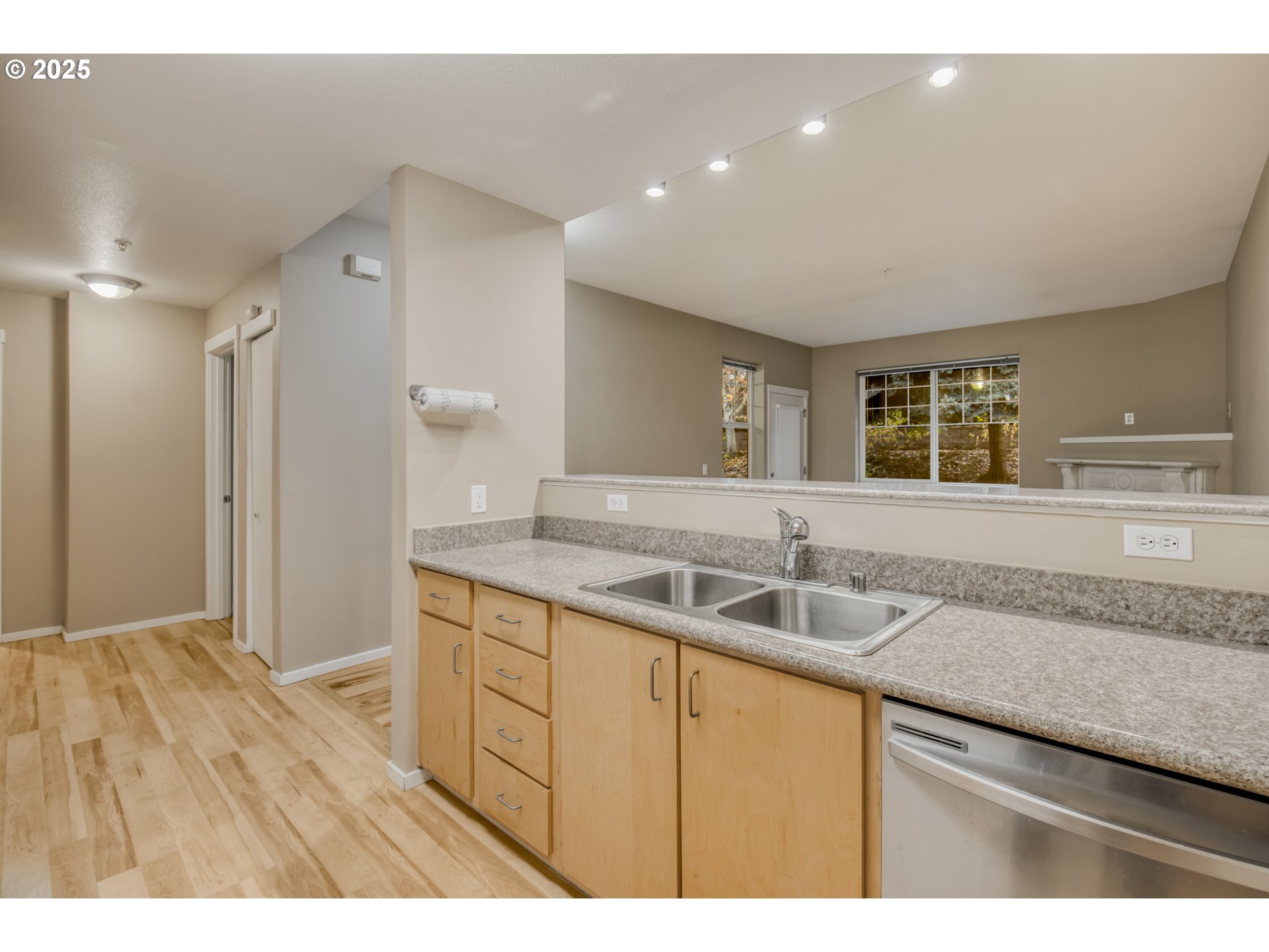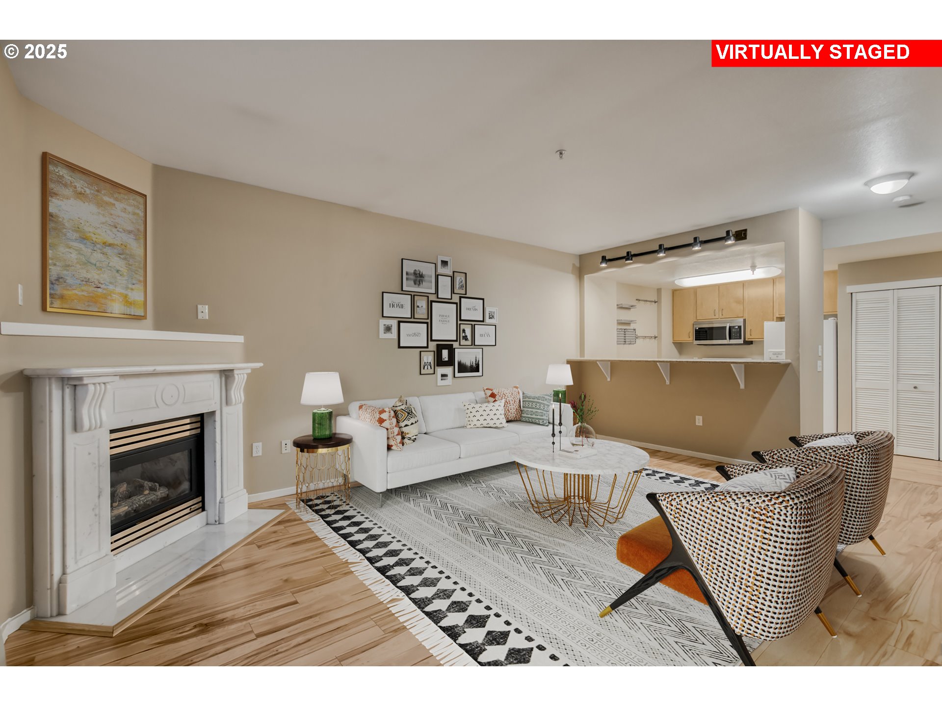 This ground-level condo enjoys one of the most desirable locations in the entire community. The complex is quiet, well cared for, and offers a relaxed, welcoming atmosphere. Inside, the single-level layout feels open and spacious, enhanced by high ceilings and large windows that fill the home with natural light. The kitchen features granite countertops and a bar-height counter ideal for casual meals or entertaining. A cozy gas fireplace anchors the living room, creating a comfortable space to unwind. The generous primary suite includes oversized closet and a private ensuite with a shower and an oversized vanity. Step onto your covered patio—complete with a gas hookup for grilling—and enjoy outdoor living in every season. An attached garage provides secure parking and the convenience of a private interior entrance. The community offers exceptional amenities, and this unit is just steps away, from the clubhouse with lounge and meeting areas, a fitness room, outdoor pool, and hot tub.