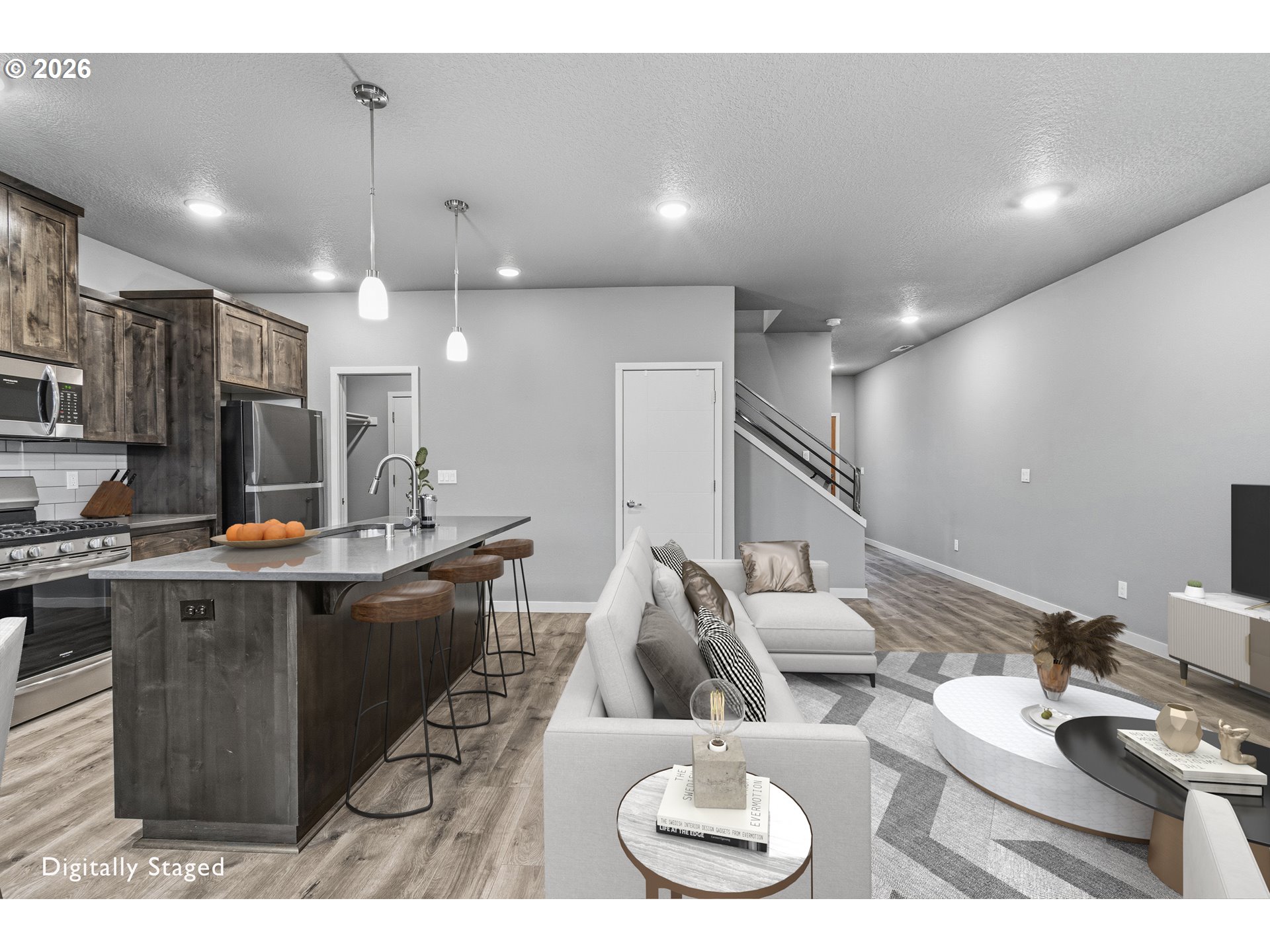 Immaculately kept end unit townhouse. Contemporary style home with high ceilings and an open concept floor plan. Like new feel with designer touches throughout. 2-car garage with decorative glass door and tankless water heater. Durable LVP flooring throughout the main level, along with an open kitchen, living and dining area. The kitchen includes a breakfast bar/center island, complete with quartz countertops and a “jumbo sink”. Economical gas stovetop and a gas fireplace with a wood surround. The main floor also has a convenient ½ bath and storage space. The 2nd floor includes a large landing/loft area suitable for an office, gaming area or exercise space. The large master bedroom is complete with tall glass windows for abundant sunlight. The oversized master bathroom is built with elegant dual vanities, recessed sinks, quartz countertops, tile backsplash and a beautiful tile walk-in shower, along with a walk-in closet. Laundry room with high-capacity front end LG washer/dryer. All high-end appliances are included in sale. Dogwood Neighborhood Park blocks away, along with stores and restaurants.
