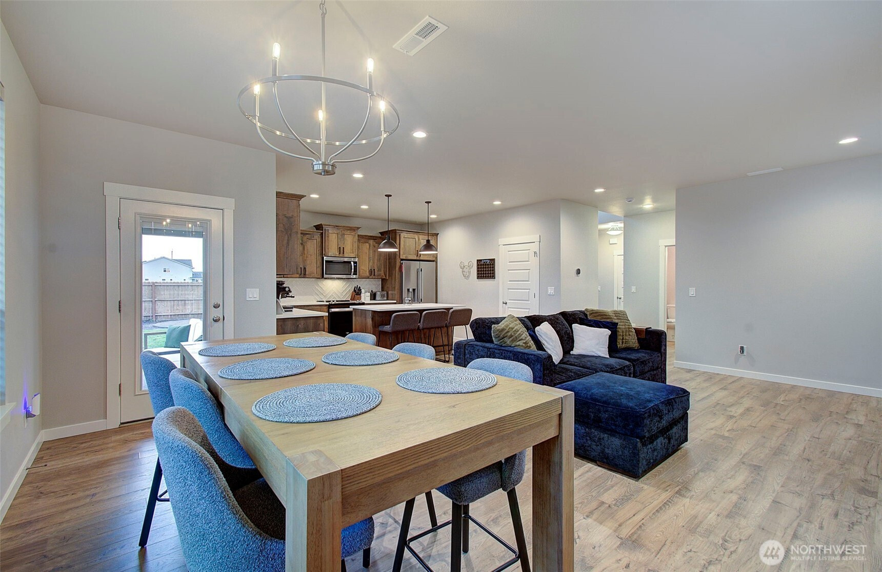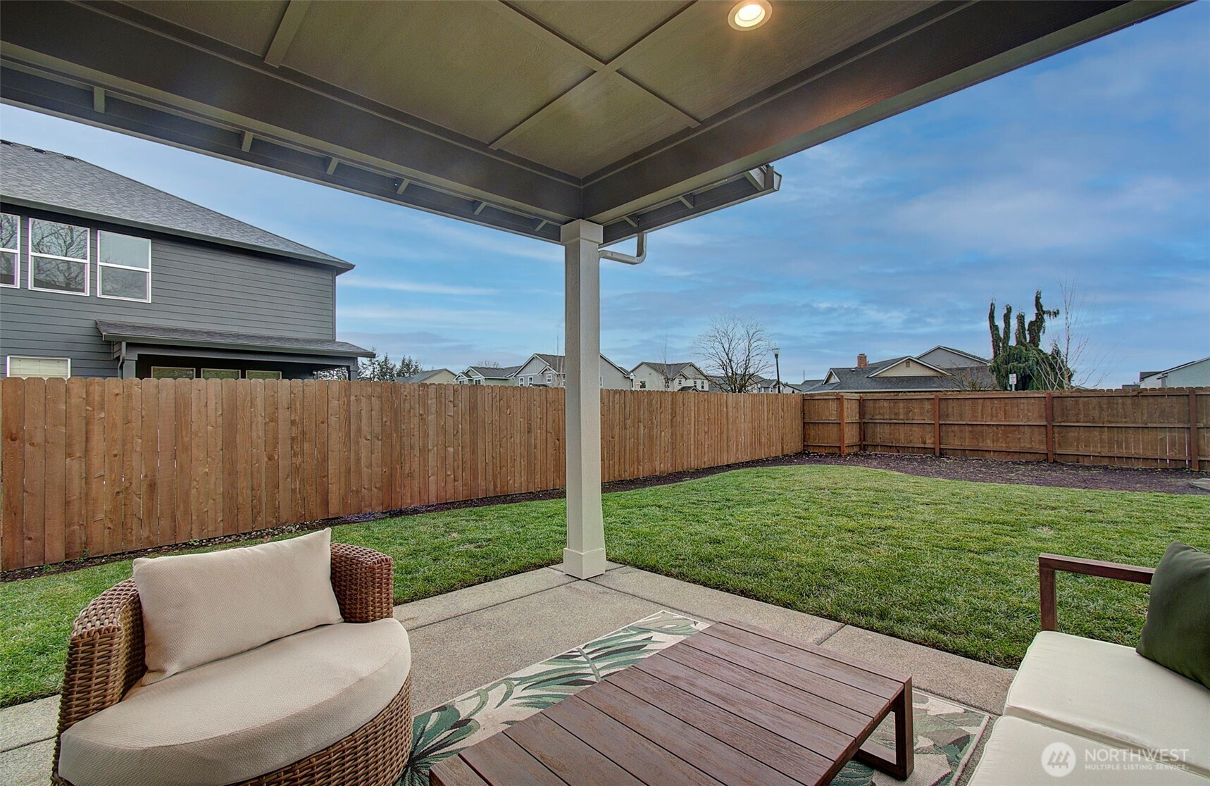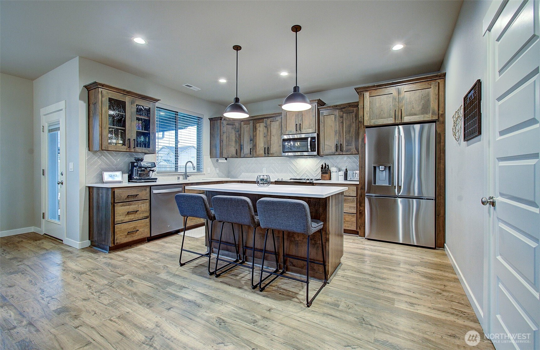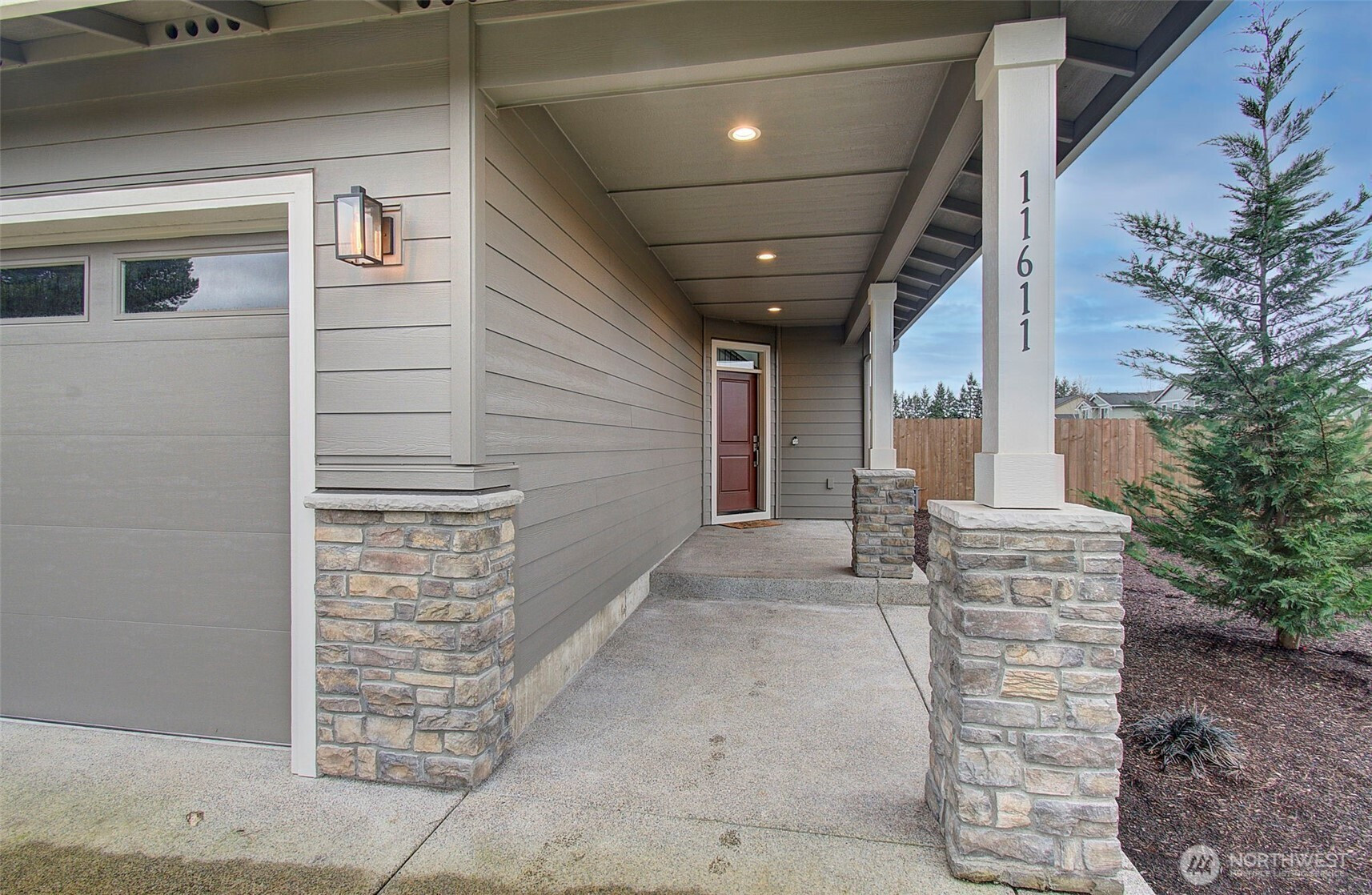 2024 build on large double corner lot near greenspace and open field. 2,295 sf with 4 bedrooms & main-floor den with French doors and 2 full baths. Quartz island kitchen with pantry, soft-close cabinets, stainless appliances and refrigerator included. Great room opens to a 13x11 covered patio and oversized fenced yard with sprinklers and above-ground pool negotiable. Primary suite features custom walk-in closet, soaking tub and walk-in shower. Washer and dryer included. Heat pump with AC, smart thermostat, luxury vinyl plank floors and finished 2-car garage. Enjoy modern finishes and plenty of smart storage. Nearly .30ac, min to shopping and schools in quiet Brush Prairie. Structural builder warranty believed transferable (buyer to verify).