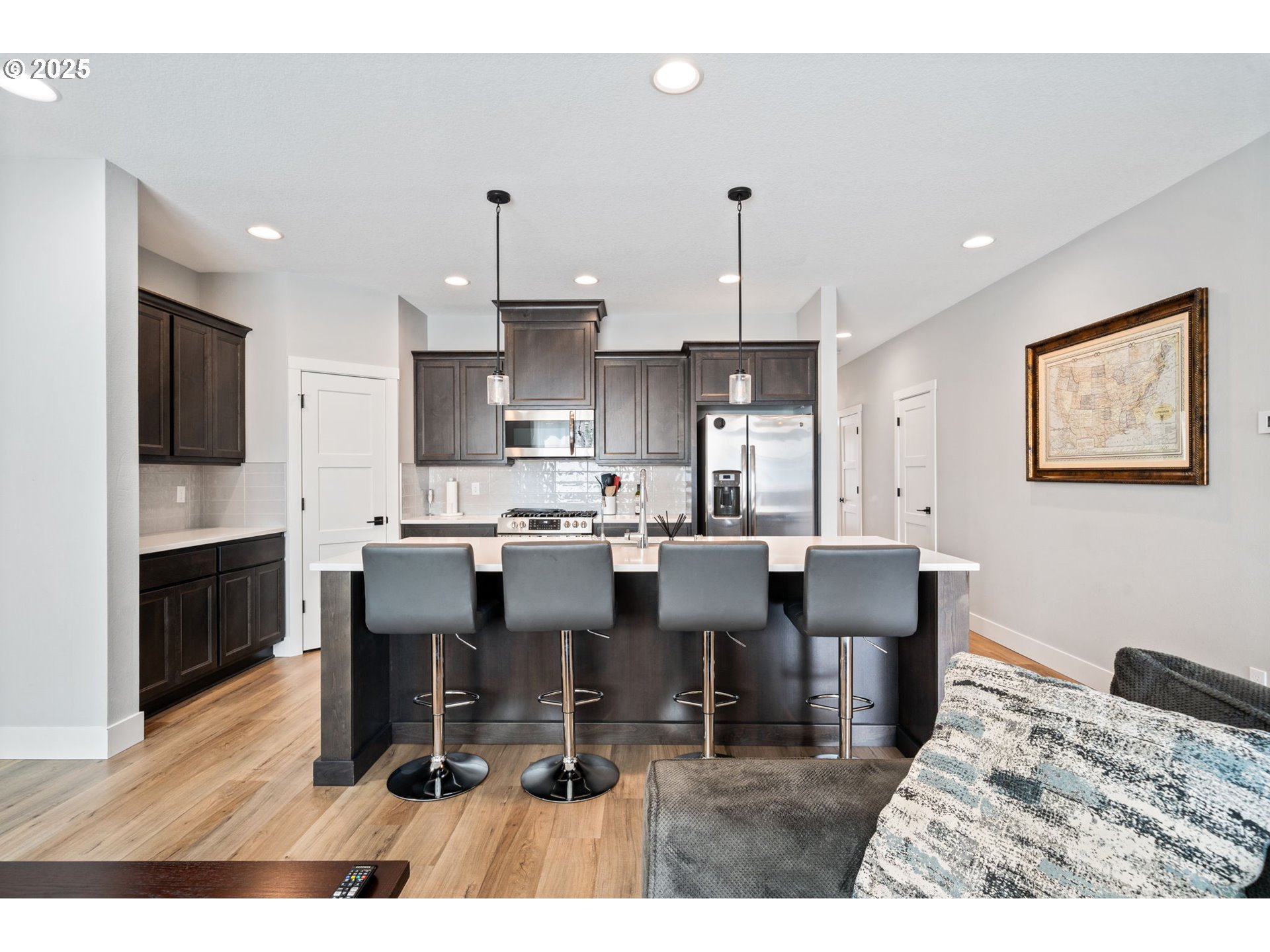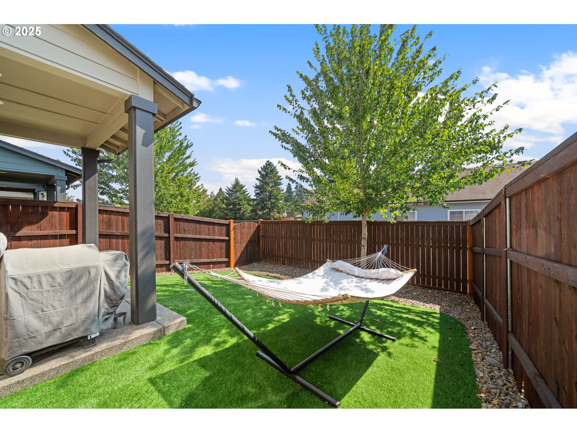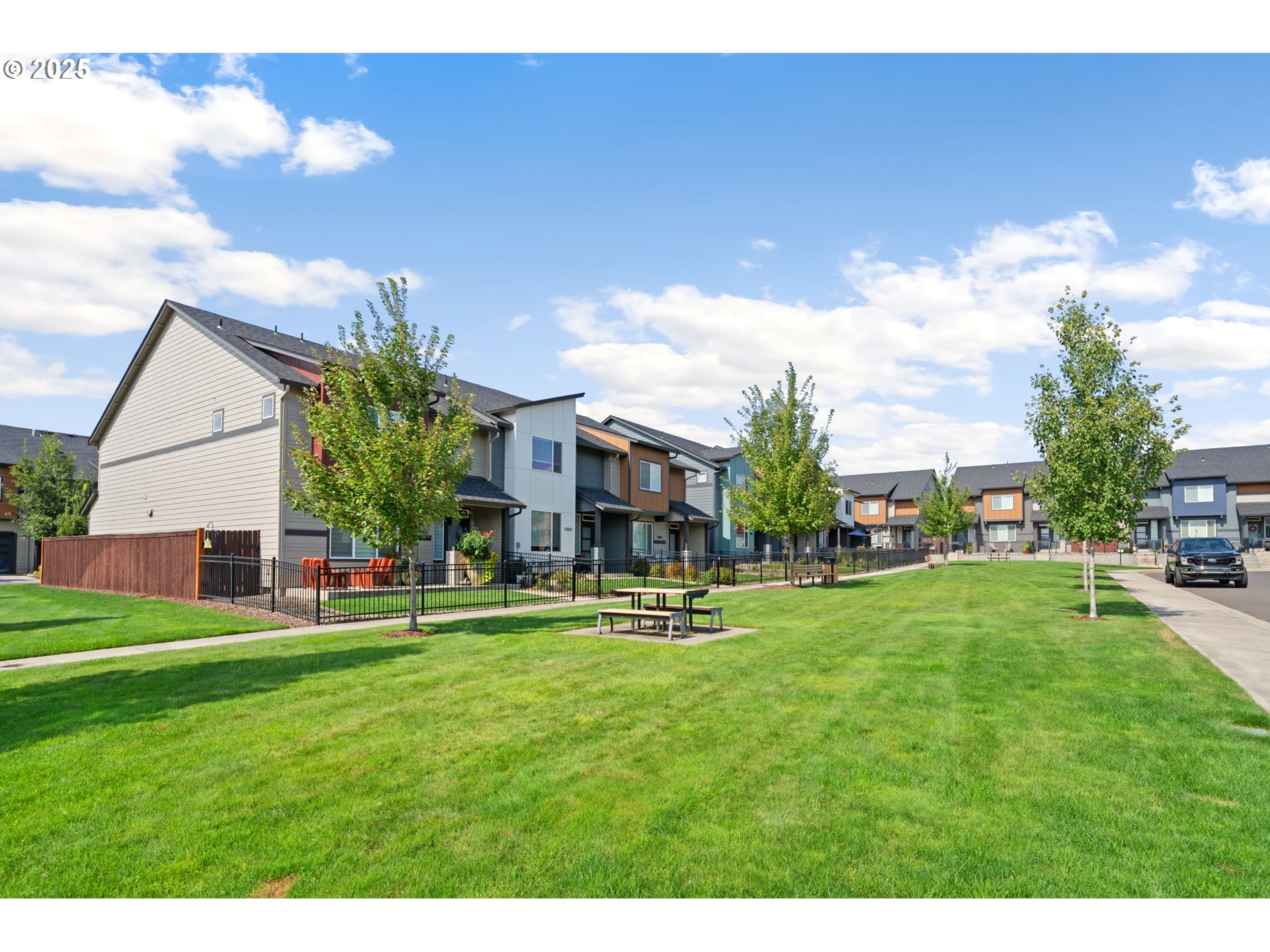 Experience luxurious, low-maintenance living in this stunning NW Contemporary townhome. Designed with modern style and convenience in mind, this home offers both comfort and sophistication. Step outside to a private, fully fenced backyard featuring a covered patio, and easy-care turf lawn—perfect for year-round enjoyment. The community amenities enhance your lifestyle with open green spaces, walking paths, a children’s play area, and gathering spots with tables and benches. Inside, the heart of the home is a show-stopping kitchen featuring a large island, white quartz countertops, modern dark cabinetry, and a spacious corner pantry. A slide-in stainless steel gas range, microwave, and dishwasher elevate both form and function. The open living area is anchored by a sleek linear electric fireplace with a custom shiplap accent wall, creating a warm yet contemporary focal point. Upstairs, discover three generously sized bedrooms plus a versatile loft—ideal for a home office, playroom, or lounge. The primary suite features a walk-in closet with built-in organizers for effortless storage. Bathrooms have been thoughtfully upgraded with white quartz counters and dark cabinetry that combine everyday practicality with spa-like design. Every detail has been curated for style and ease, from the finishes to the floor plan. Whether entertaining friends and family, enjoying quiet evenings by the fire, or exploring the community amenities, this townhome offers the perfect blend of sophistication and comfort in a desirable setting just 15 minutes to Portland.