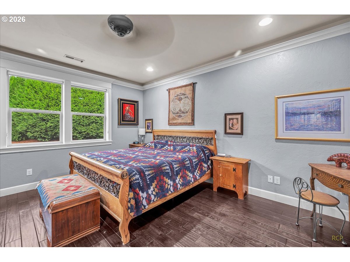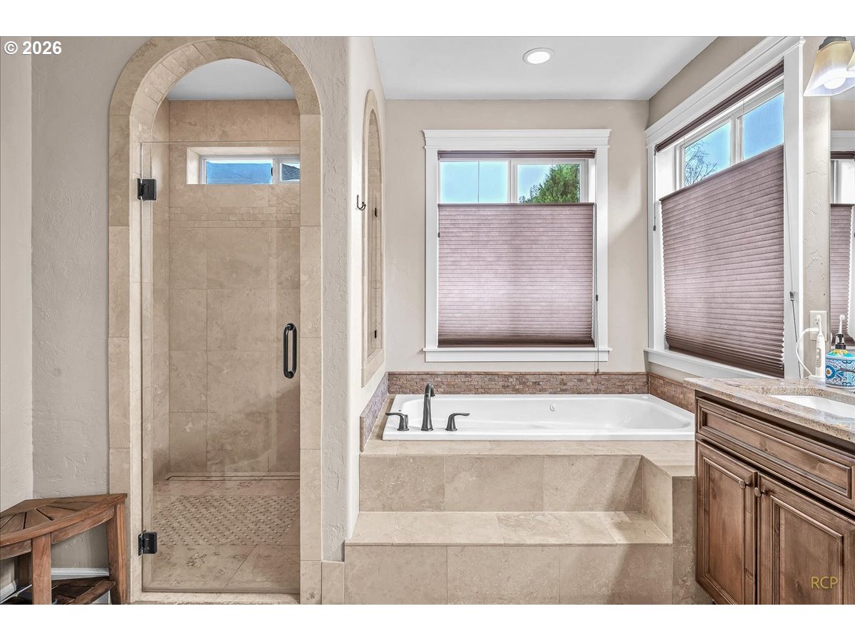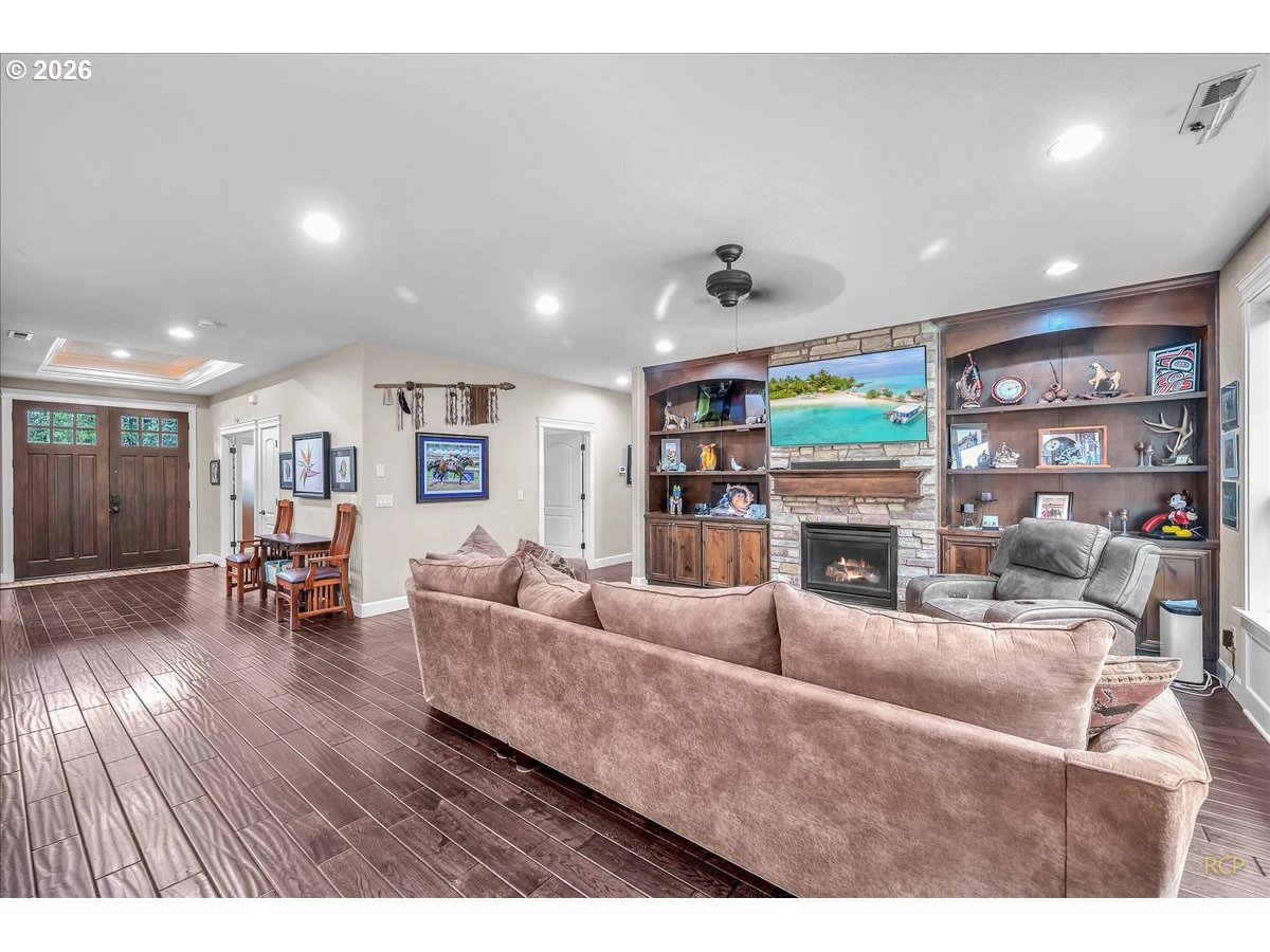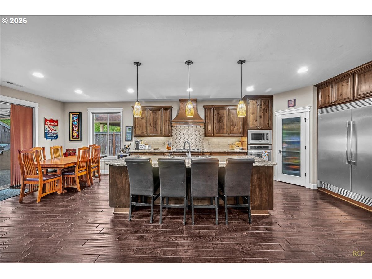 Beautifully-crafted single-level Bella Villa Homes 3 bed, 2 bath open-concept home on large lot offering timeless design and high-quality finishes throughout. You will love the wide hallways, 9’ ceilings, gorgeous hardwood floors, ceiling fans, and excellent natural light. The great room includes custom wood built-ins, a floor-to-ceiling stone fireplace, and a wall of windows overlooking the private backyard. The kitchen is both elegant and functional with granite countertops, stainless appliances, gas range w/ copper hood, built-in oven & microwave, Frigidaire Pro refrigerator, travertine backsplash, oversized island, and walk-in pantry. A formal dining room with wainscoting and fresh paint offers flexibility for a home office or den. The primary suite is a true retreat with heated travertine floors, updated shower with heated floors, and custom closet with massive custom shoe caddy. Outdoor living shines with the Custom outdoor masonry fireplace with stone detailing & metal fire screen, creating a striking focal point for the covered patio and the new built-in BBQ with stone surround, extending outdoor use well into cooler seasons for outdoor entertaining. Large private yard has raised beds, raspberries, grapevines and mature landscaping. Convenient location near shopping, restaurants and transportation. Rare single-level living on quiet cul-de-sac with enduring quality and comfort is a must see!