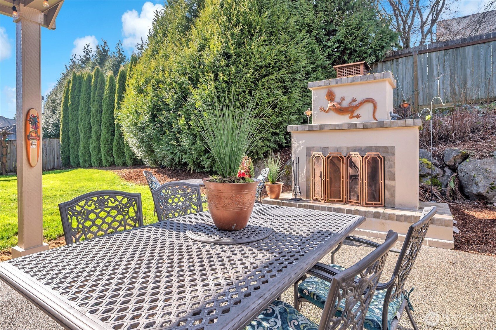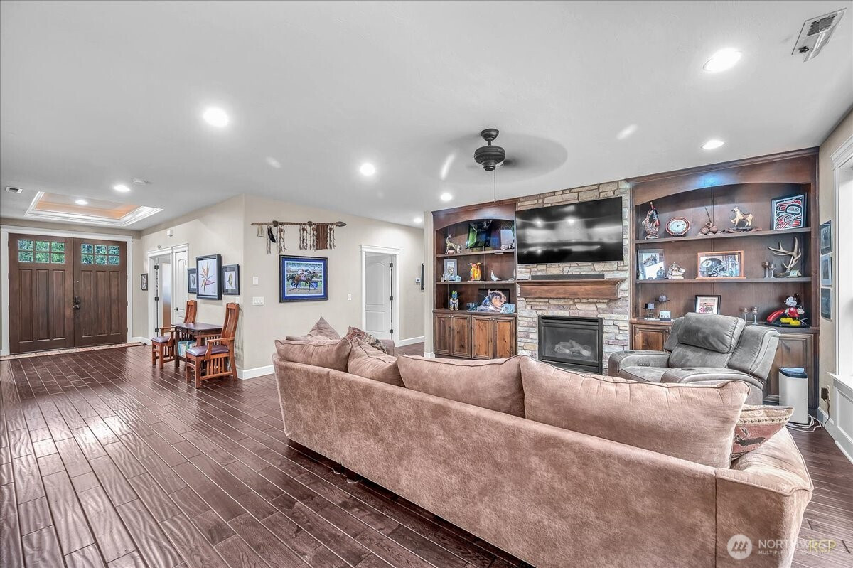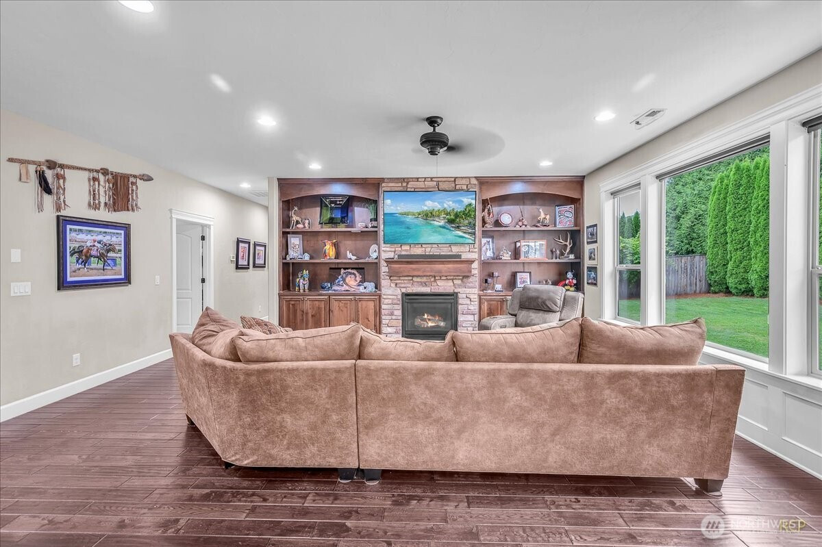 Beautifully-crafted single-level Bella Villa Homes 3 bed, 2 bath open-concept home on large lot offering timeless design and high-quality finishes throughout. You will love the wide hallways, 9’ ceilings, gorgeous hardwood floors, ceiling fans, and excellent natural light. The great room includes custom wood built-ins, a floor-to-ceiling stone fireplace, and a wall of windows overlooking the private backyard. The kitchen is both elegant and functional with granite countertops, stainless appliances, gas range w/ copper hood, built-in oven & microwave, Frigidaire Pro refrigerator, travertine backsplash, oversized island, and walk-in pantry. A formal dining room with wainscoting and fresh paint offers flexibility for a home office or den. The primary suite is a true retreat with heated travertine floors, updated shower with heated floors, and custom closet with massive custom shoe caddy. Outdoor living shines with the Custom outdoor masonry fireplace with stone detailing & metal fire screen, creating a striking focal point for the covered patio and the new built-in BBQ with stone surround, extending outdoor use well into cooler seasons for outdoor entertaining. Large private yard has raised beds, raspberries, grapevines and mature landscaping. Convenient location near shopping, restaurants and transportation. Rare single-level living on quiet cul-de-sac with enduring quality and comfort is a must see!