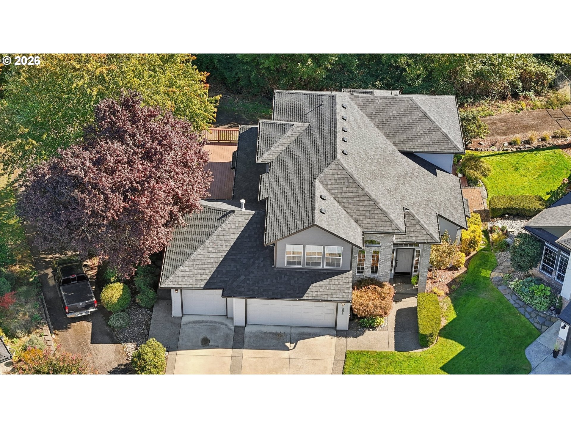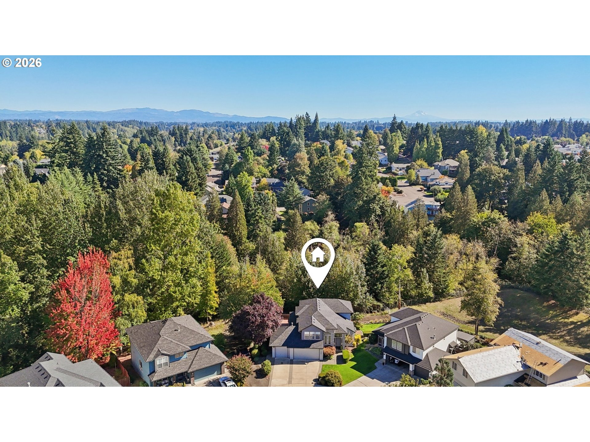 Tucked away on a quiet cul-de-sac, this well-maintained 2-story home offers privacy, functionality, & an exceptional location. Situated on a greenbelt lot backing to Cougar Creek, the property provides peaceful territorial views & added privacy, w/ convenient access just one block away to the Cougar Creek path.The versatile floor plan includes a Den/bdrm on the main level, ideal for guests, multi-generational living, or a home office. Hardwood floors enhance the main living areas, & the layout offers comfortable living & entertaining spaces throughout. Enjoy the private backyard setting with a deck designed for outdoor gatherings & relaxation. Additional features include a 3-car garage, newer roof, newer exterior paint, & central air conditioning for year-round comfort. The home is plumbed for central vacuum & pre-wired for a security system. Located within a top-rated school district, this property combines a desirable setting with thoughtful updates and strong curb appeal.