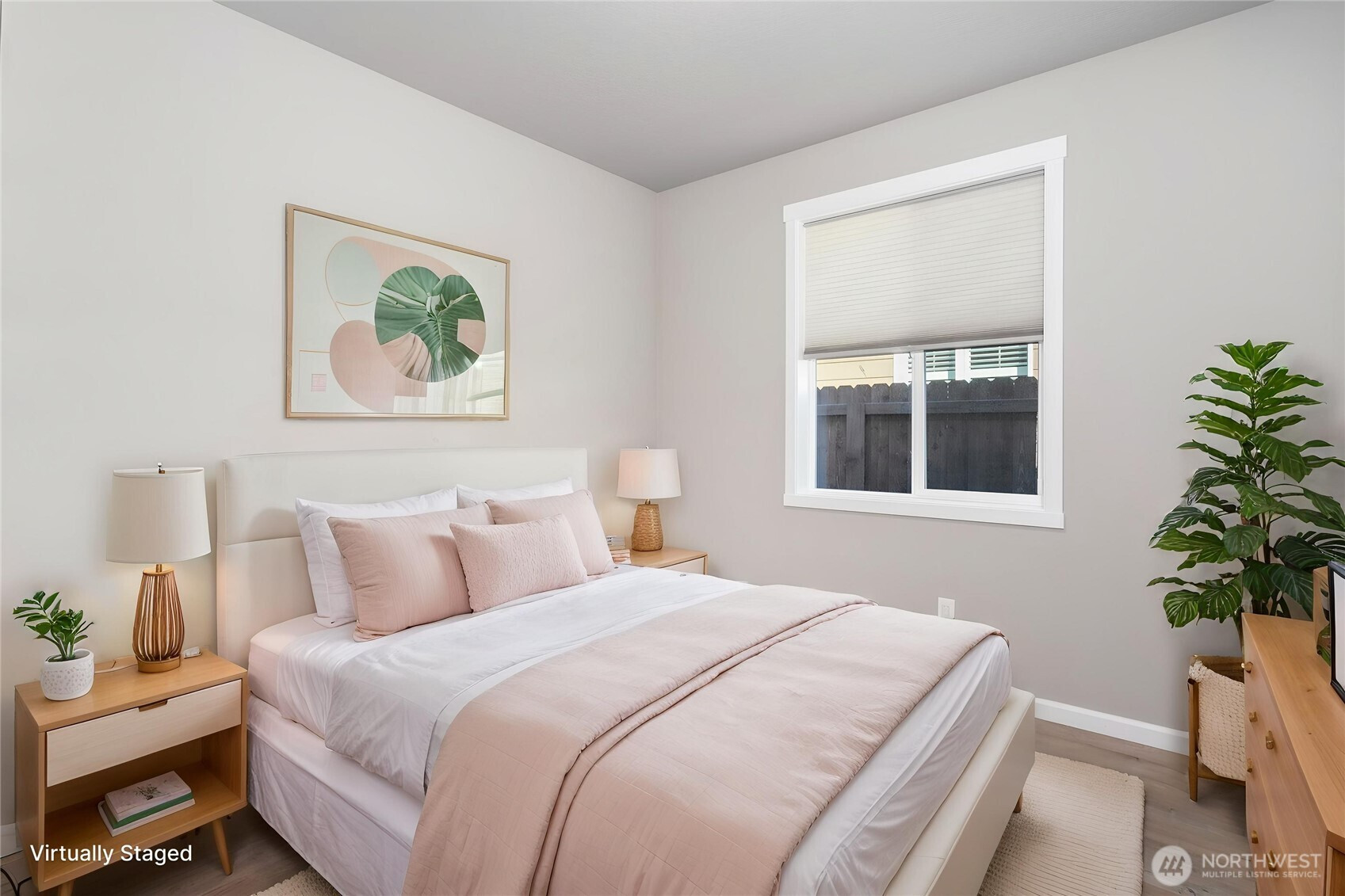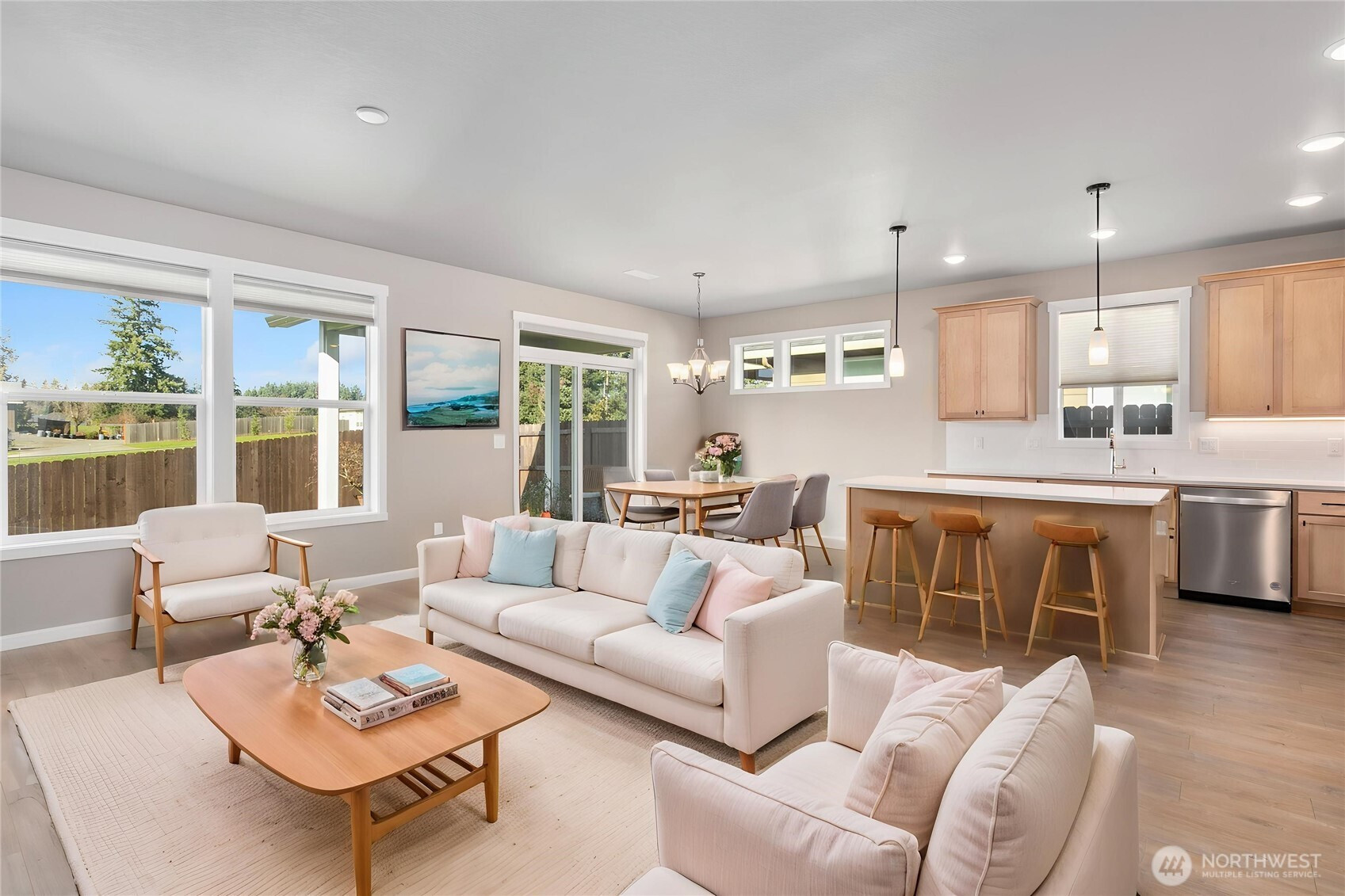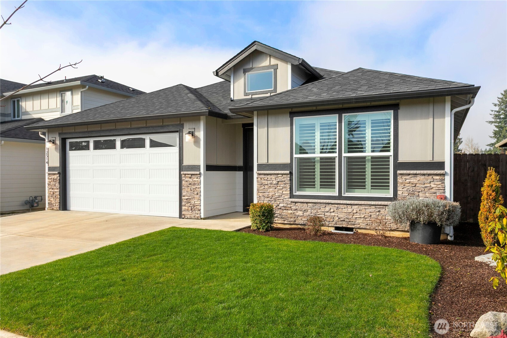 HOME SWEET HOME! Hard to find newer home with no HOA dues! Wonderful single level, Great Room Floor plan; open & light with high ceilings and LOTS of windows! LVP Flooring throughout the main living spaces. Kitchen features quartz counters, stainless steel appliances & a 4-stool eat bar. Open to the Dining Area & Great Room makes this perfect for entertaining & gatherings. Relax in front of the fireplace with TV hook-up & side nooks for shelves to other equipment. For those sunny days, step out of the sliding glass doors onto a covered patio, fully fenced backyard with raised beds, an additional garden area & privacy trees. The Primary Suite offers rest & relaxation with soft-to-the-touch, wall to wall carpets, a customized walk-in closet & spa-like bath. 2 additional bedrooms are outfitted with LVP floors & wood blinds. Add to all of this you have a laundry room with storage & sink PLUS a 2-car garage with plenty of room to maneuver around.