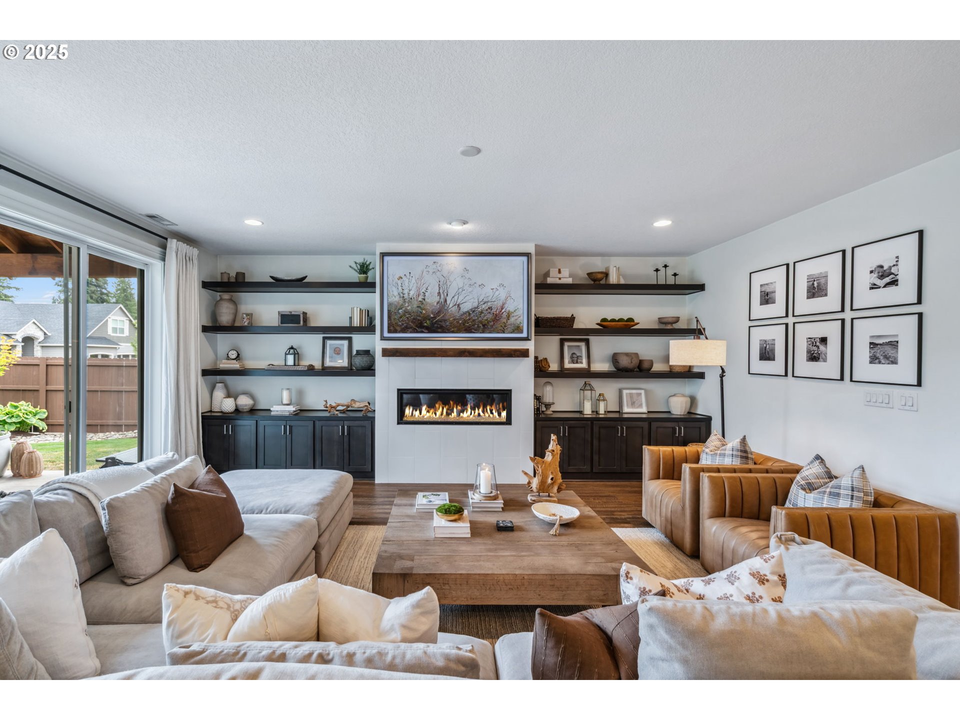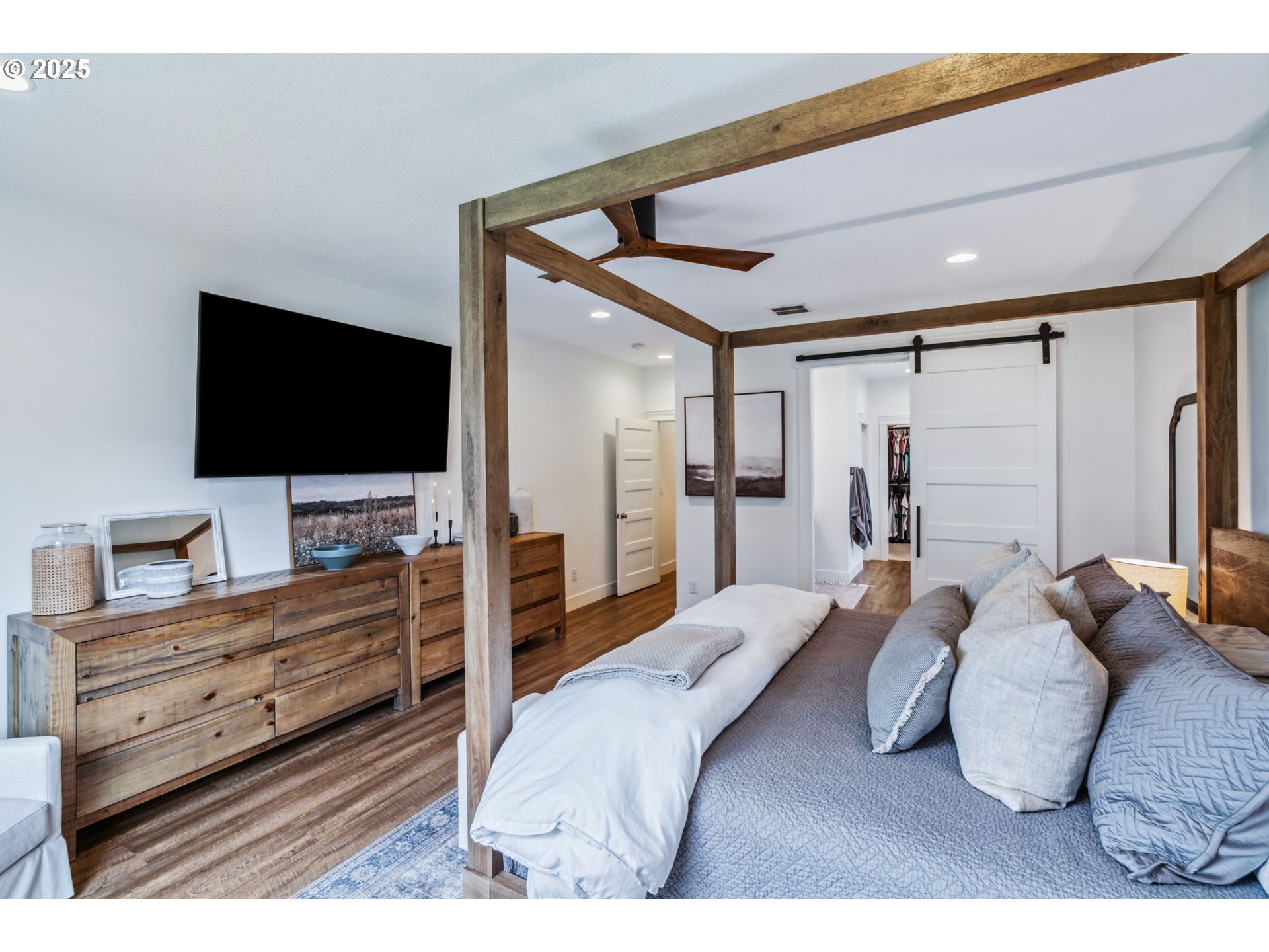 Modern Farmhouse-Style Beauty with Main-Level Living in Jessie Hollow neighborhood– Built by Kingston Homes. Discover designer-inspired living, ideally situated on a desirable corner lot in the sought-after Jessie Hollow neighborhood. This farmhouse-style home offers true one-level living with a spacious main-floor primary suite and an additional bedroom or office with a closet — perfect for working from home or accommodating guests with full guest bath on main. Enjoy upscale touches throughout, including custom built-ins, white shiplap accents, barn doors, and floating wood shelves. The open-concept living area features a custom fireplace and is anchored by wide-plank engineered luxury vinyl flooring that runs through most of the home. The kitchen and living spaces are designed for both function and style with builder-upgrade finishes throughout. The luxurious primary suite offers a spa-like retreat with a freestanding soaking tub, a fully tiled walk-in shower, and elegant finishes. Upstairs, you’ll find two additional bedrooms and a large bonus room—easily adaptable as a fifth bedroom if desired. Step outside to the timber-framed covered patio and enjoy your private backyard oasis, perfect for year-round entertaining. With thoughtful craftsmanship, designer details, and flexible space for up to 5 bedrooms, this home blends charm, comfort, and versatility in one exceptional package.