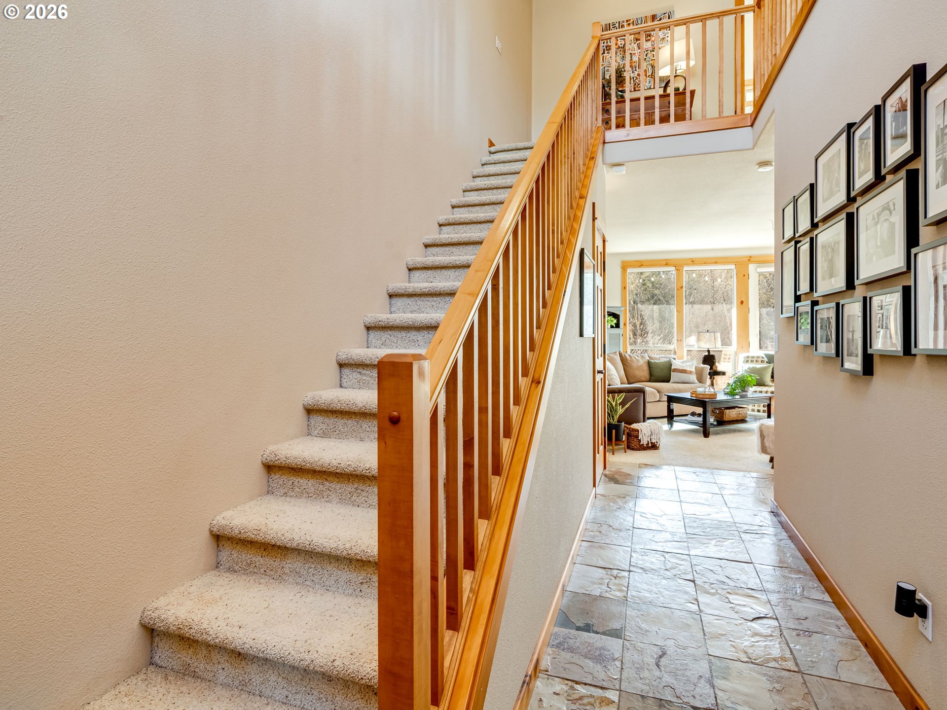 Nestled within a gated community, this stunning home welcomes you with a dramatic double-height entry framed by rich Alder wood trim and doors throughout. The living room offers a warm and inviting place to unwind, featuring a gas fireplace and expansive windows that perfectly showcase the serene greenbelt backdrop. The kitchen offers newer appliances, abundant storage including a pantry and an eat bar that is perfect for entertaining. Moving upstairs you will find 8 foot tall doors and generous skylights flooding the space with natural light. The primary boasts vaulted ceilings, and a private covered patio that looks over the protected greenbelt. The primary ensuite is the perfect place to unwind with a large soaking tub, walk-in shower, and double sinks. A massive, thoughtfully designed walk-in closet connects directly to an oversized laundry room complete with a sink, countertop space, and ample storage. Two additional bedrooms and a spacious full bathroom complete the upper level. Make the most of the 2-car garage that has convenient overhead storage. Outside, the home backs to a stunning greenbelt that will remain untouched, offering lasting privacy and natural beauty. This community is centrally located, secure and has private access to the greenbelt it sits beside making this the perfect place to call home.