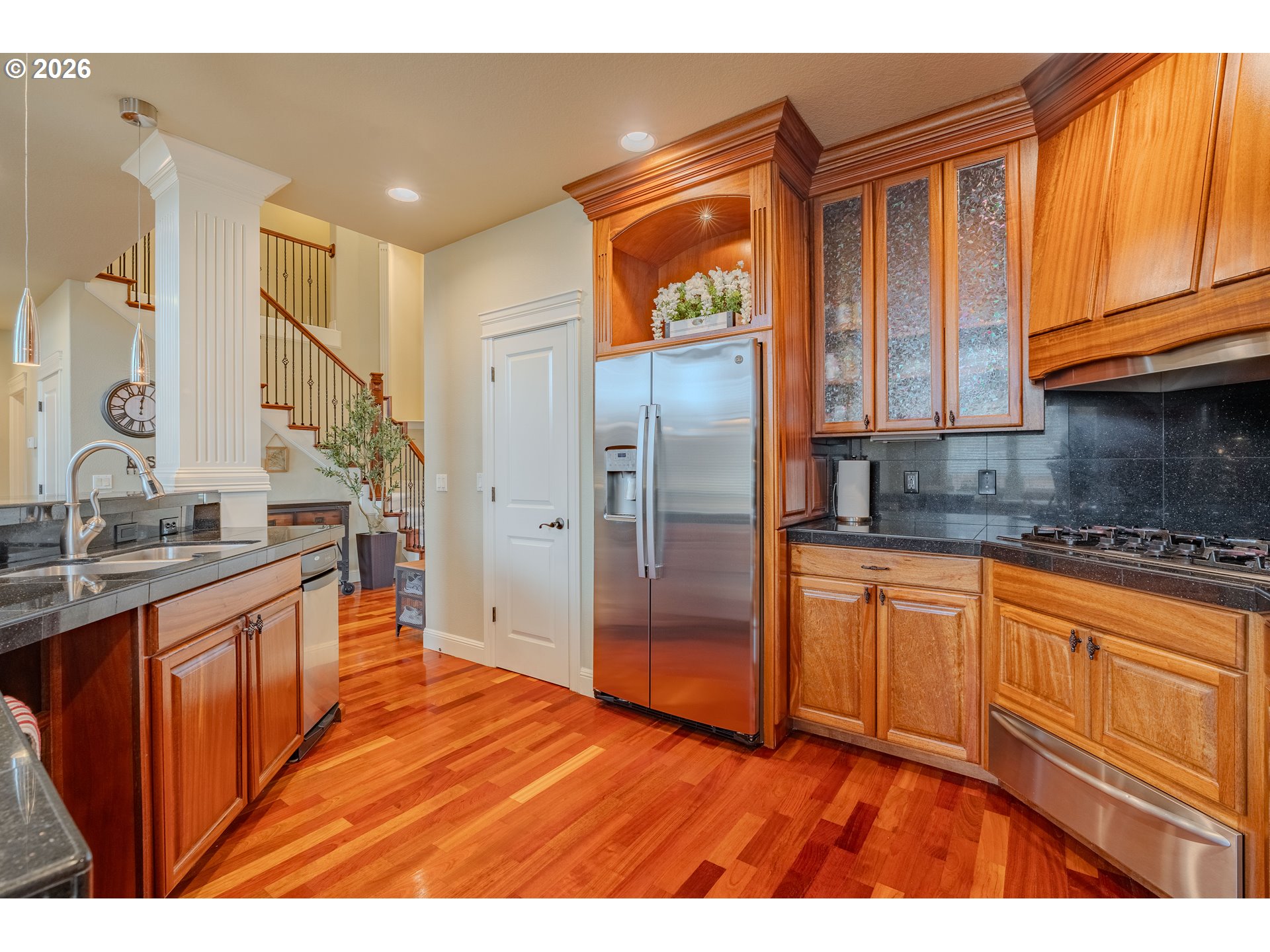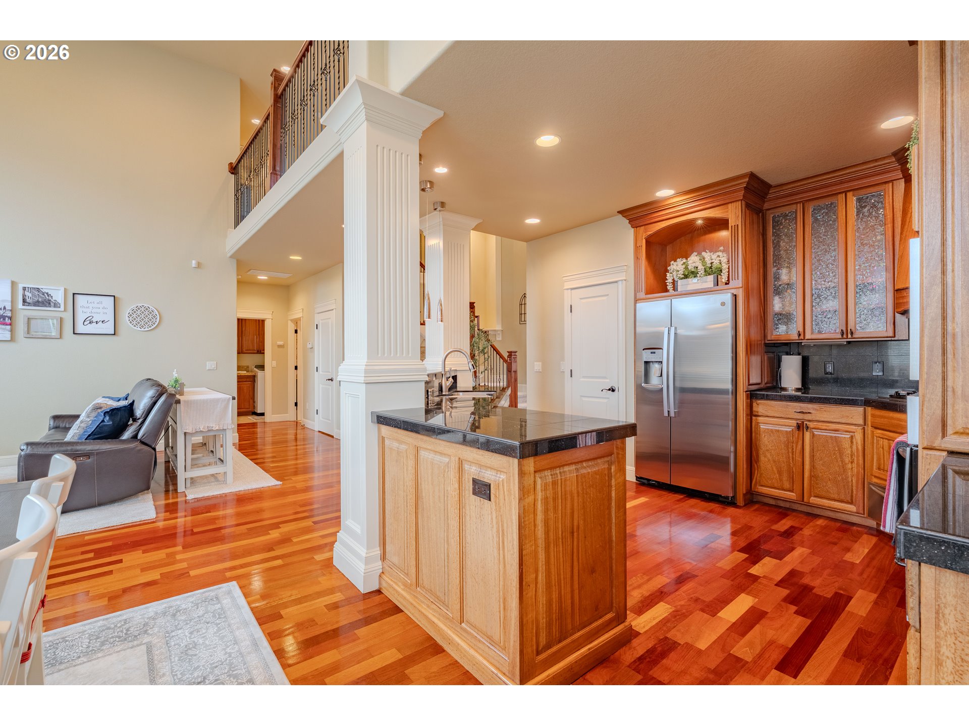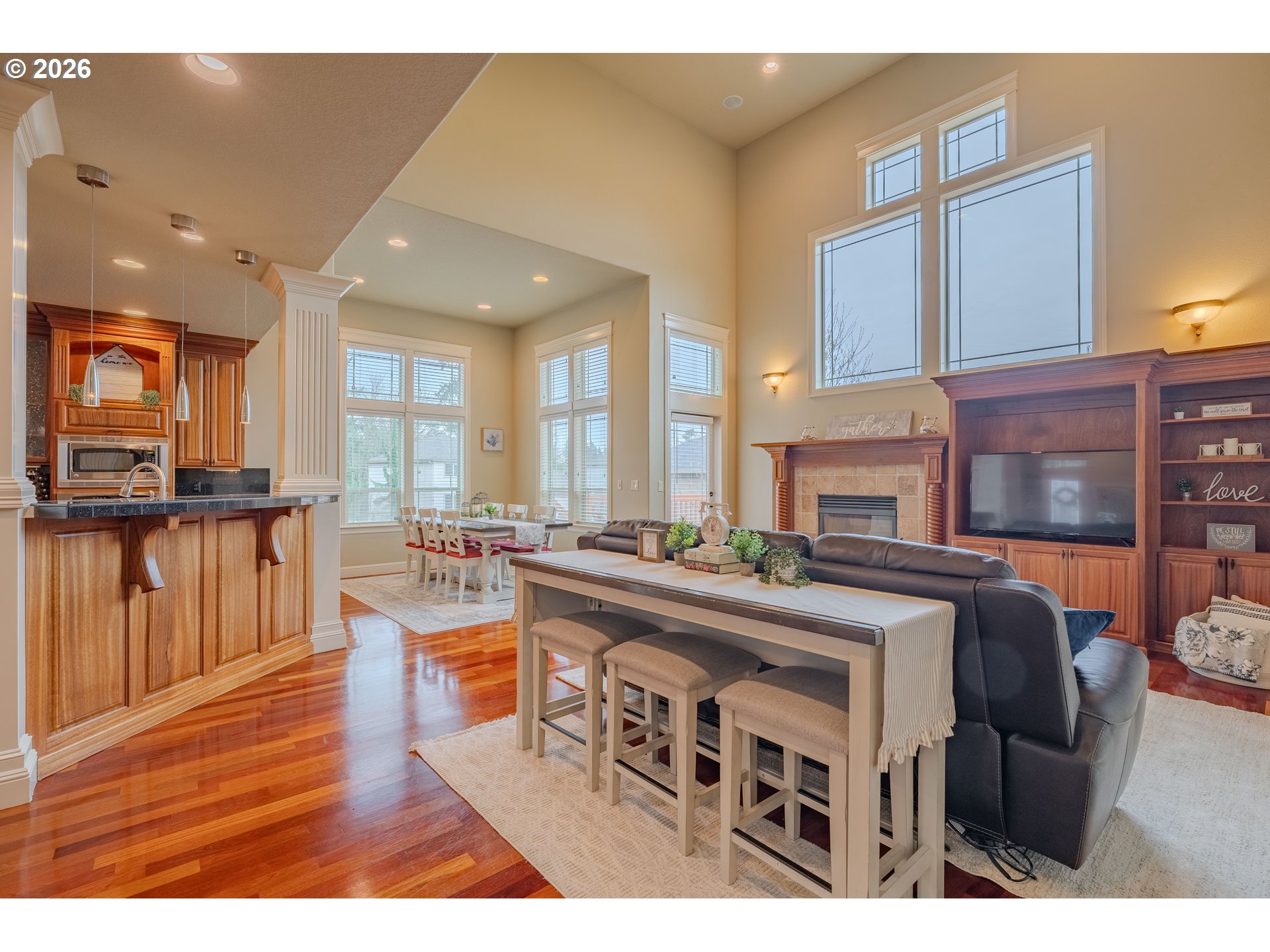 Immaculate 4-bedroom plus den, 2.5-bath home showcasing exceptional craftsmanship, soaring high ceilings, and a bright, open floor plan designed for both comfort and style. At the heart of the home, the central kitchen boasts brand-new stainless steel appliances, custom mahogany cabinetry, granite counters, and built-in features, opening seamlessly to the living areas—perfect for entertaining. Throughout the expansive living spaces, you find custom built ins, custom fireplace, expansive windows that keep the open floor plan light and bright. Brazilian cherry hardwood floors add warmth and sophistication, complemented by brand-new carpet throughout. The inviting primary suite on the main level offers a true retreat, featuring a cozy two-sided fireplace, a spa-inspired bath with a soaking tub and separate shower. There is a second large bedroom upstairs that has a walk in closet and attached bathroom. Step outside to the expansive backyard entertainer’s deck, renewed this year—ideal for gatherings or quiet relaxation. In addition a designer Gazebo has been added to the expansive yard. Additional features include sprinkler system and a walking-height storage/crawl space area; a 50-year architectural roof that’s only six years old, ensuring long-term durability and peace of mind. A luxurious benefit of the 3 car garage is-a 6 car driveway for all your guests and toys. This home combines timeless design, premium finishes, and thoughtful updates—an exceptional opportunity to own a property that truly stands out.