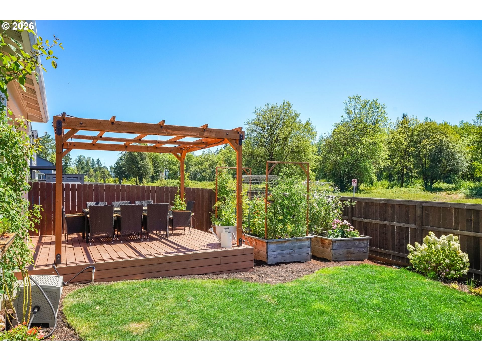 Deck, Fenced, Garden, Porch, RaisedBeds, Sprinkler, Yard