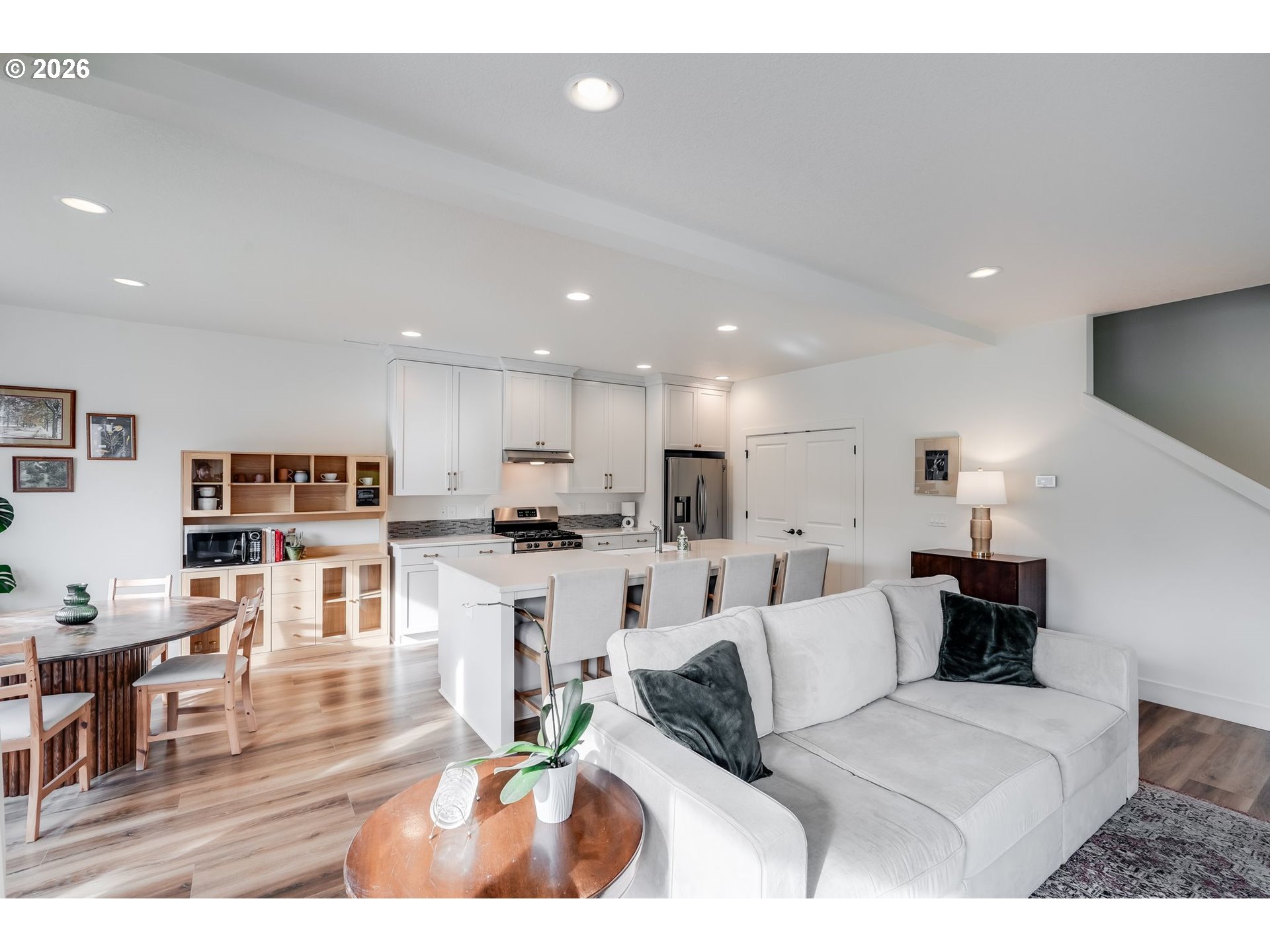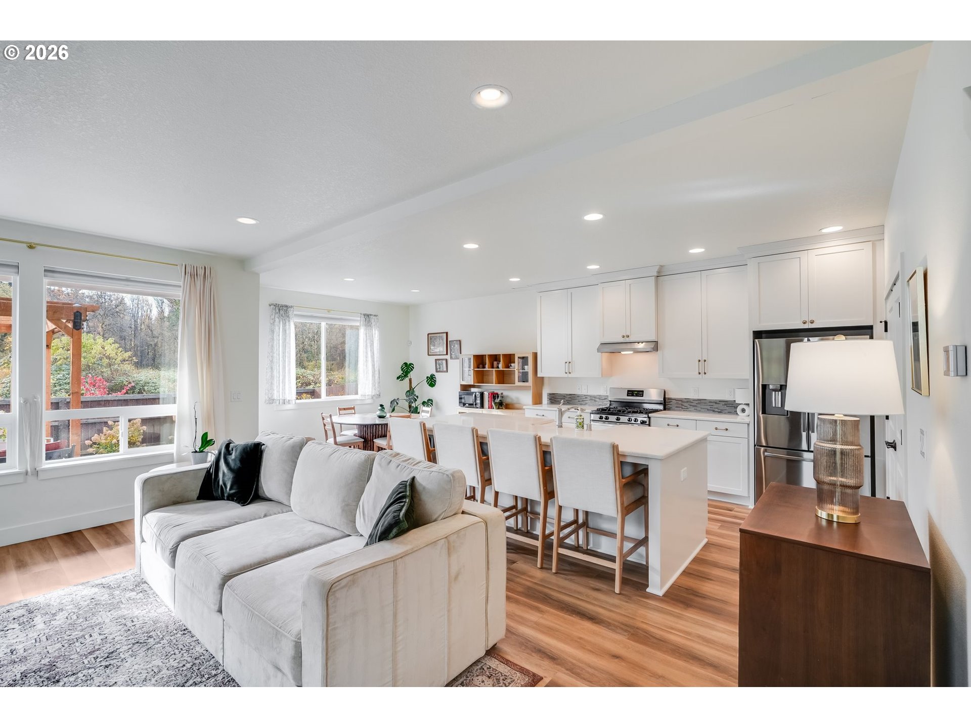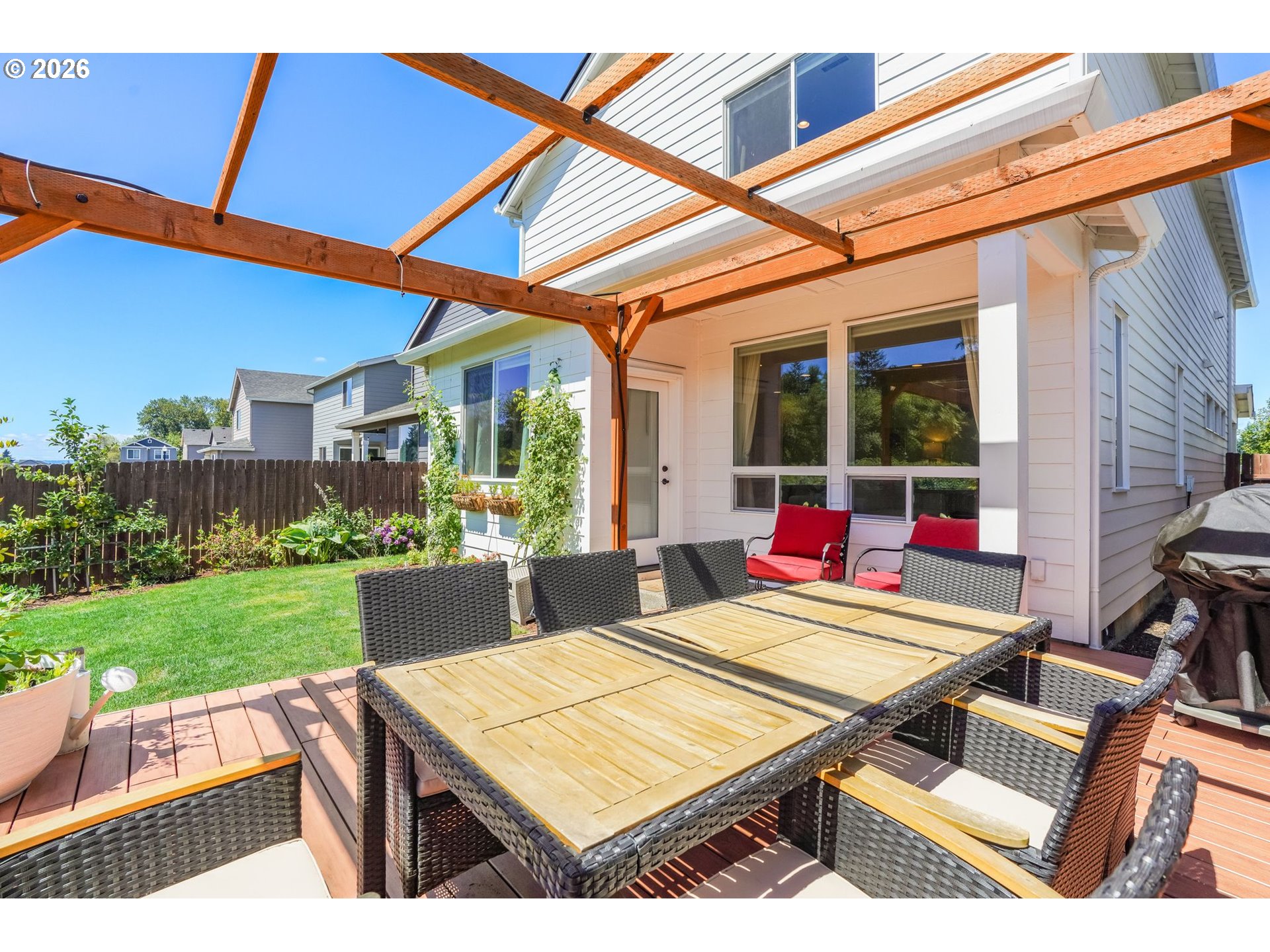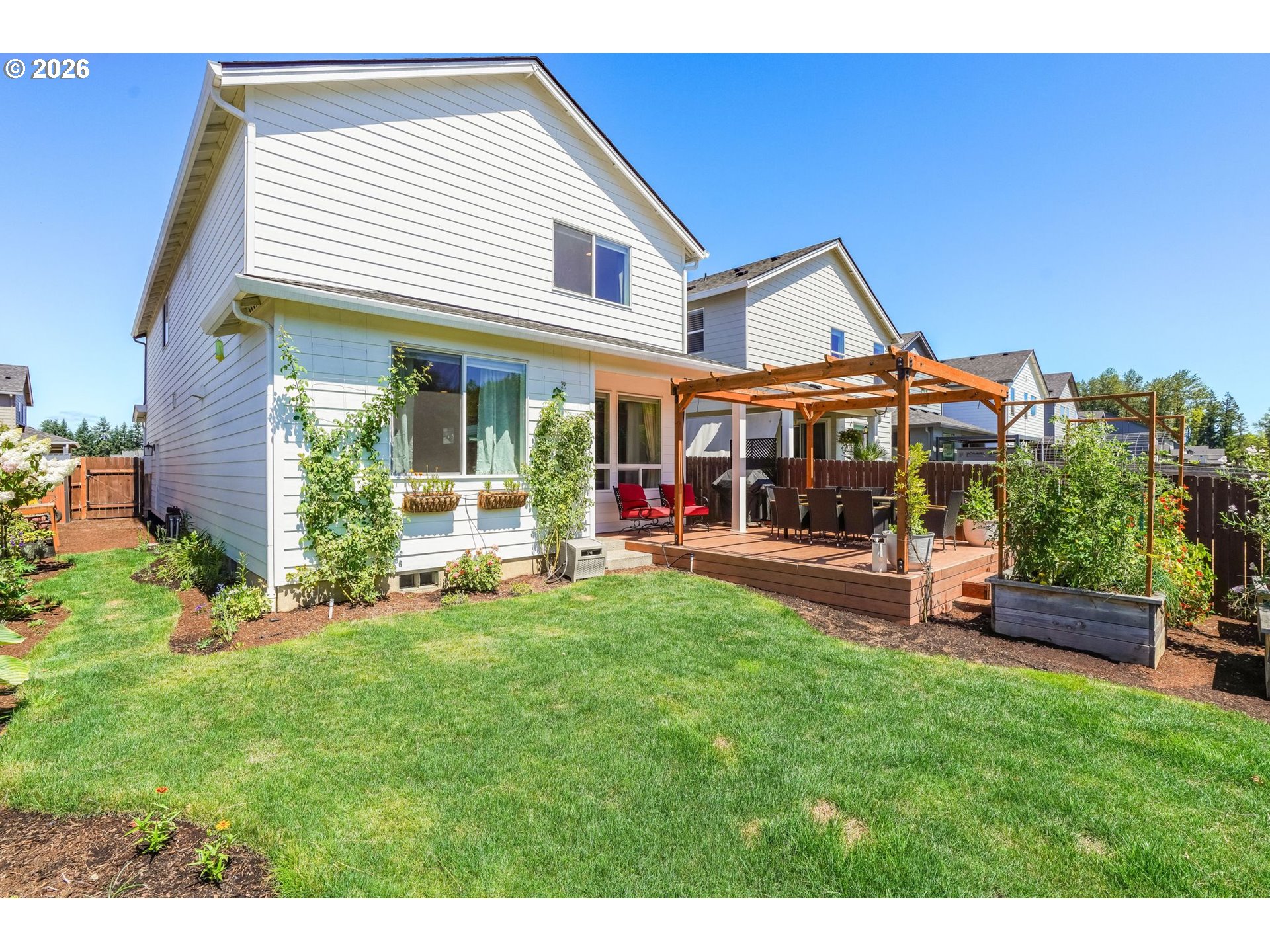 (503) 893-8874Open House: Saturday, January 10th, 1:00 PM – 3:00 PM. This thoughtfully designed home features an open-concept layout with 9-foot ceilings, a dedicated office on the first floor, and a stunning upgraded kitchen with freshly painted cabinets. The kitchen is a true standout with stainless steel appliances, quartz countertops, full-height cabinetry, custom paint, a large island with seating, and a oversized walk-in pantry. The inviting living area includes a modern electric fireplace and built-in storage, while the upstairs loft provides a versatile bonus space ideal for a media room, playroom, or second office. The private primary suite offers double sinks, a soaking tub, and a generous walk-in closet. Step outside to a backyard retreat designed for relaxation and gardening enthusiasts. A covered Trex deck overlooks beautifully maintained garden beds filled with roses, flowers, tomatoes, and more, along with mature trees that enhance the privacy of the no-rear-neighbor setting. Additional highlights include extra cabinetry throughout, a convenient upstairs laundry room with a deep sink, and included washer, dryer, and refrigerator — making this home truly move-in ready!