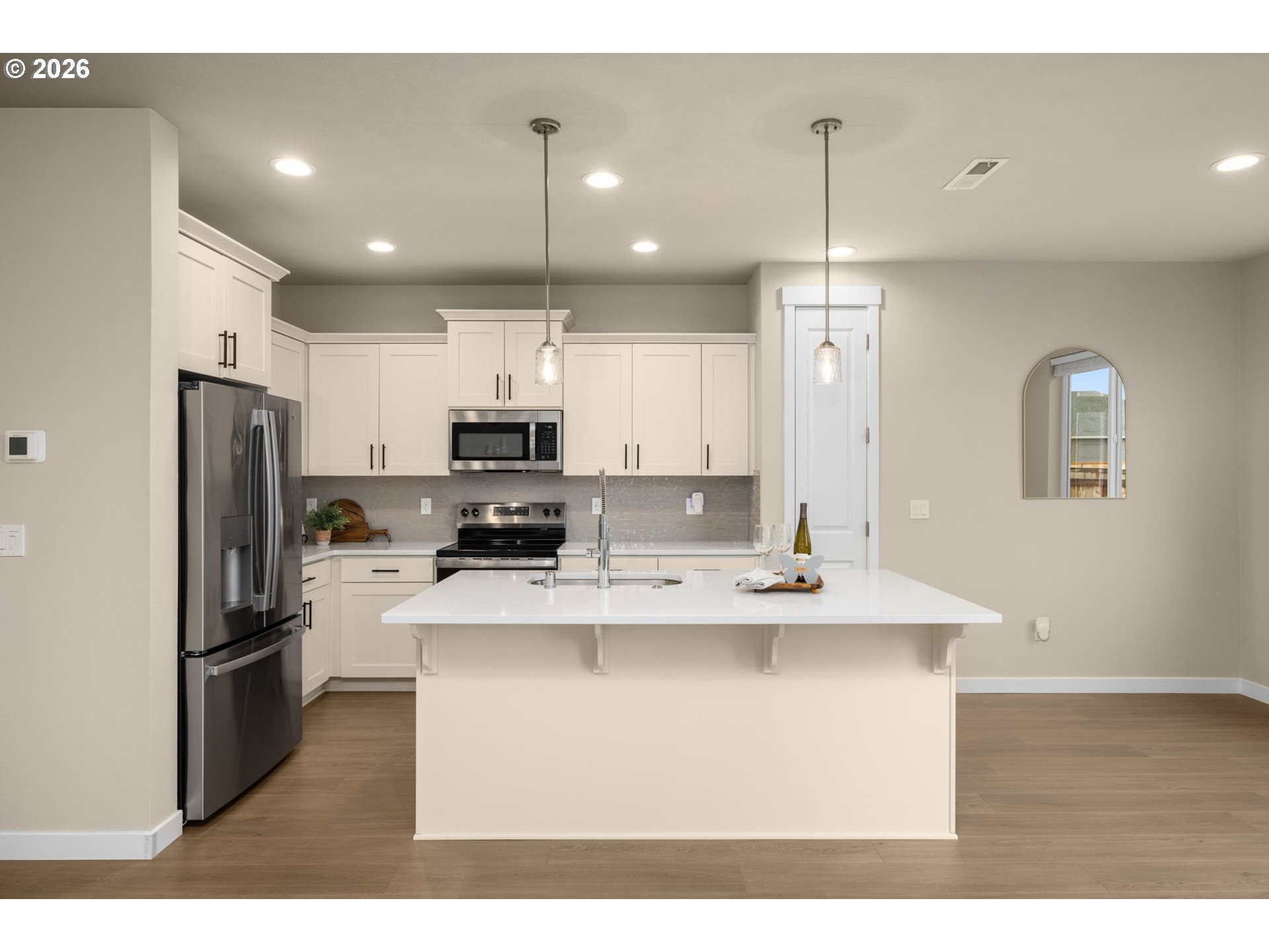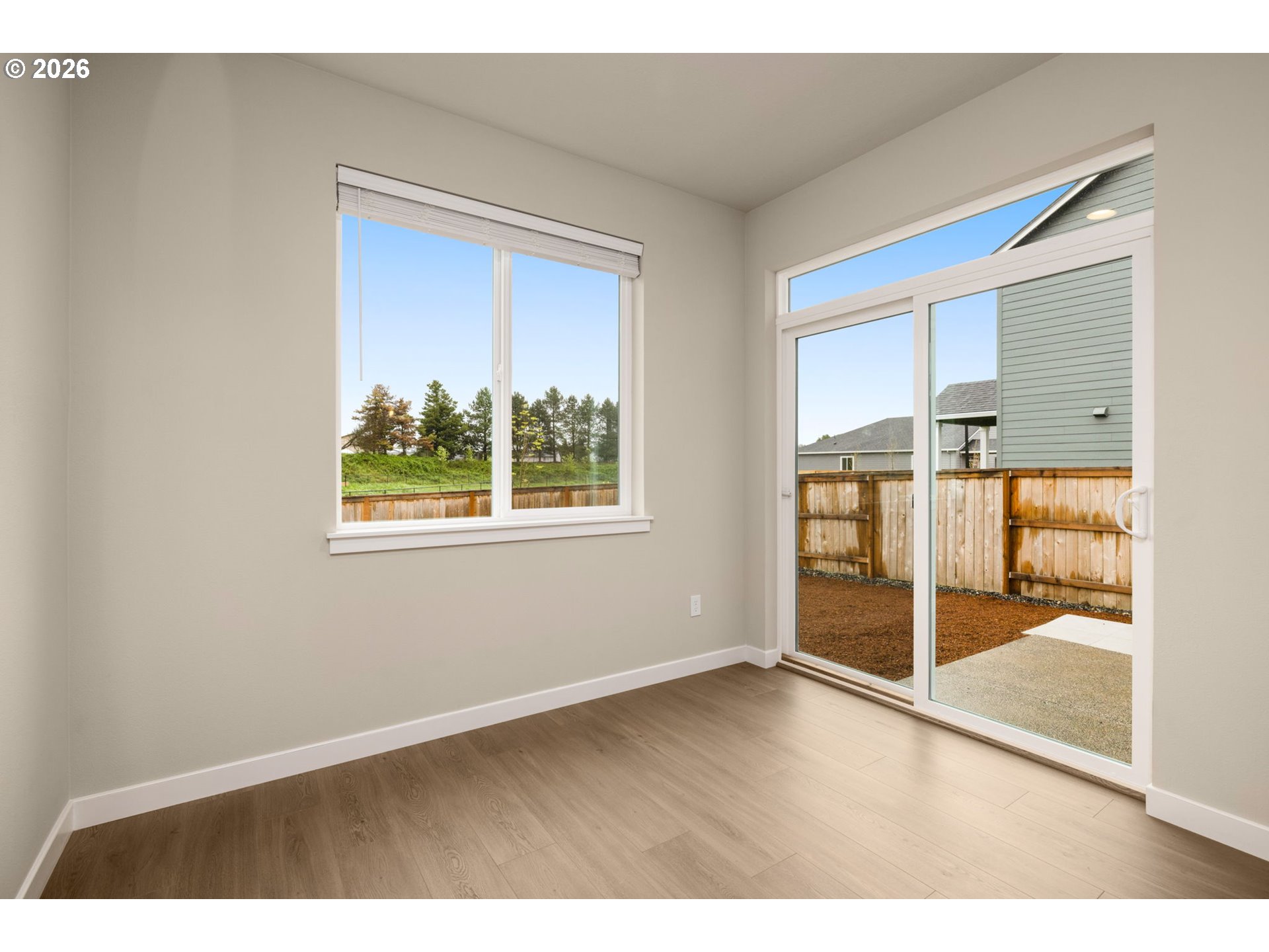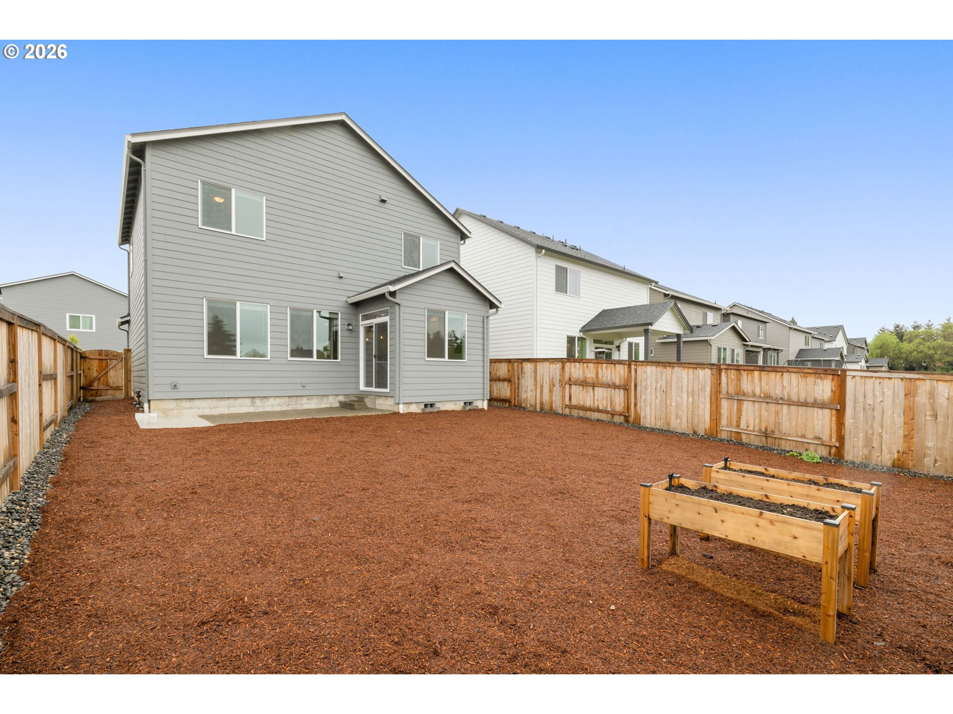 Set in one of the most coveted locations in the neighborhood, this better-than-new 3-bedroom, 2.5-bath home—just one year old—offers peaceful pond views and the rare privacy of no neighbors behind. Enjoy the soothing sounds of seagulls, geese and visiting birds while taking in the tranquil setting that feels like living beside your own nature park plus a neighborhood playground at the end of the block.Designed with a highly functional floorplan, the main level features a spacious living area centered around a cozy fireplace—perfect for relaxing or entertaining. The upgraded kitchen combines style and efficiency with quartz countertops, ample cabinetry, a pantry and eating bar. Quality window treatments throughout, while easy-care laminate flooring enhances the main level. A sliding door off the dining space opens to a patio and large backyard with garden boxes—ideal for outdoor living and enjoying the serene surroundings.Upstairs, you’ll find three bedrooms and a conveniently located laundry room. The primary suite offers a tray ceiling, ensuite bath with walk-in shower, and an oversized closet, creating a comfortable private retreat.Additional conveniences include a garage with extra shelving and HOA-maintained front landscaping, making day-to-day living effortlessly low maintenance. A large nearby dog park adds to the lifestyle appeal, while neighborhood coffee shops and restaurants are just moments away. Commuters will appreciate the easy 15-minute drive to PDX, offering both accessibility and a peaceful retreat to come home to.