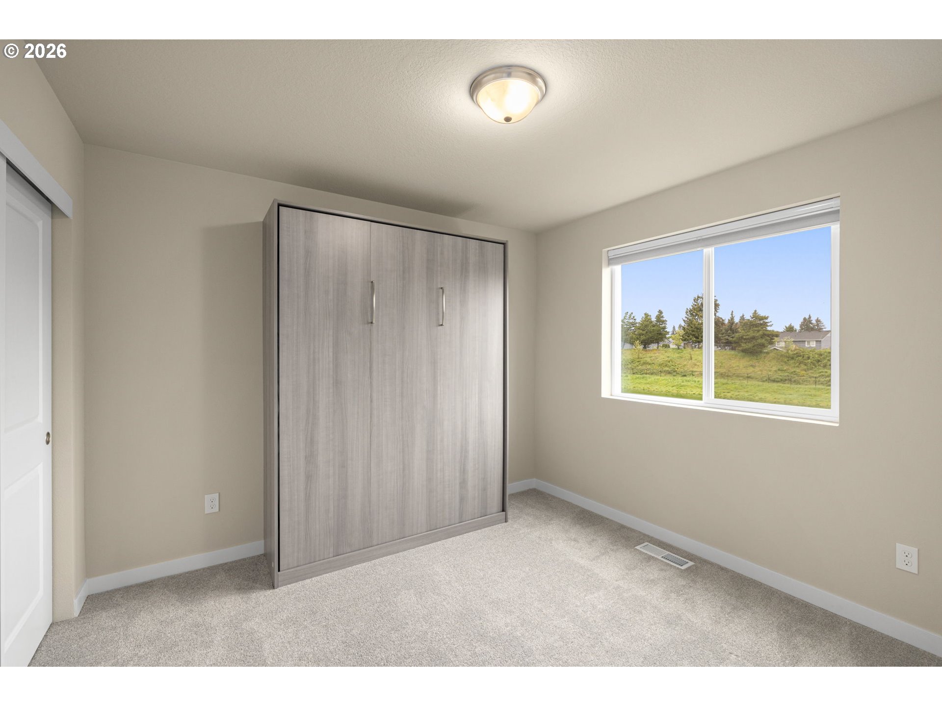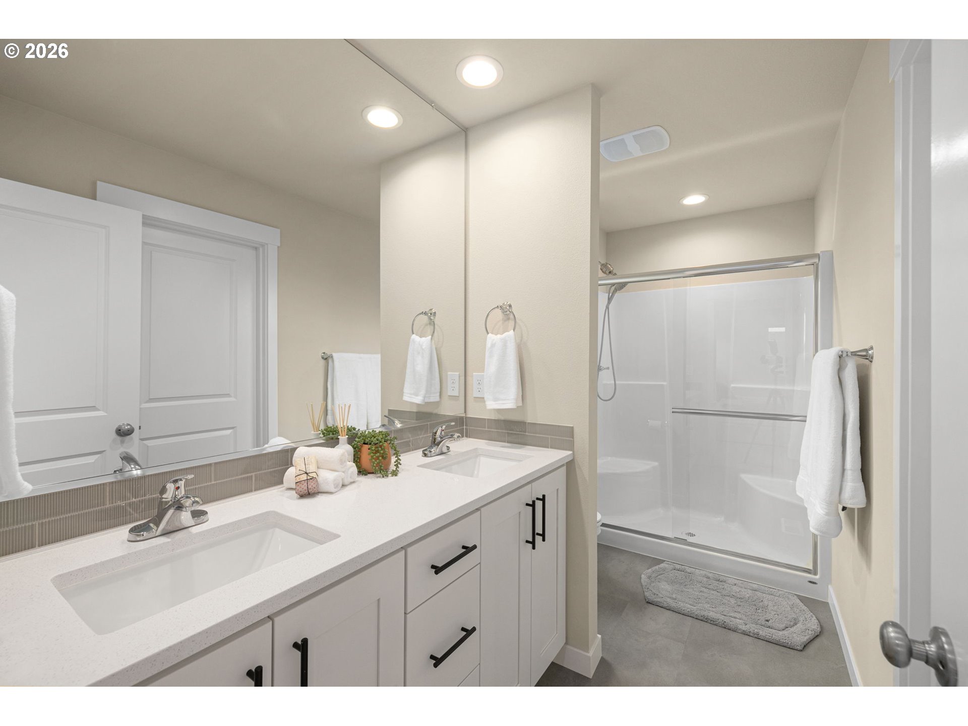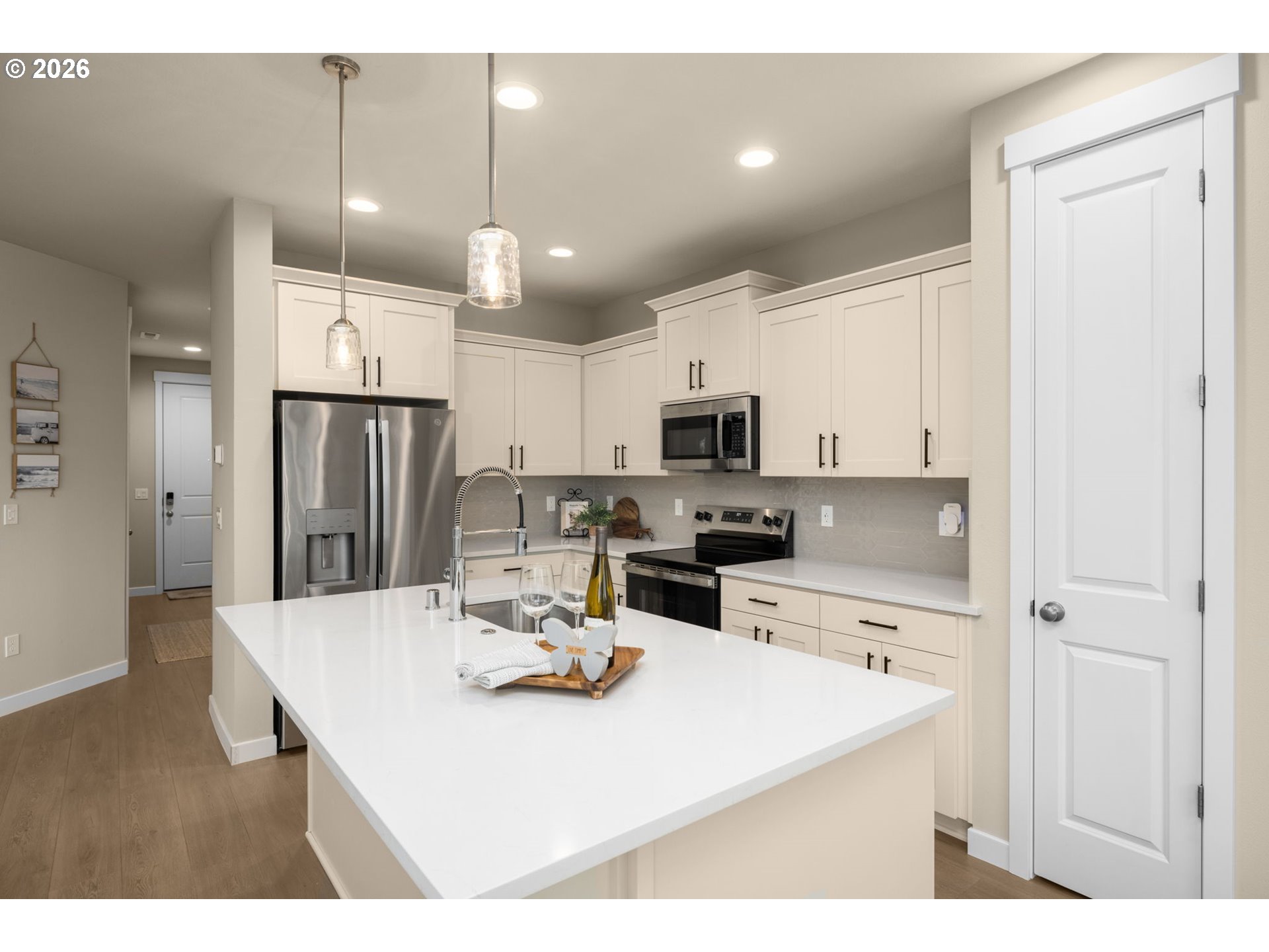 Set in one of the most coveted locations in the neighborhood, this better-than-new 3-bedroom, 2.5-bath home—just one year old—offers peaceful pond views and the rare privacy of no neighbors behind. Enjoy the soothing sounds of seagulls, geese and visiting birds while taking in the tranquil setting that feels like living beside your own nature park plus a neighborhood playground at the end of the block.Designed with a highly functional floorplan, the main level features a spacious living area centered around a cozy fireplace—perfect for relaxing or entertaining. The upgraded kitchen combines style and efficiency with quartz countertops, ample cabinetry, a pantry and eating bar. Quality window treatments throughout, while easy-care laminate flooring enhances the main level. A sliding door off the dining space opens to a patio and large backyard with garden boxes—ideal for outdoor living and enjoying the serene surroundings.Upstairs, you’ll find three bedrooms and a conveniently located laundry room. The primary suite offers a tray ceiling, ensuite bath with walk-in shower, and an oversized closet, creating a comfortable private retreat.Additional conveniences include a garage with extra shelving and HOA-maintained front landscaping, making day-to-day living effortlessly low maintenance. A large nearby dog park adds to the lifestyle appeal, while neighborhood coffee shops and restaurants are just moments away. Commuters will appreciate the easy 15-minute drive to PDX, offering both accessibility and a peaceful retreat to come home to.
