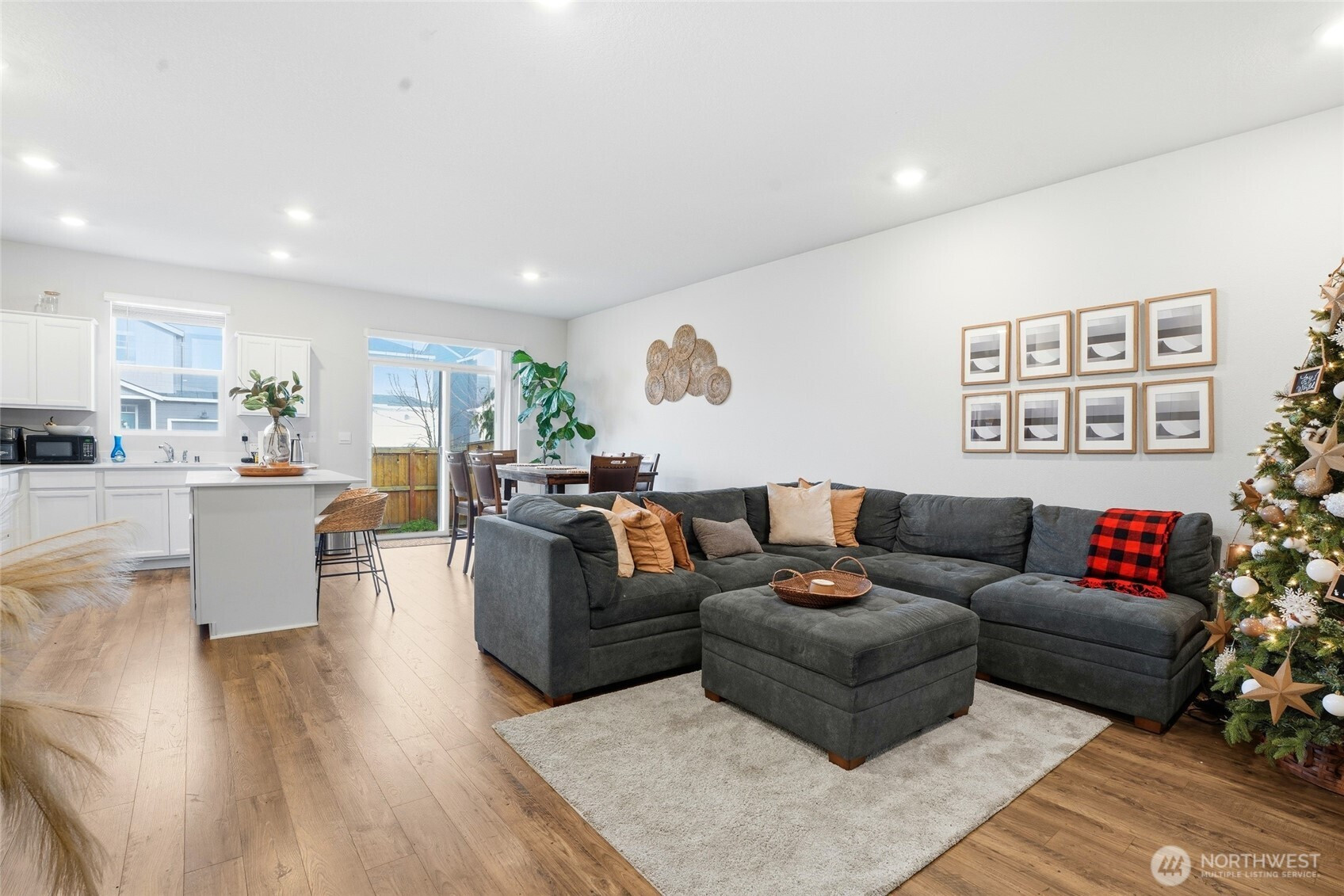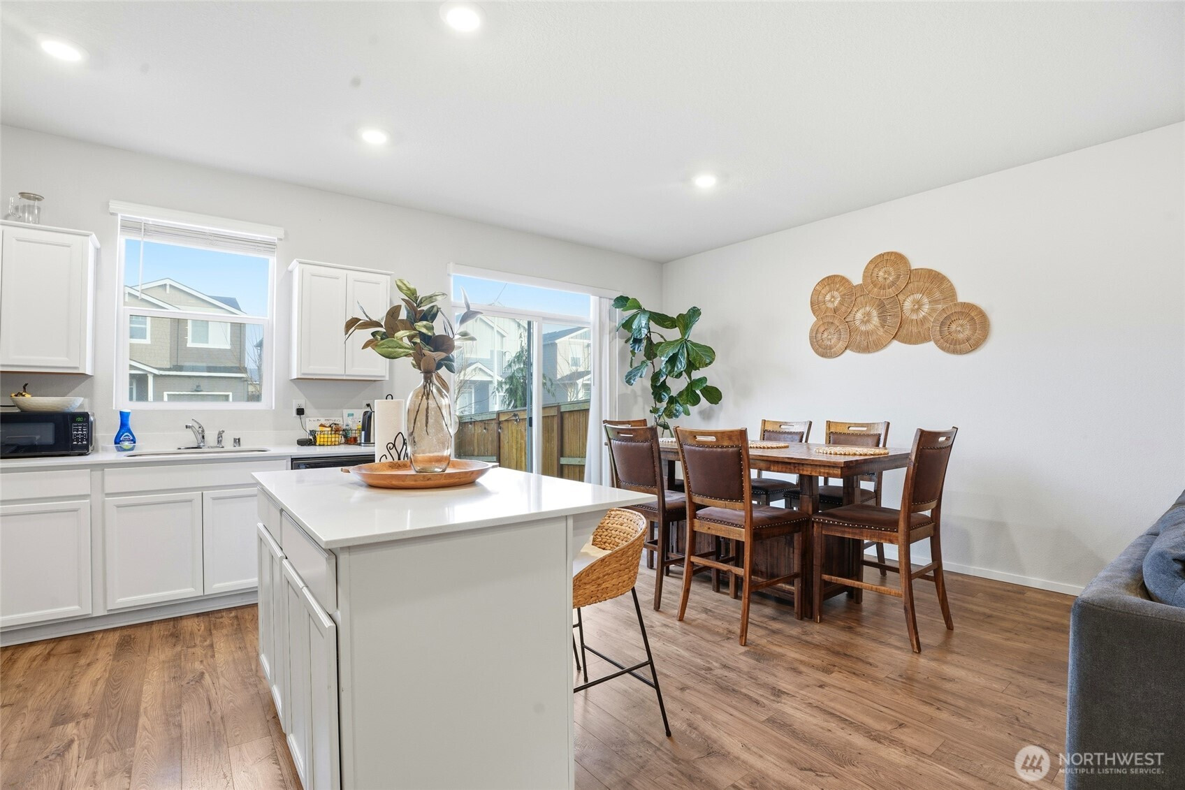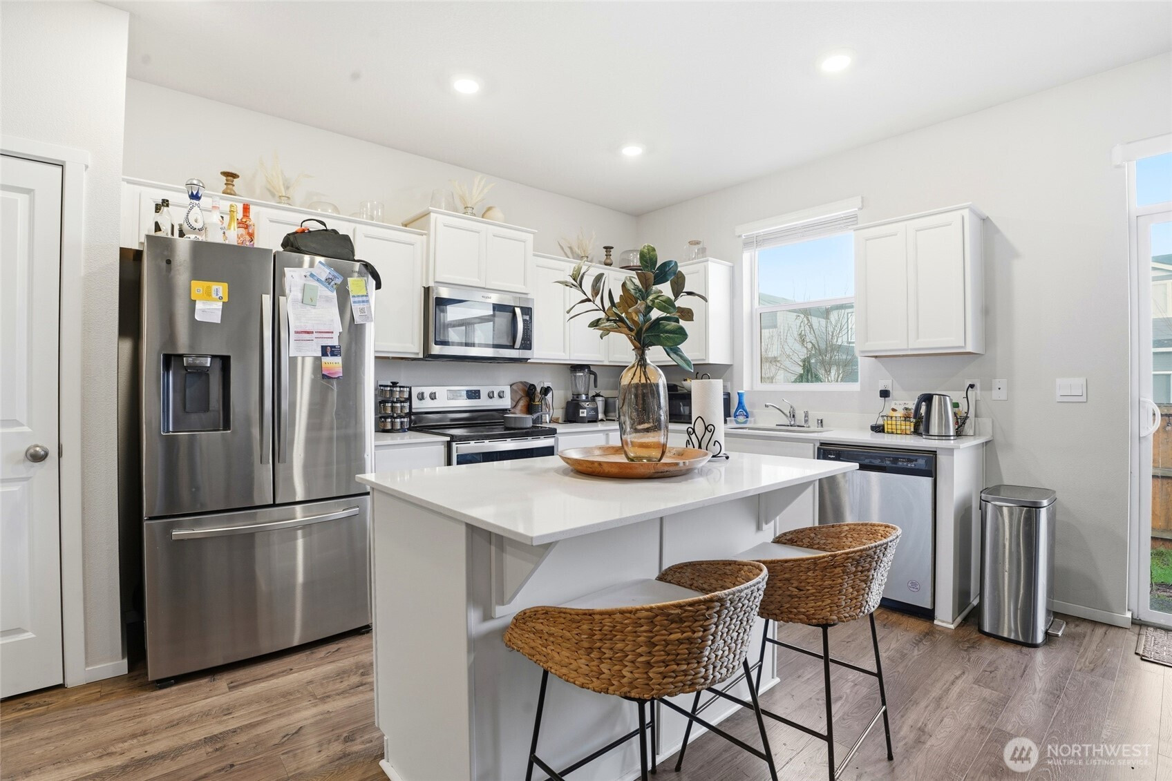 Refined and move-in ready, this beautifully maintained 3-bedroom, 2.5-bath residence offers a sought-after floor plan filled with natural light. The designer kitchen features crisp white cabinetry, quartz countertops, stainless steel appliances, and a generous pantry, seamlessly flowing into the dining area and great room for effortless entertaining. Laminate flooring enhances the main level, complemented by smart home technology, air conditioning, and a fully fenced outdoor space. Ideally situated near premier shopping, dining, and major commuter routes, this home delivers both sophistication and convenience.