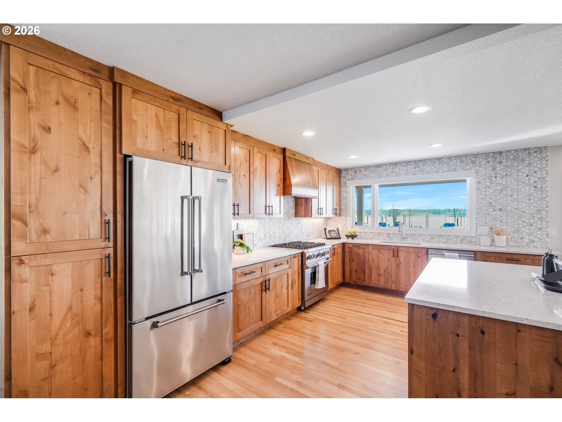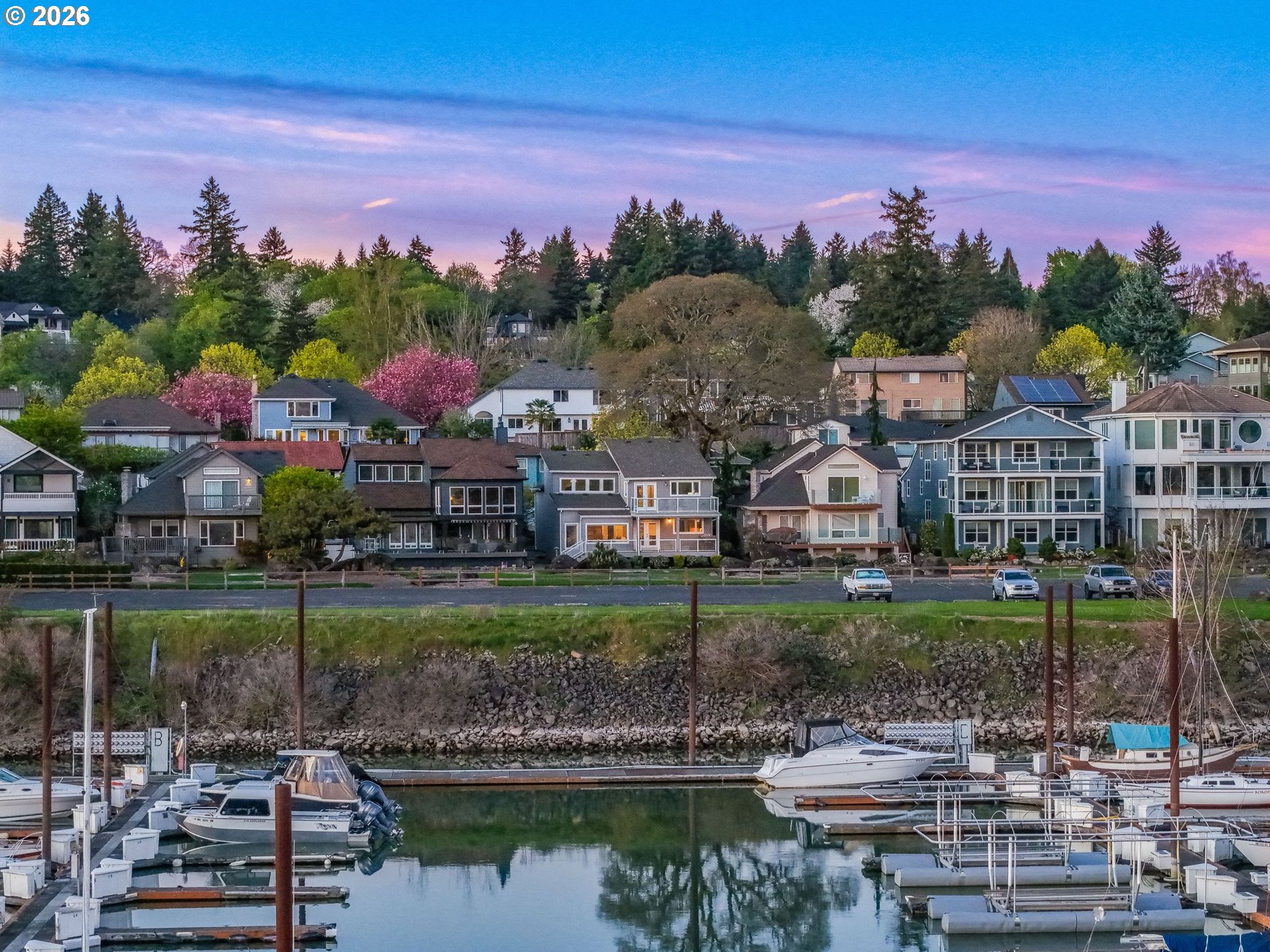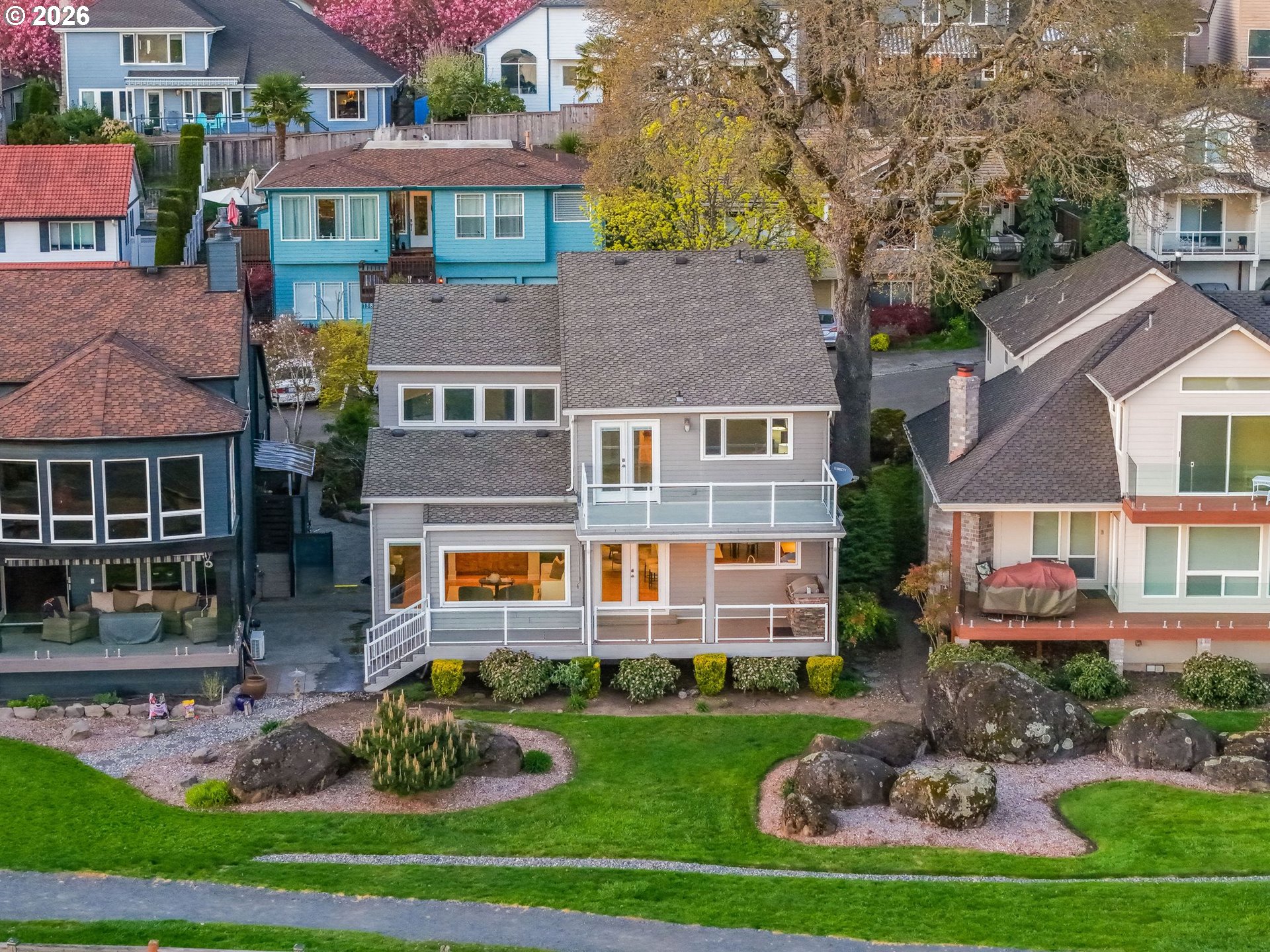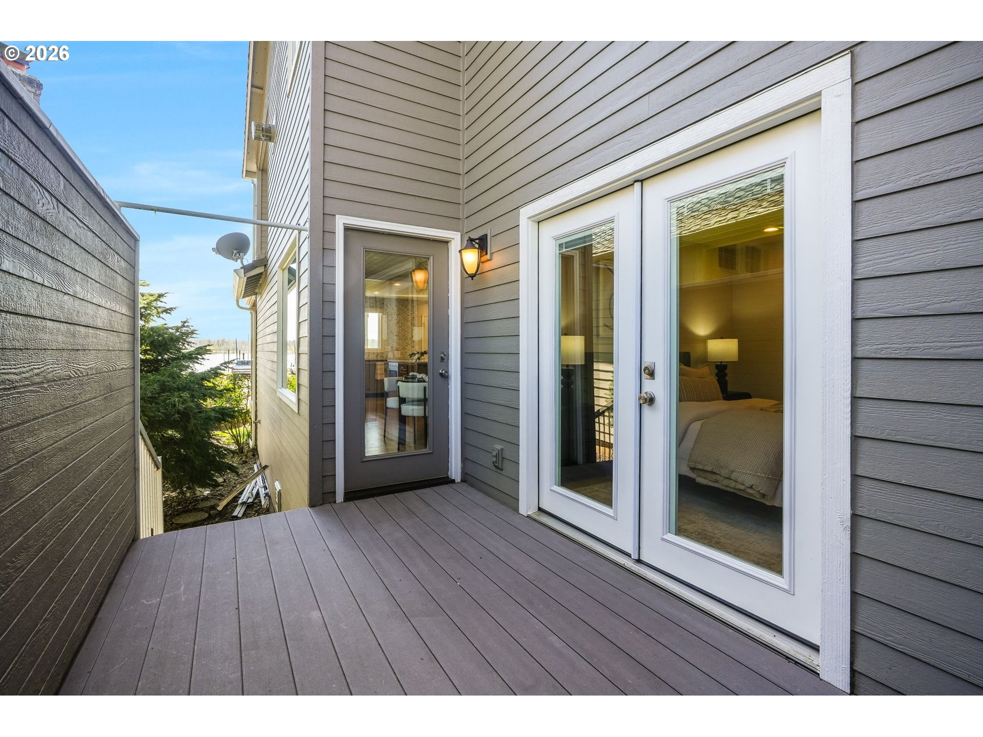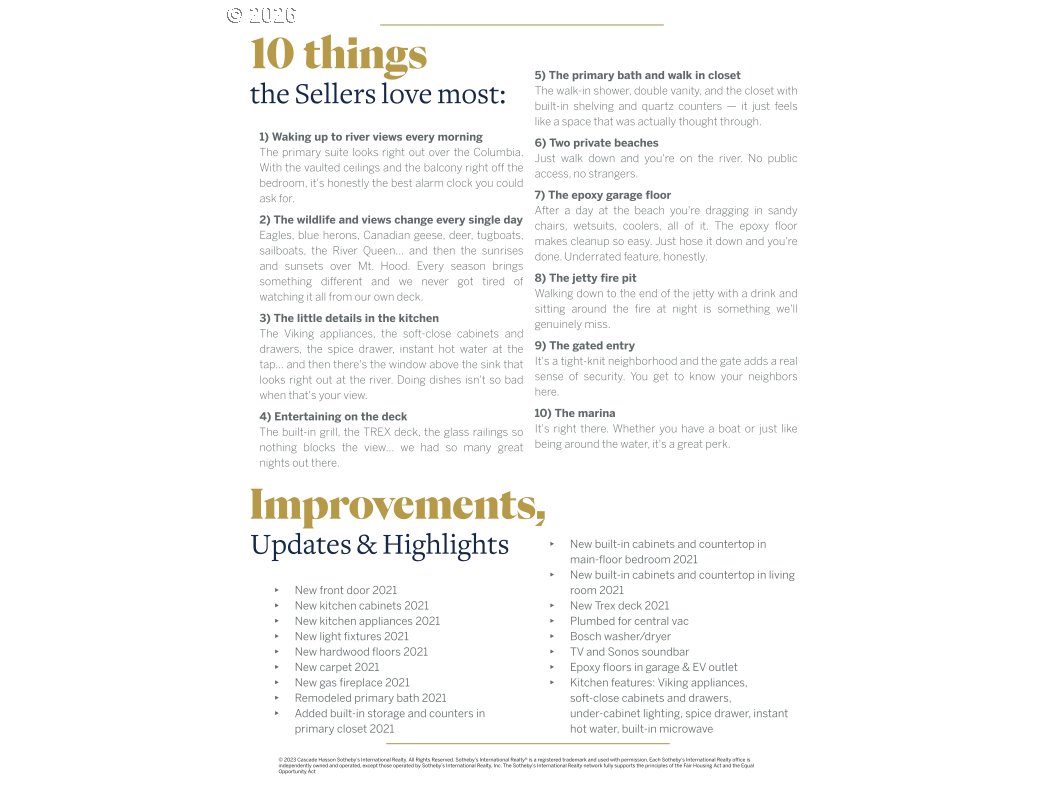 Welcome to waterfront living in Steamboat Landing — one of the area's most sought-after gated communities, where residents enjoy two private beaches, scenic trails, a jetty with a fire pit, a full marina, and gated RV parking. This is resort-style living without ever leaving home. The kitchen is a true showpiece — featuring a full suite of Viking appliances, quartz countertops, large island, soft-close cabinetry, under-cabinet lighting, a spice drawer, and instant hot water. Newer hardwood floors flow through the main level, and a gas fireplace with a stacked stone accent wall anchors the living space with warmth and character. A reimagined staircase and railing make a great first impression from the moment you walk in. The primary suite is nothing short of spectacular — vaulted ceilings, a private balcony with sweeping river views, a walk-in closet with built-in shelving and quartz counters, and en suite bath with double vanity and a beautifully tiled walk-in shower. The main floor offers a flexible third bedroom with direct access to a side patio, plus a full bath — great for guests or a home office. Step outside on the newer Trex deck featuring a built-in grill and glass railings that keep the river views completely unobstructed. Additional highlights include a laundry room on the main with Bosch washer/dryer, epoxy garage floor, and an EV charger outlet. Waterfront homes in Steamboat Landing rarely hit the market — now is your chance to vacation where you live. Come see it for yourself!