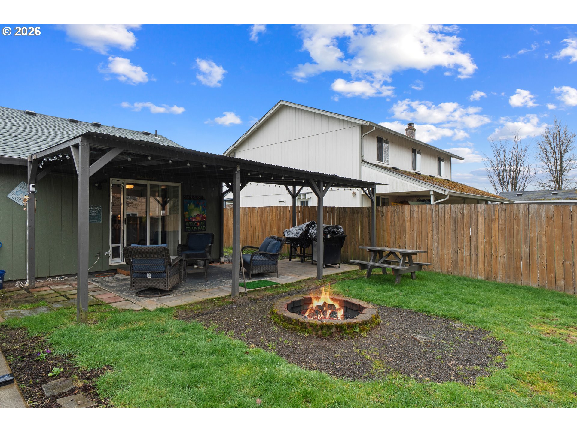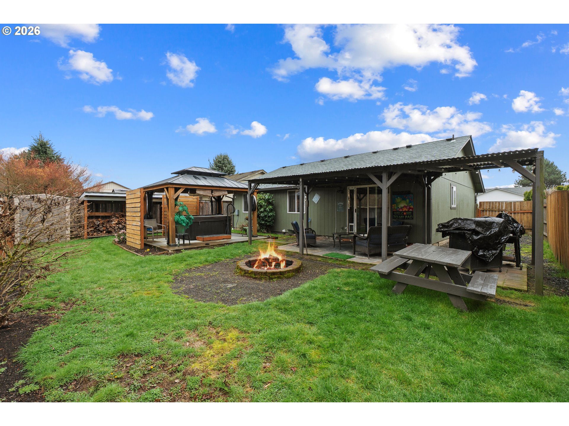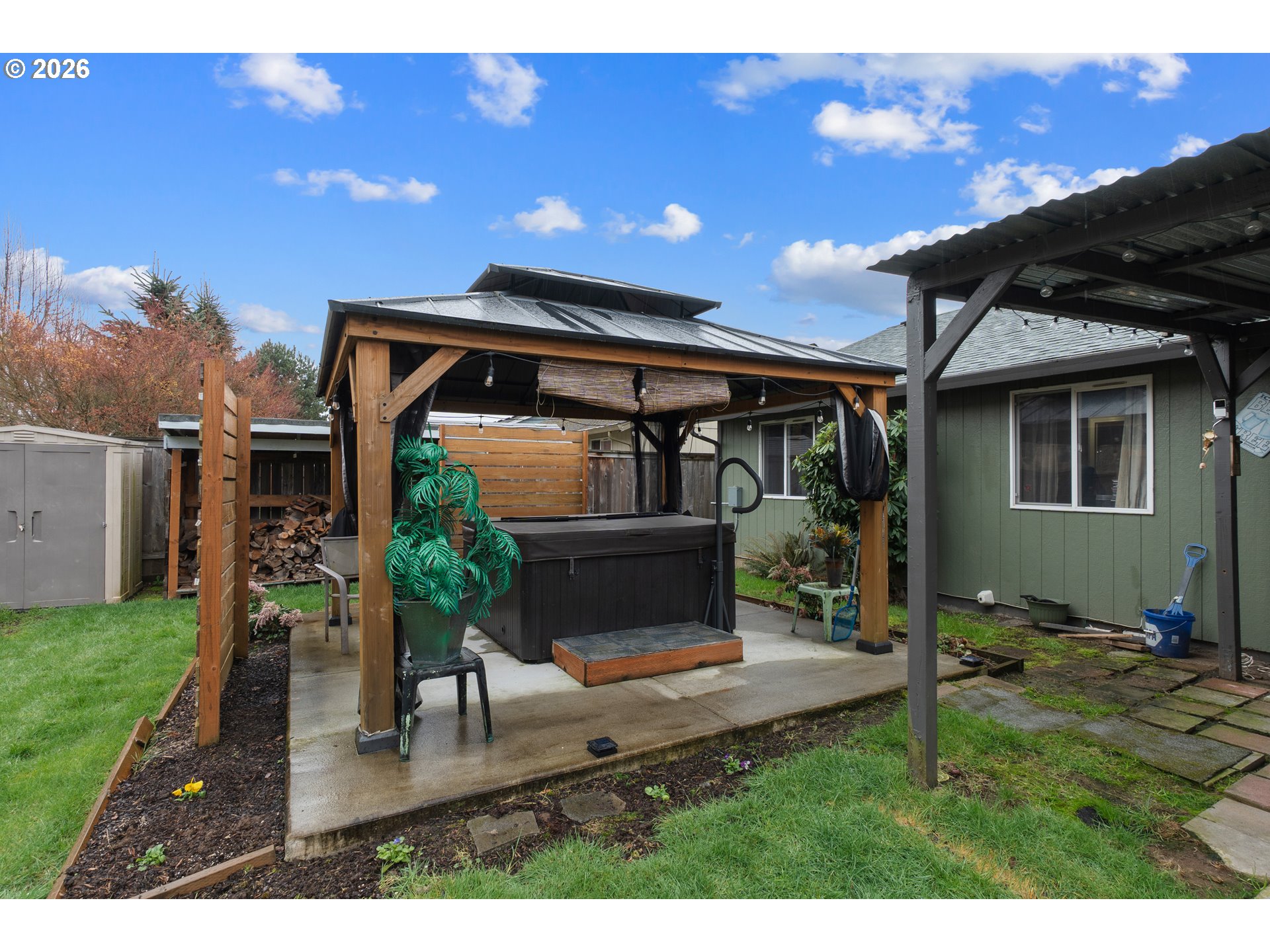 Remodeled Single-Level Home. 30 year roof with transferrable warranty. Many updates including exterior and interior paint, garage door, screens, interior doors and fixtures. Added efficient mini-splits. Remodeled kitchen with (very) upscale appliances. Top-of-the-line fridge. Convection double oven. Stainless steel farmers sink. Dining area with slider to backyard. Three bedrooms and two full baths. Owners suite with double closets. Huge covered patio to enjoy the fenced yard year-round. Gazebo covered hot-tub (stays), firepit, and shed. Click the virtual tour link for a 3D home tour and floorplan.