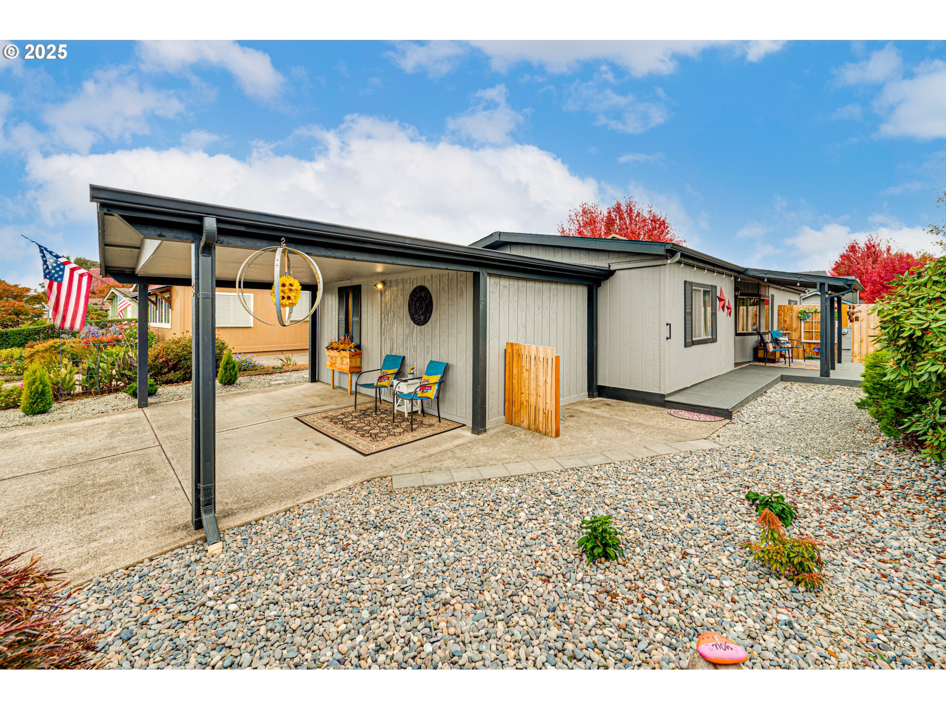 Price Reduction! Charming 2-bedroom, 2-bath home located in a well-maintained 55+ community. Features new LVP flooring throughout and a primary suite with a spacious walk-in closet. The carport has been converted into a functional storage shed. Enjoy a hardscaped yard with a backyard garden featuring blueberry and raspberry bushes. Conveniently located by shopping and grocery stores. Mini-split system provides efficient heating and cooling. All appliances stay—including refrigerator, washer, and dryer. Newer roof adds peace of mind.Community amenities include a clubhouse that hosts events and weekly activities. Lot space fee covers water and sewer, road maintenance, off-street driveway parking for each unit, storm drainage, pruning of park trees, park fence maintenance, and landscaping around the clubhouse.