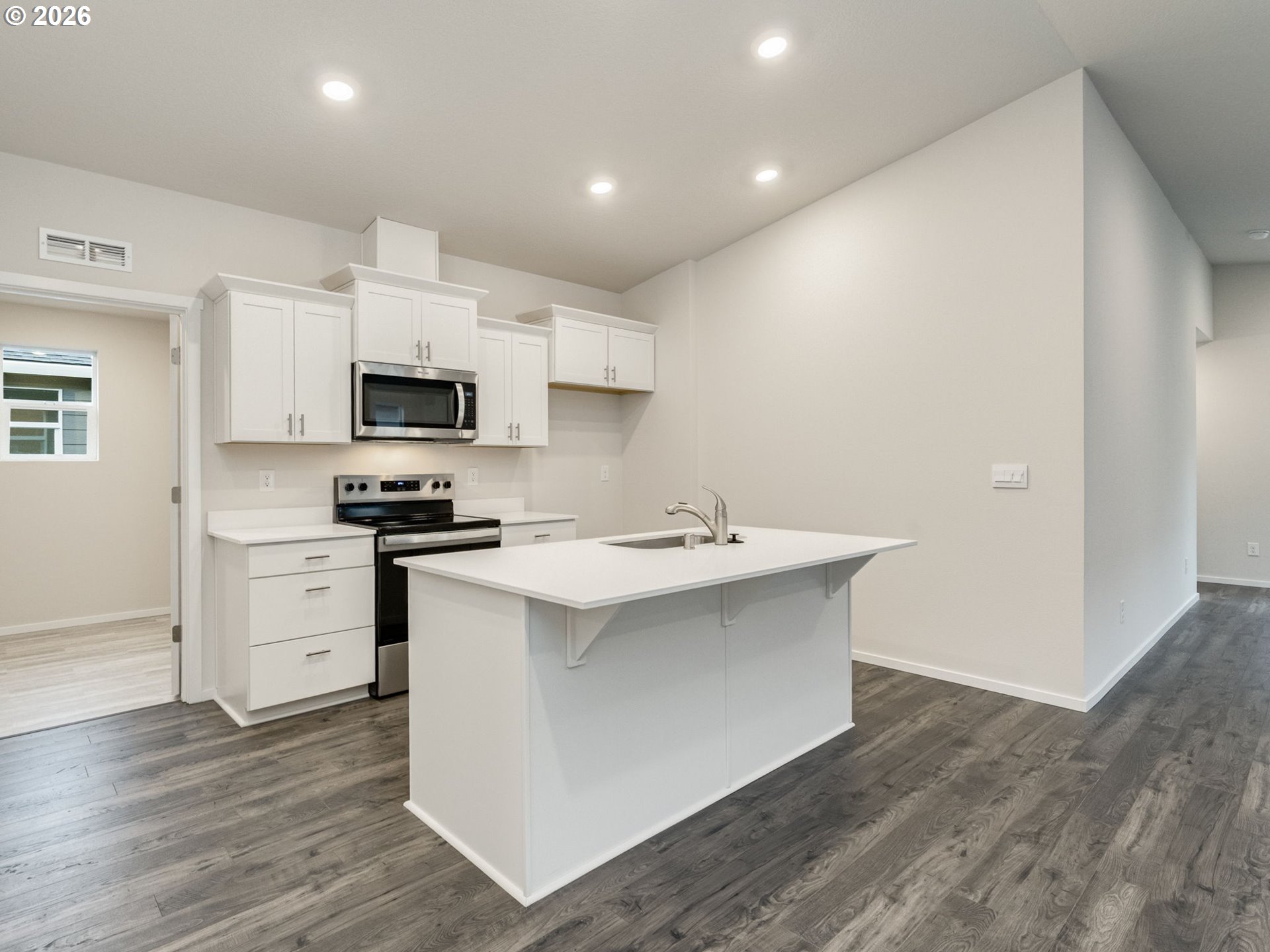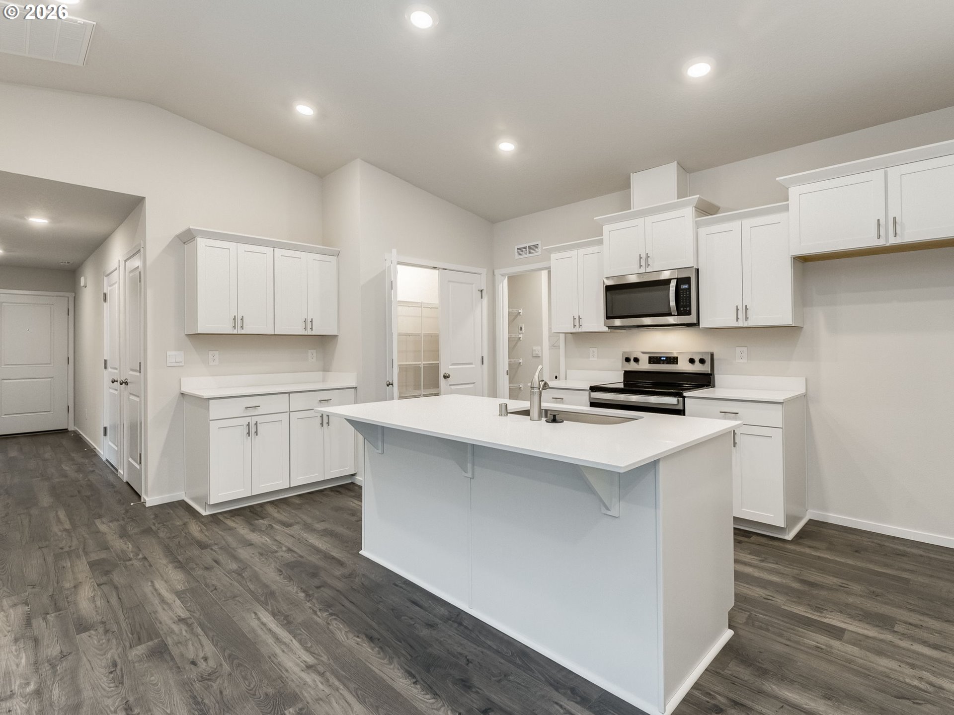 Dishwasher, Disposal, FreeStandingRange, Island, Microwave, Pantry, PlumbedForIceMaker, Quartz, StainlessSte