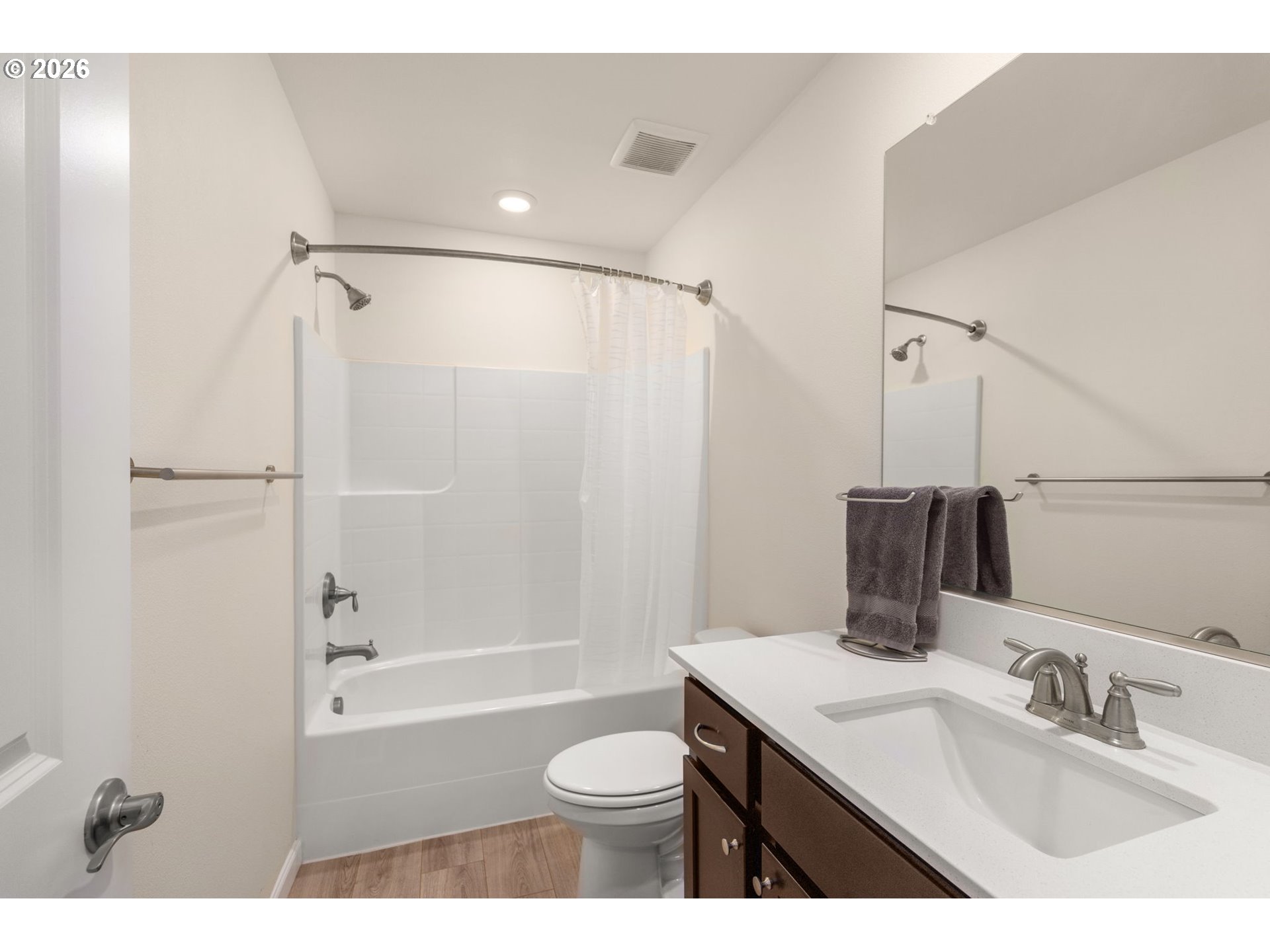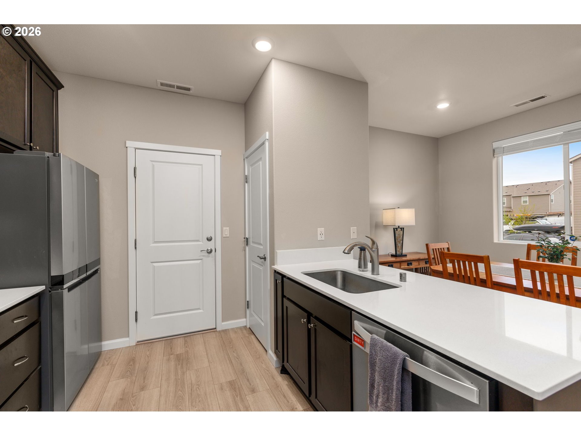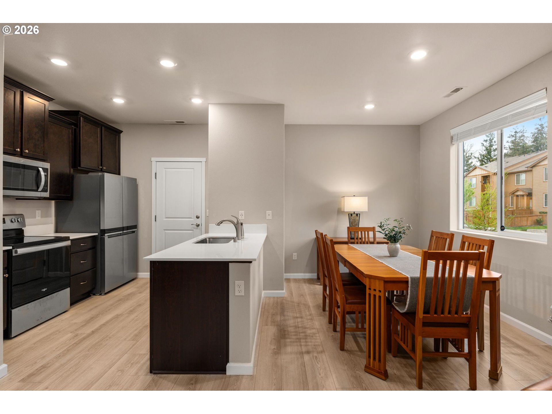 Rare end-unit! Light filled and move in ready with an open concept layout, luxury vinyl plank flooring, and a stylish kitchen featuring stainless steel Whirlpool appliances, quartz countertops and pantry for ample storage. The spacious great room and dining area make for an ideal space for entertaining, plus a convenient half bath on the main floor.Upstairs offers a versatile loft, convenient laundry, and a primary suite with a luxury shower and private balcony hard to find in newer construction. Along with two additional bedrooms and full bath.2-car garage + driveway parking + lots of street parking. Low HOA. Close to parks, walking paths, shopping, dining, and under 10 minutes to I-205. Don’t miss this one!
