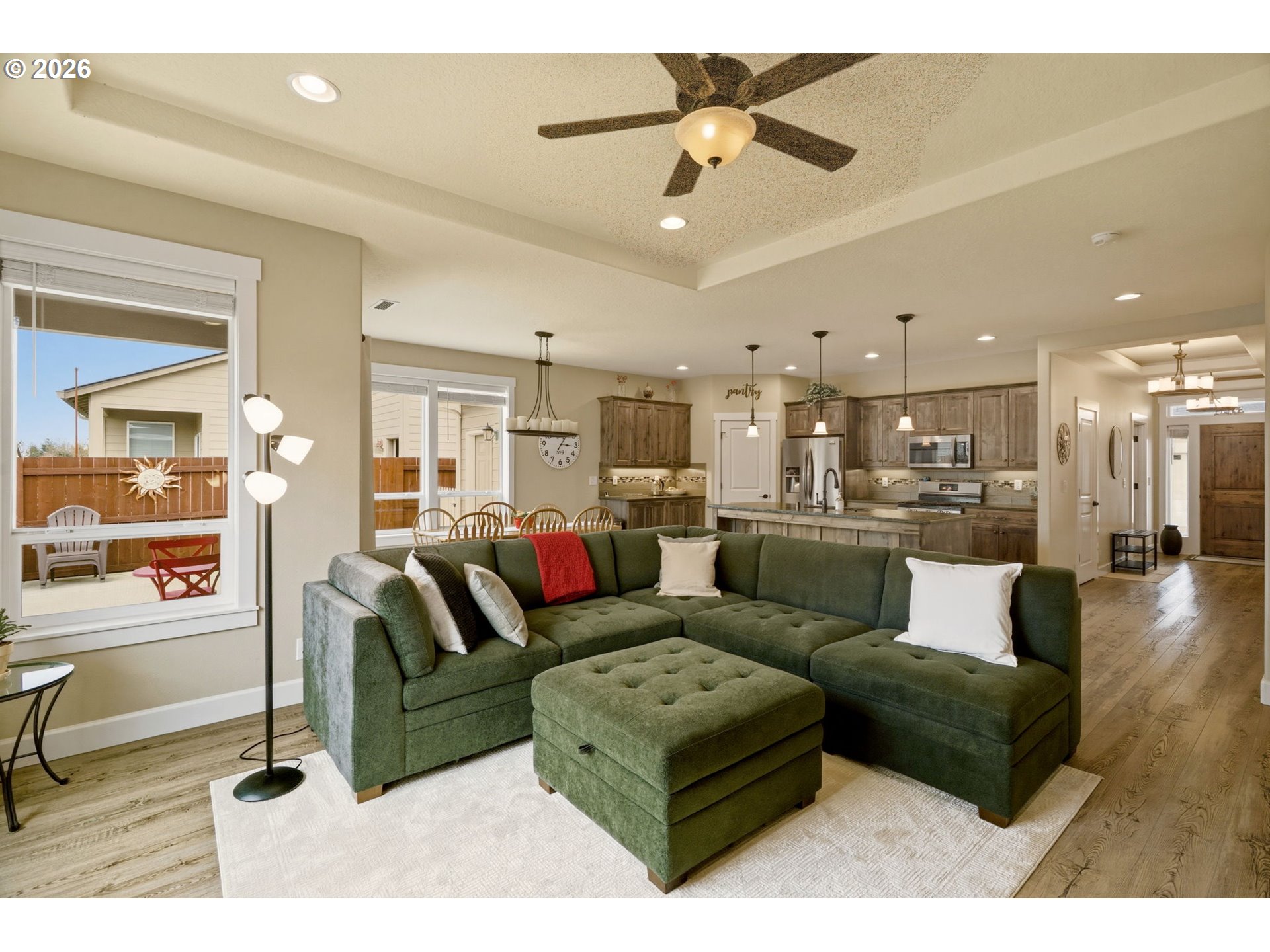 Charming 3BR/2BA home in Battle Ground's sought-after Daybreak neighborhood, just steps from Daybreak Primary & Middle Schools. This move-in ready residence features a chef’s kitchen with a 5-burner gas convection oven, built-in microwave, dedicated pantry, and elegant under-counter lighting. All appliances stay! Stay cozy with a gas fireplace featuring a heat blower for efficient warmth.The extra-deep garage provides the perfect space for a dedicated workshop, home gym, or additional storage. The outdoor oasis is perfect for summer, boasting a large back patio, established fruit trees, and berry bushes. A full sprinkler system ensures easy maintenance year-round. This home perfectly balances modern efficiency with Pacific Northwest charm.