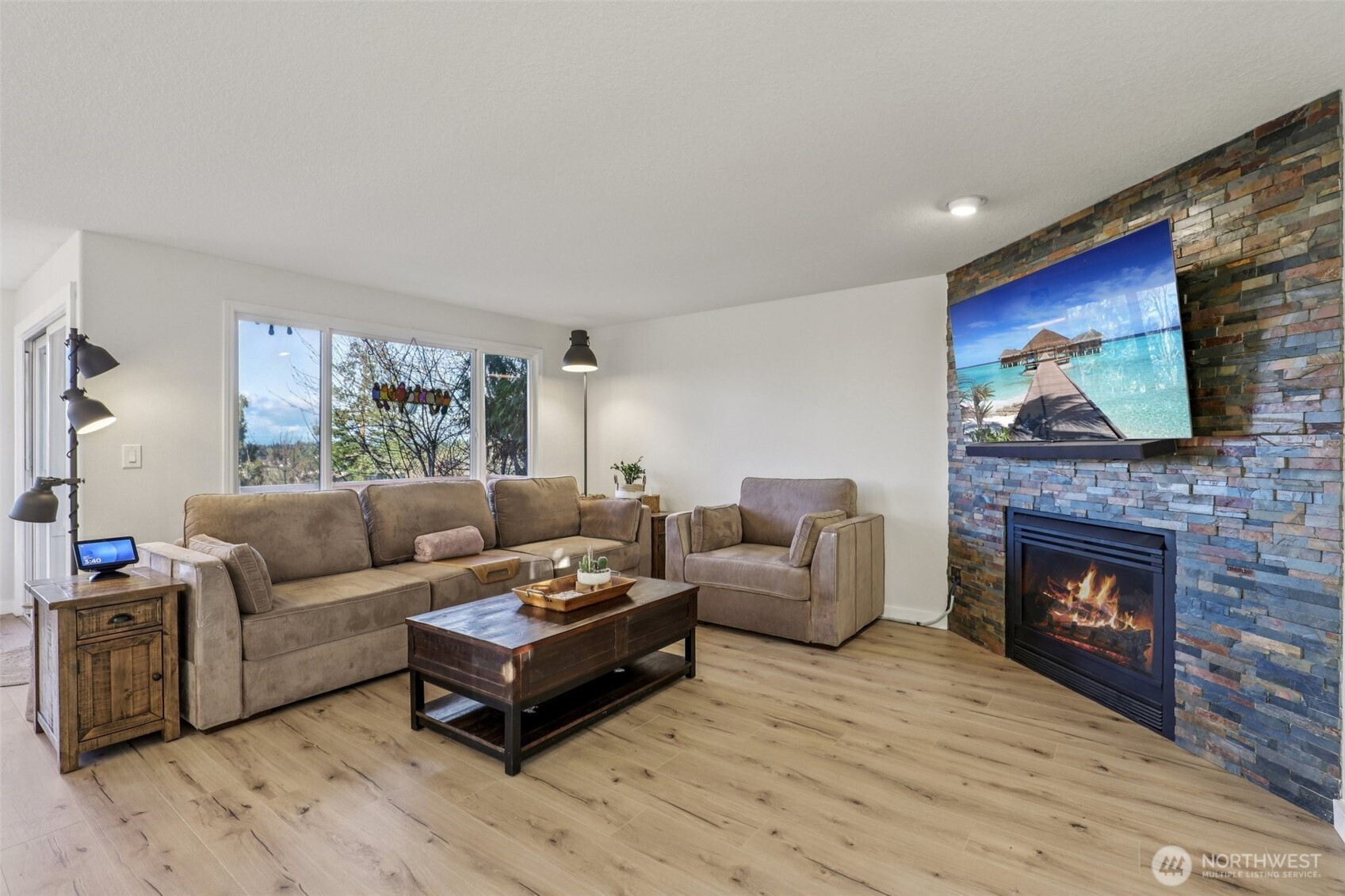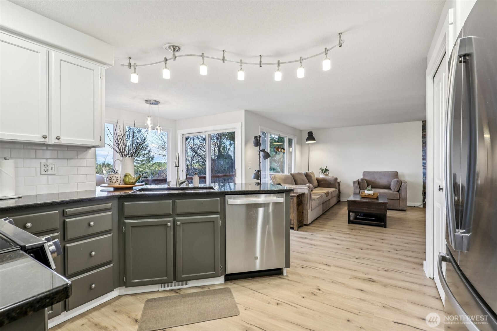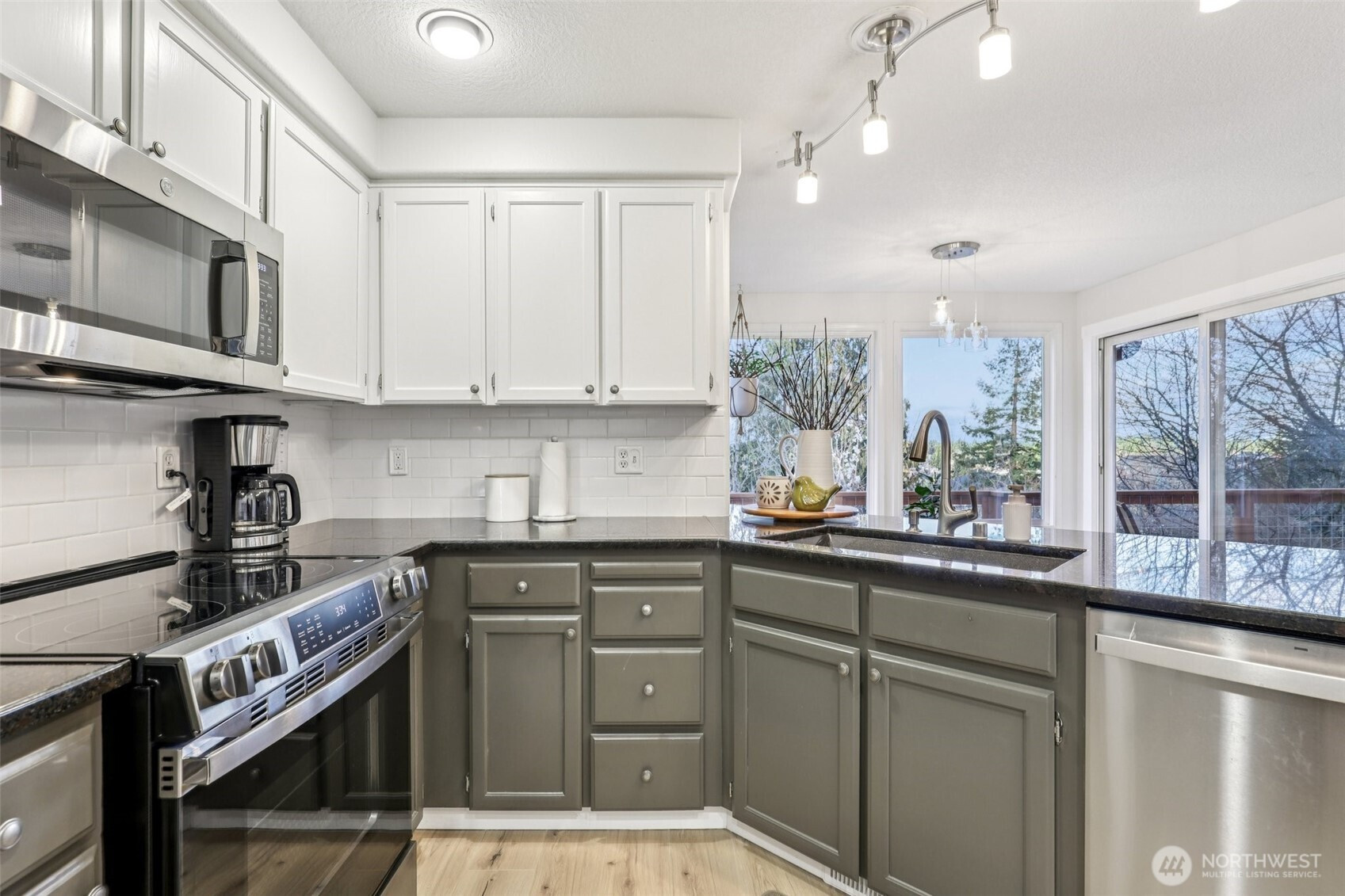 Must-See Home beautifully updated w/ a spacious open floor plan. The the kitchen shines with freshly painted cabinets, granite countertops, new tile backsplash, New SS Appl that all opens seamlessly to the GR & dining nook, w/ a door leading to a new wrap-around deck—perfect for relaxing or entertaining while taking in the views. Upstairs, the large prim ste features a WI closet w/ organizer, updated prim bath w/ double vanity, & a private slider to the deck. 2 additional bdrms & a bath complete the upper level. Recent updates include flooring, interior paint & exterior trim paint, interior doors, railing, trim, & Stone FP surround. Enjoy the covered front porch, 2-car garage, & a peaceful setting that truly feels like home.