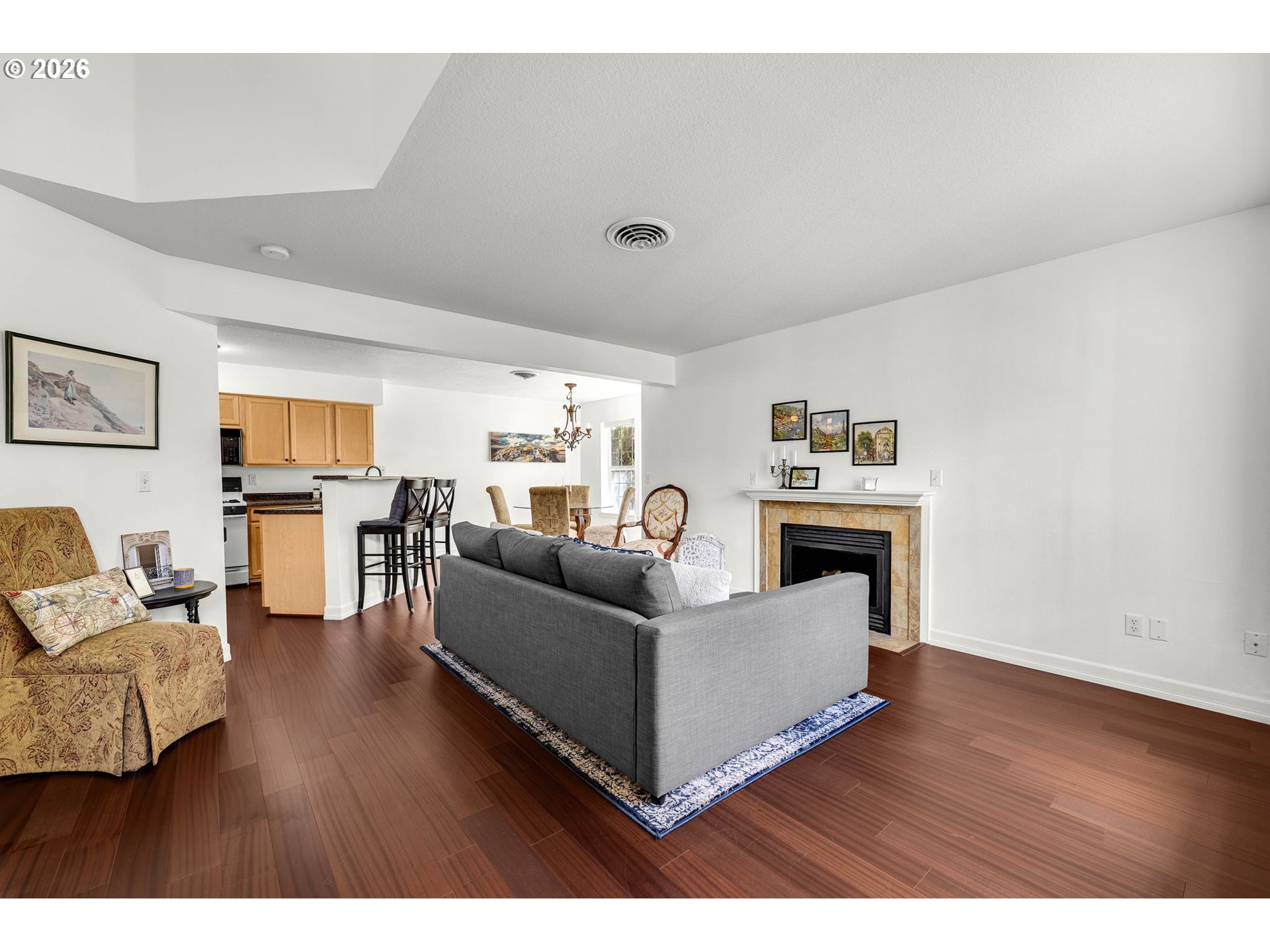Welcome to this secluded corner-lot gem, where comfort meets effortless style. The open-concept main floor is anchored by a cozy gas fireplace and a thoughtfully designed kitchen featuring solid surface countertops and a breakfast bar. Natural light fills the dining area, which opens directly to your own private patio—perfect for morning coffee. Upstairs, you’ll find a peaceful retreat with three spacious bedrooms and two full baths. The bedroom-level laundry adds a layer of modern convenience that makes daily life just a bit easier. This home is thoughtfully maintained and move-in ready—all it needs is you! HOA includes water, sewer, landscaping, exterior maintenance and more.