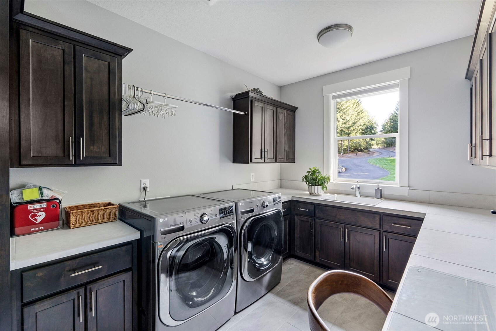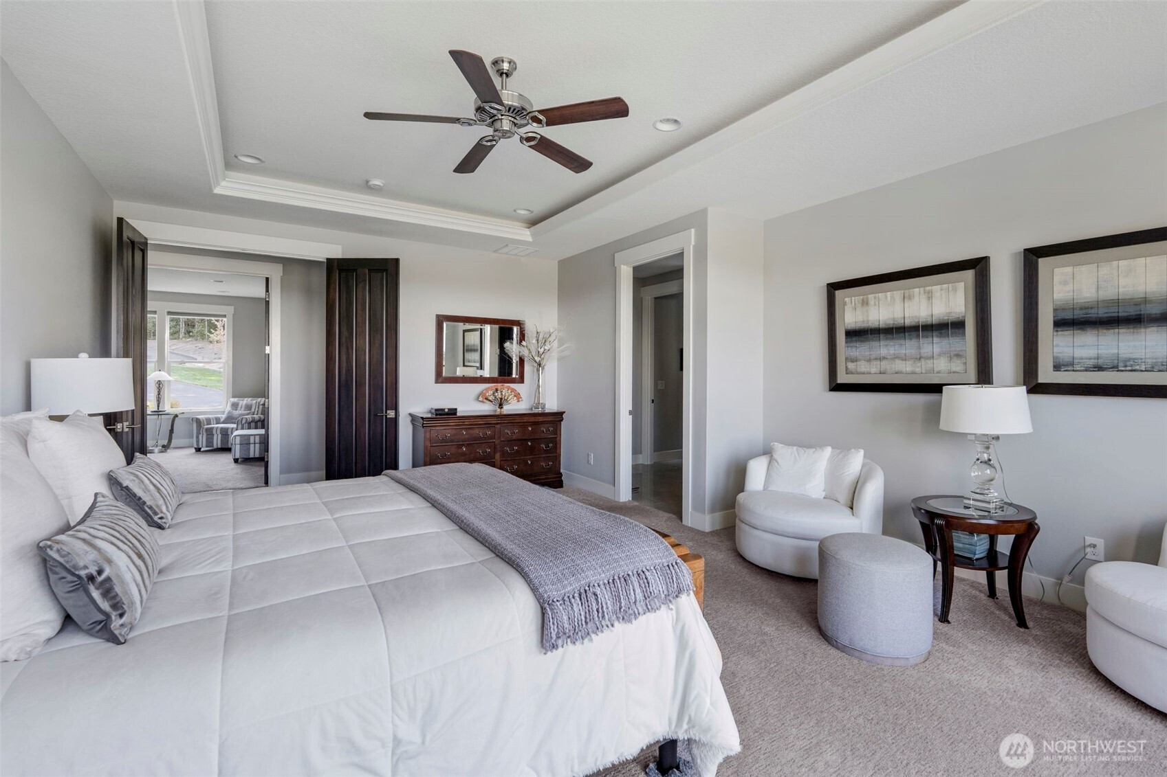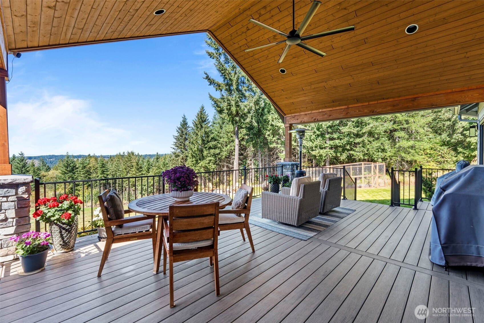 This one-level home nestled in a gated community on 10 acres has sweeping mountain and sunset views. Soaring vaulted great room, spacious chef’s kitchen with second sink offer refined spaces for entertaining. Walk-in pantry includes counter for additional workspace/storage. Each bedroom has own walk-in closet. Elegant primary suite boasts tray ceilings, spa-inspired bath, and dream-worthy walk-in closet/dressing room. The house has 8ft doors, elegant study, large laundry room with built-in desk and storage, and separate mud room. Enjoy the covered deck, fully irrigated lawn, fire pit, fenced garden, whole-house water filtration, tankless hot water, and generator. Over-sized 3-car garage includes pull down ladder to attic for extra storage.