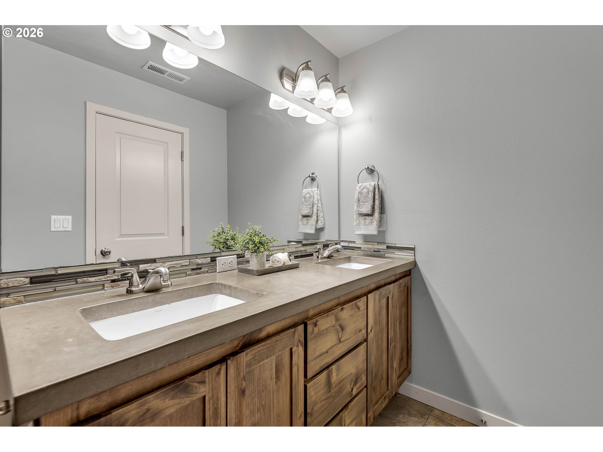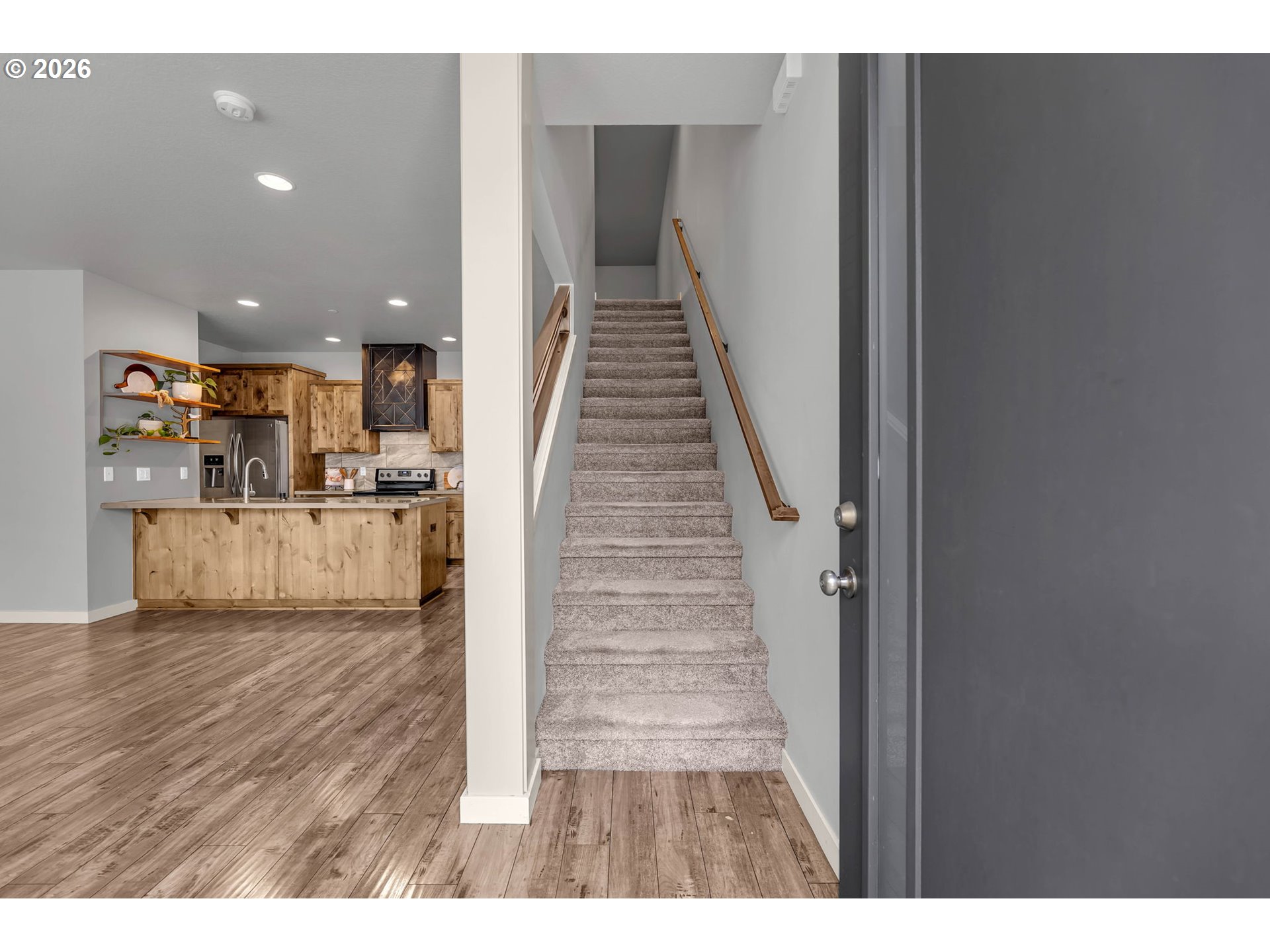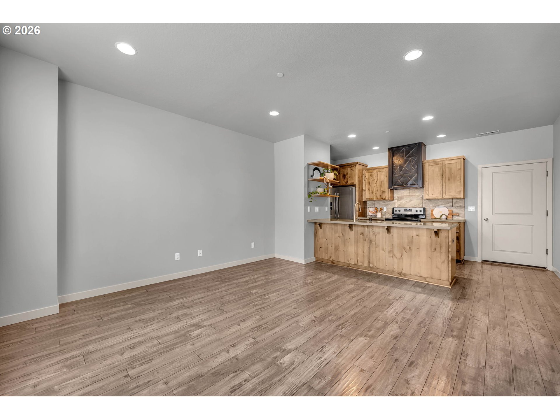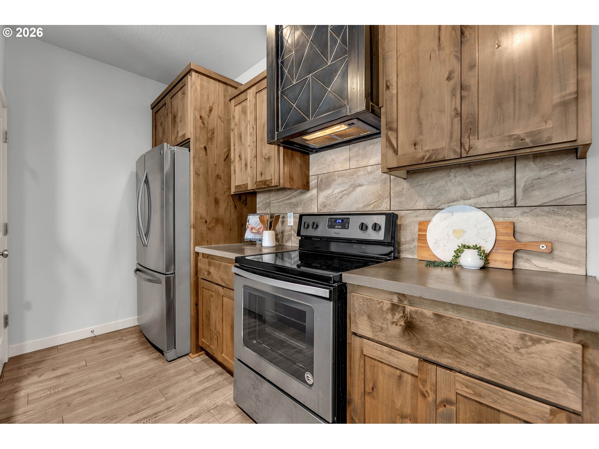 Low-maintenance living in the heart of Ridgefield. This modern home's front yard features hassle-free astro-turf maintained by the HOA, giving you more time to enjoy the vibrant surrounding community. Inside, the main level offers a functional floor plan that seamlessly connects the great room, powder bath, and a modern kitchen. Designed for everyday living and entertaining, the kitchen is beautifully appointed with sleek concrete countertops, an eating bar, a dedicated pantry, and premium stainless-steel appliances, including the refrigerator. Upstairs, a spacious loft area provides the perfect setup for a home office, media room, or play area. The vaulted primary suite serves as a relaxing private retreat, complete with a generous walk-in closet and an en-suite bathroom featuring a tiled walk-in shower and dual vanity. The upper level is rounded out by two additional bedrooms, a full guest bathroom, and laundry room with the washer and dryer included. The attached two-car garage is easily accessed via the rear alley, providing off-street parking. Beyond the home, an unbeatable lifestyle awaits. Just one street away, Pioneer Picnic Park offers overflow parking, a playground, and covered picnic tables. Other nearby parks include Rose Homestead Park and its full basketball court. City of Ridgefield has numerous parks and a waterfront development providing multi-use trails. When you are ready to explore further, you are just minutes from the bustling hubs of Pioneer Village and Discovery Ridge, home to local coffee shops, ice cream parlors, restaurants, and retail stores. Finally, you can soak in the historic charm of Downtown Ridgefield, known for its unique boutiques, delightful eateries, and popular seasonal small-town events.