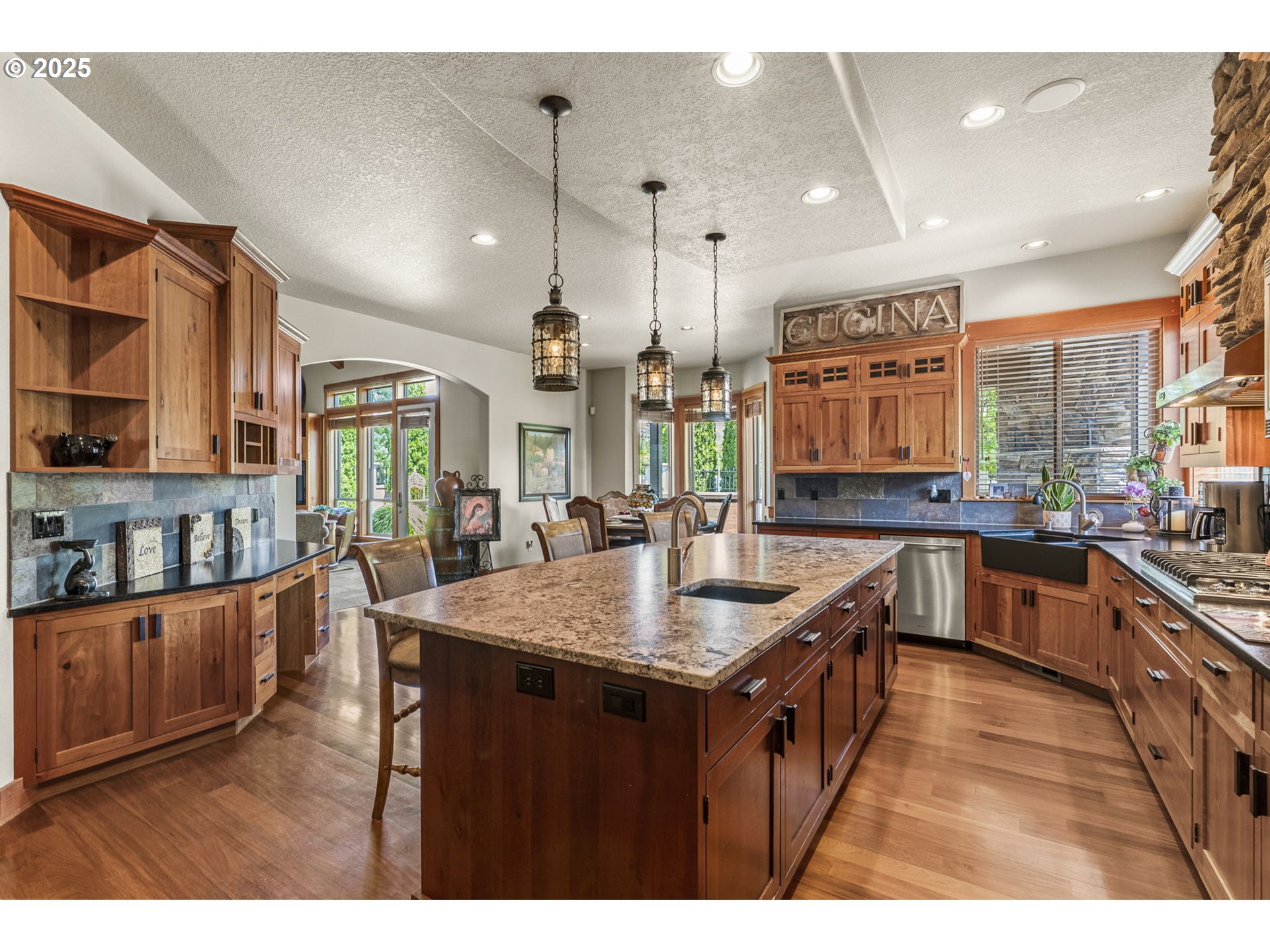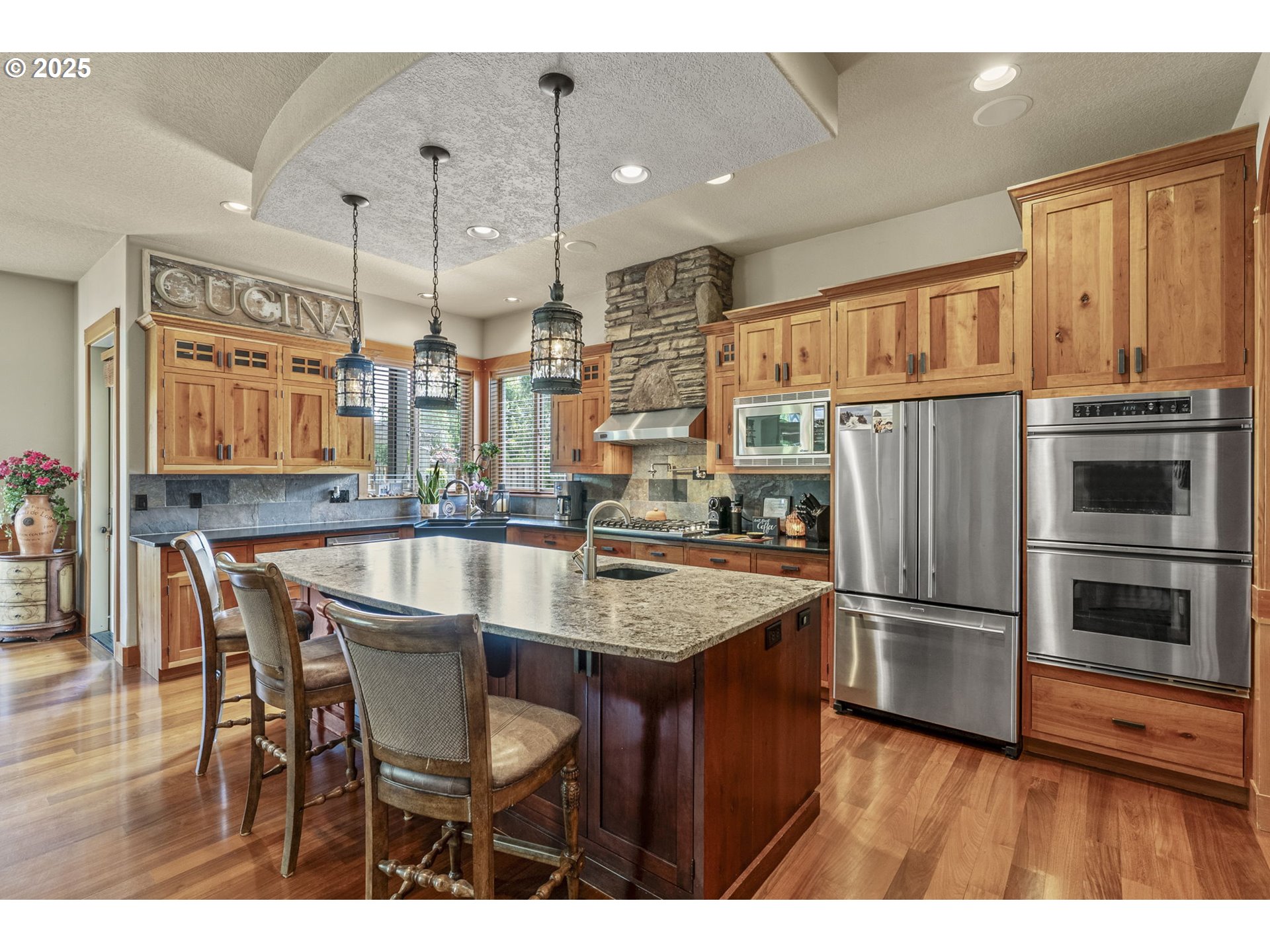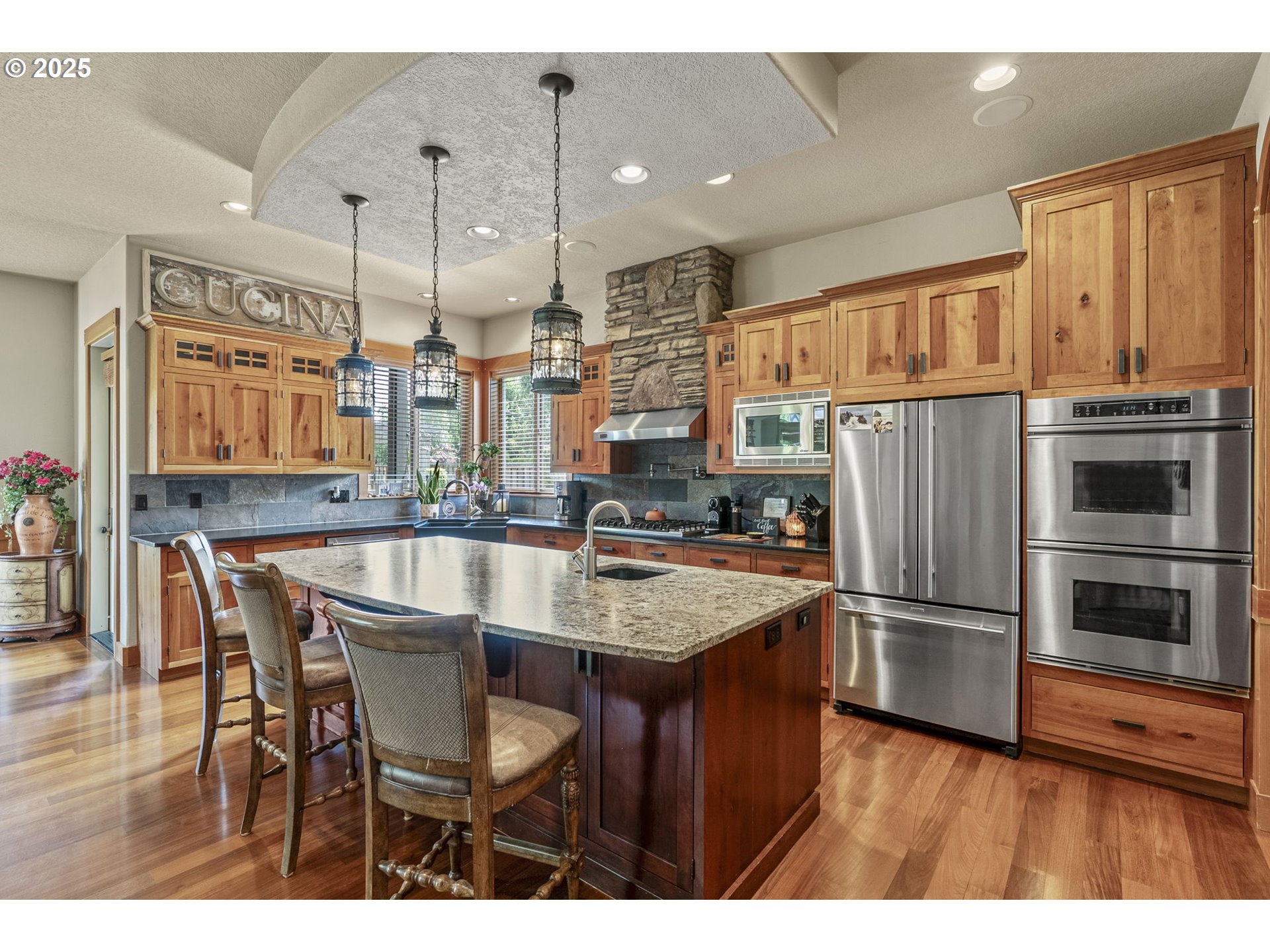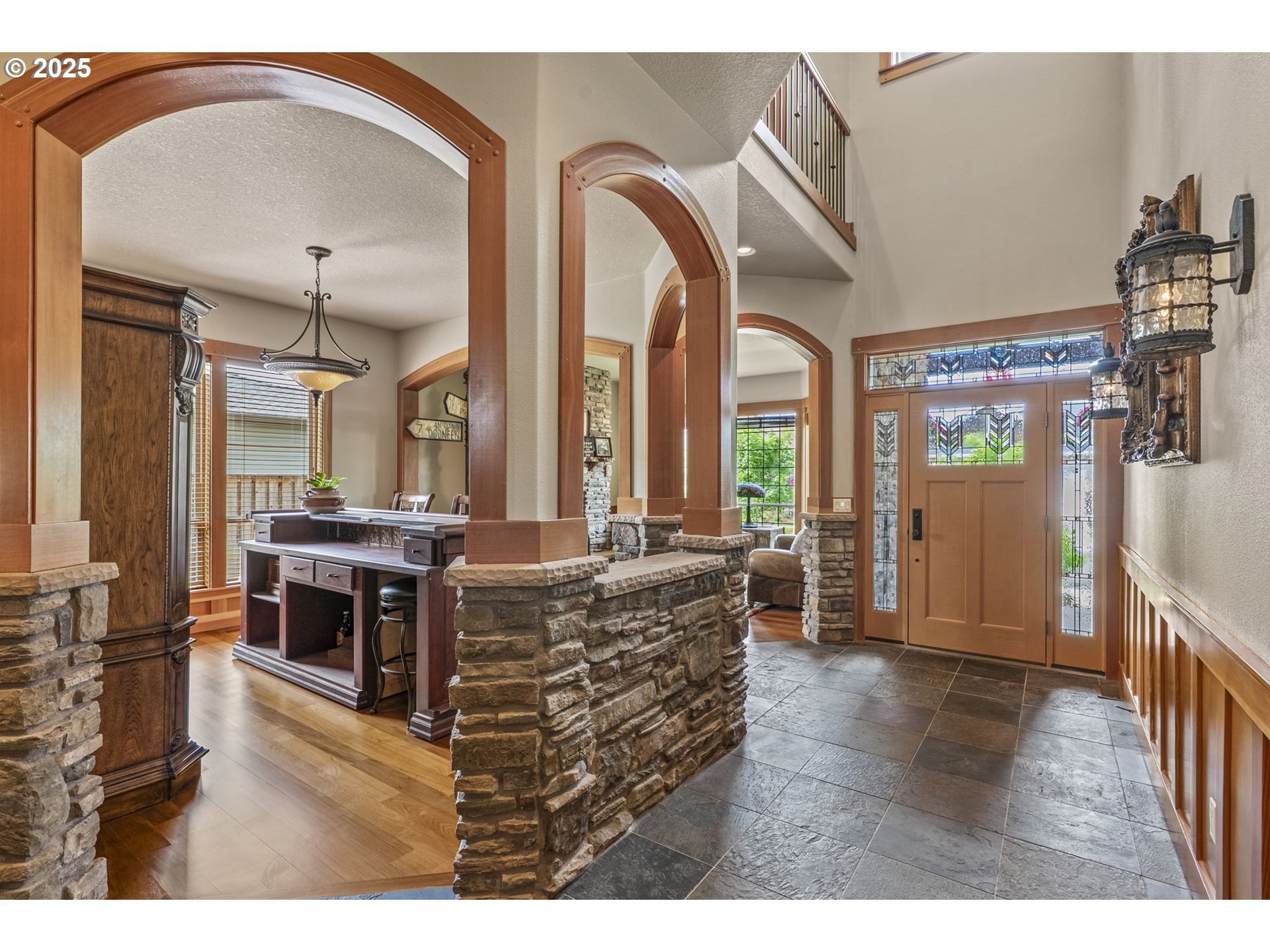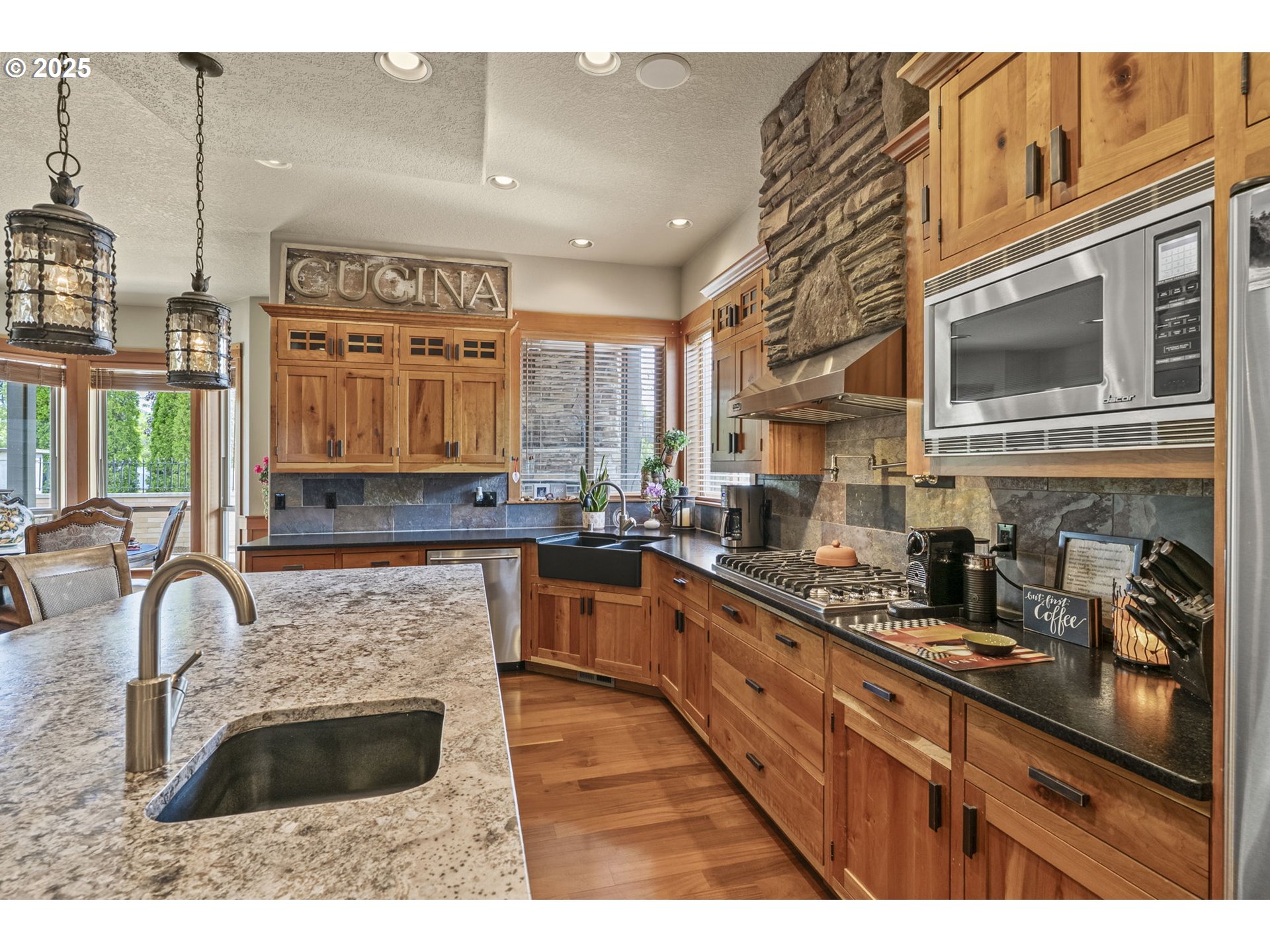 (503) 893-8874From the moment you drive up, you'll find this gorgeous, quality built, unique home w/unexpected charm & special details that is like no other in the neighborhood. Luxurious & rich w/soaring ceilings, beautiful fixtures, 2 fireplaces, stone walls, wood floors, iron railing, arched details & grand wood beams! Open concept yet large, defined spaces. Designer kitchen w/honed granite, butler's pantry, walk-in pantry, stone workstation & hood surround, farm sink, double ovens & pot filler. Spacious primary w/vaults, free-standing stove, private balcony, custom closet, walk-in shower, soaking tub w/Mt St Helens view! Deluxe oversized garage, stunning landscaping w/concrete walkways, in-ground hot tub/spa, outdoor kitchen, grill & 3rd fireplace!