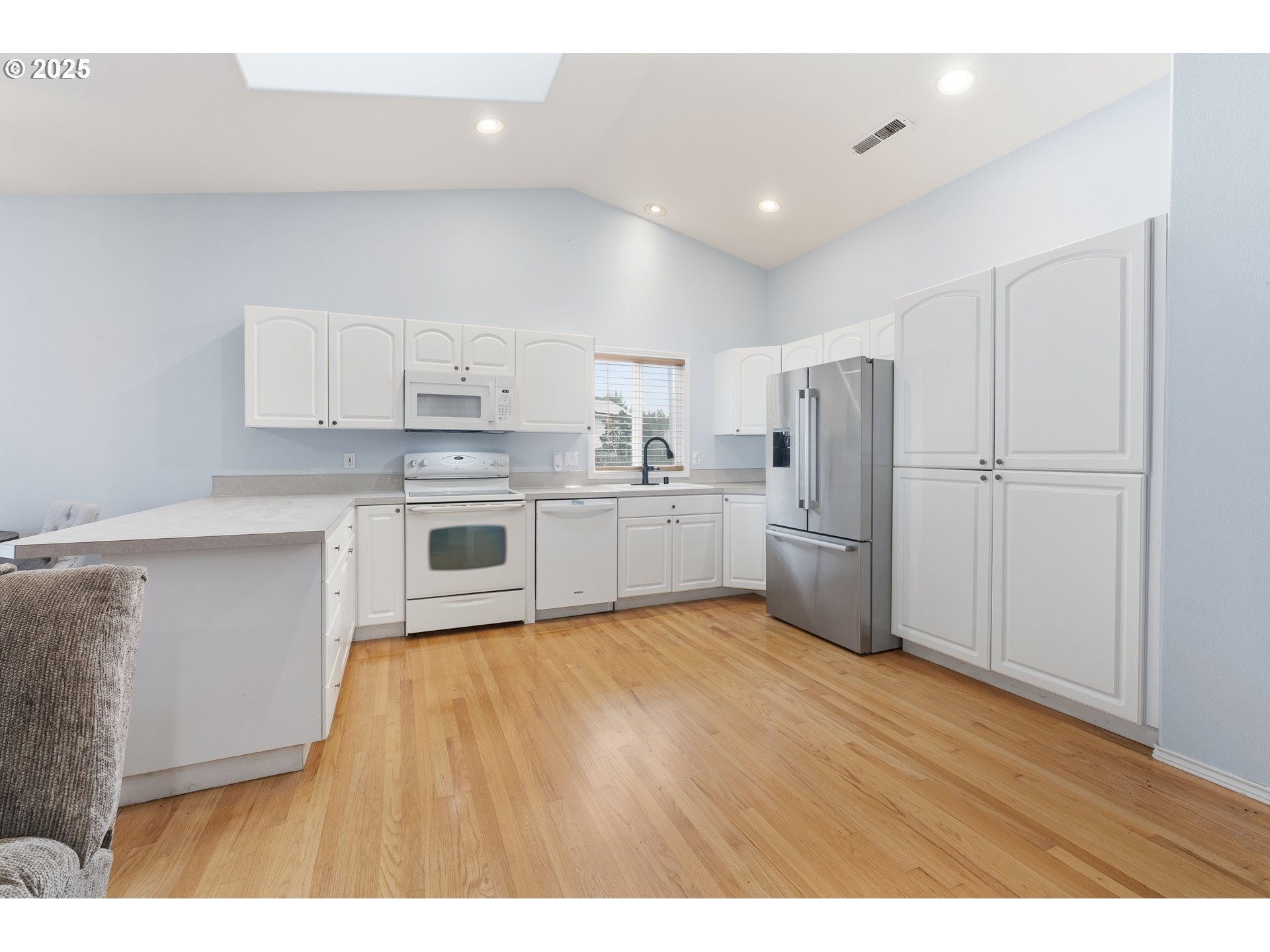 Open Sunday 12-2. Spacious one-level home with vaulted ceilings throughout and easy-care landscaping. This well-maintained property offers a bright and open great room floor plan, anchored by a cozy fireplace—perfect for entertaining or relaxing evenings at home. The large kitchen features an abundance of cabinetry, ideal for cooking, hosting, or everyday living. Skylights were replaced when the roof was replaced 3years ago, enhancing the natural light throughout the home.Major systems have been thoughtfully updated, including a roof approximately 3 years old, A/C approximately 3 years old, a landscape sprinkler system installed 3 years ago, and a hot water heater replaced in 2015. Additional features include storage above the garage and a convenient laundry room with a door leading to the garage.The hot tub and refrigerator are included. Ideally situated directly across from a vibrant community park offering a playground, basketball courts, and walking paths, this home combines comfort, convenience, and a prime location.
