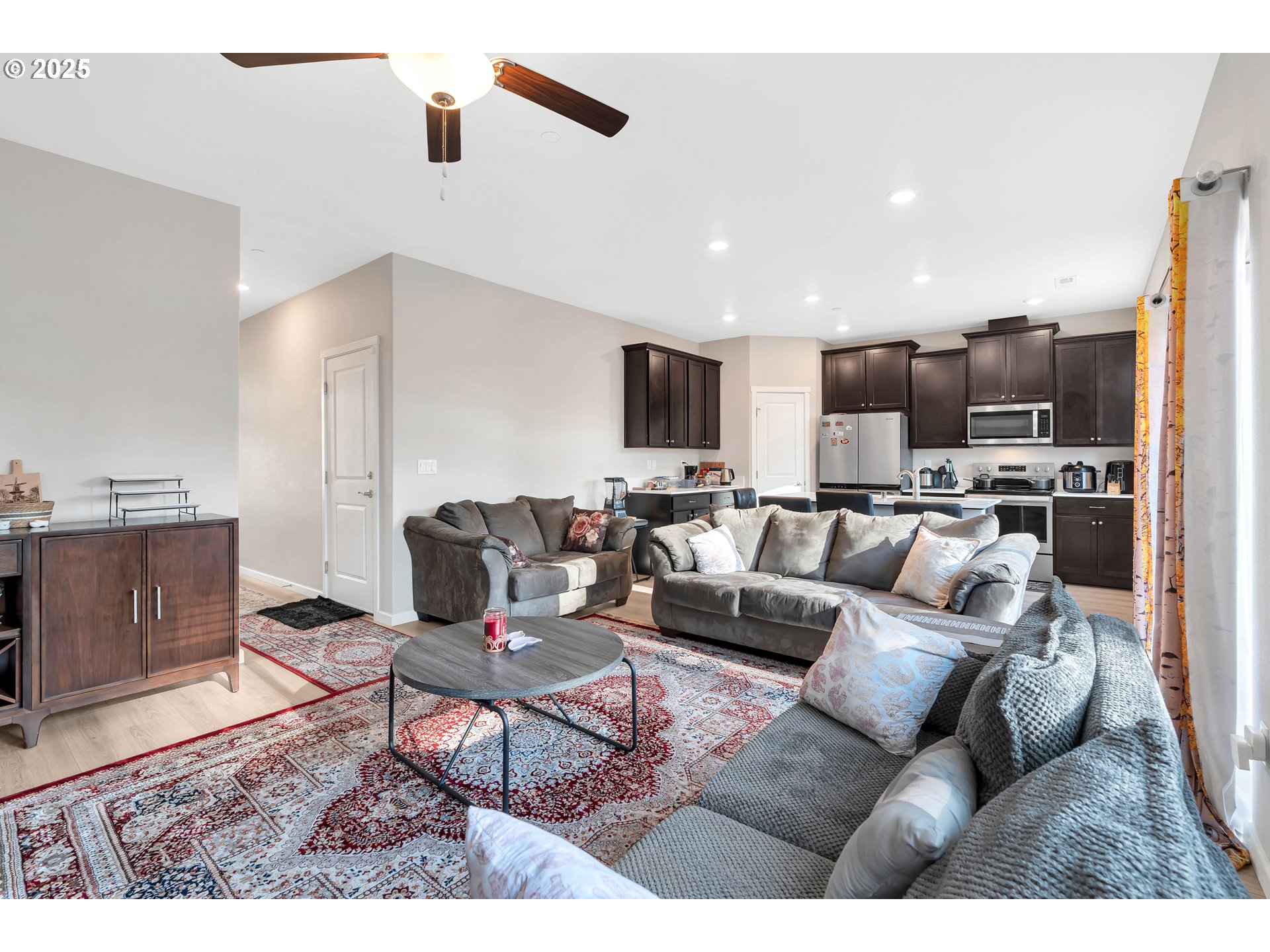 This stunning new townhome offers 3 bedrooms, 2.5 baths, an attached 2-car garage, and an abundance of storage space. Step into the spacious foyer featuring a large coat closet, leading into an inviting open-concept layout that connects the upgraded kitchen, dining area, and living room.The beautifully updated kitchen boasts quartz counters, all new appliances, a walk-in pantry, and a large island with a sink. LVP flooring enhances the common areas, while wall-to-wall carpet adds comfort to all bedrooms. The living room includes a ceiling fan and sliding doors opening to the backyard, perfect for indoor-outdoor flow.Upstairs, the oversized laundry room adds exceptional convenience. The primary bedroom features an ensuite bath, a ceiling fan, and thoughtful finishes throughout. Additional upgrades include window blinds, automatic garage door openers, and more—making this home truly move-in ready with high-end modern touches.